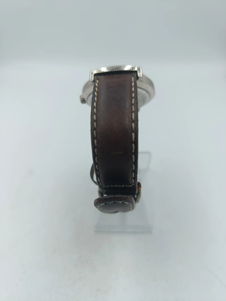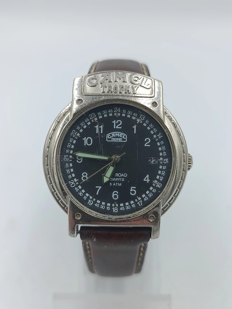 Robuste Herrenarmbanduhr im markanten Camel-Trophy-Stil. Das schwarze Zifferblatt mit gut ablesbaren arabischen Zahlen und Leuchtzeigern sorgt für optimale Übersicht, auch bei schlechten Lichtverhältnissen. Das stabile Metallgehäuse mit charakteristischem Camel-Trophy-Schriftzug verleiht der Uhr einen sportlich-maskulinen Look. Das braune Lederarmband rundet das Design ab und bietet angenehmen Tragekomfort – ideal für Alltag und Freizeit. Details Artikelnummer: FEM1237 Marke: Camel Trophy Uhrwerk: Quarz Gehäuse: Metall, silberfarben Armband: Braun, Leder Zifferblatt: Schwarz mit arabischen Zahlen und Leuchtzeigern Wasserdichtigkeit: 5 ATM Gesamtlänge: 23 cm Gewicht: 49,3 g Besondere Merkmale Markantes Camel-Trophy-Design Gut ablesbares Zifferblatt mit Leuchtelementen Robustes Metallgehäuse Sportlich-maskuliner Look Angenehmer Tragekomfort durch Lederarmband