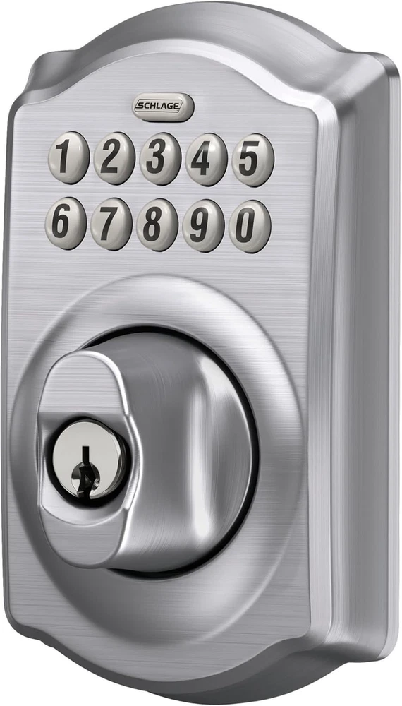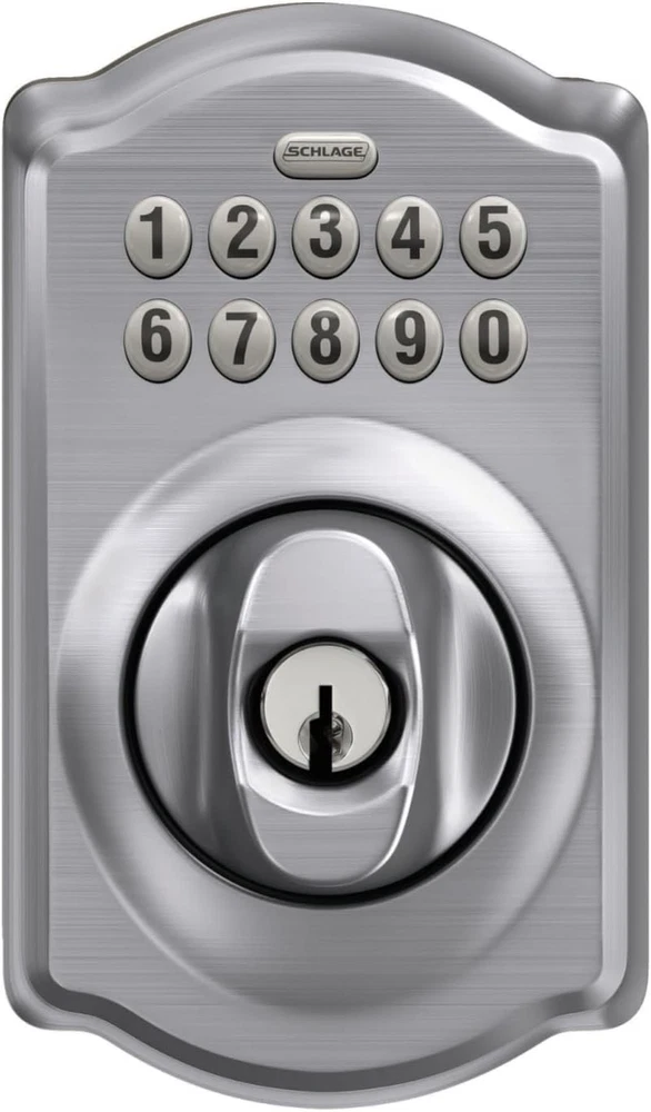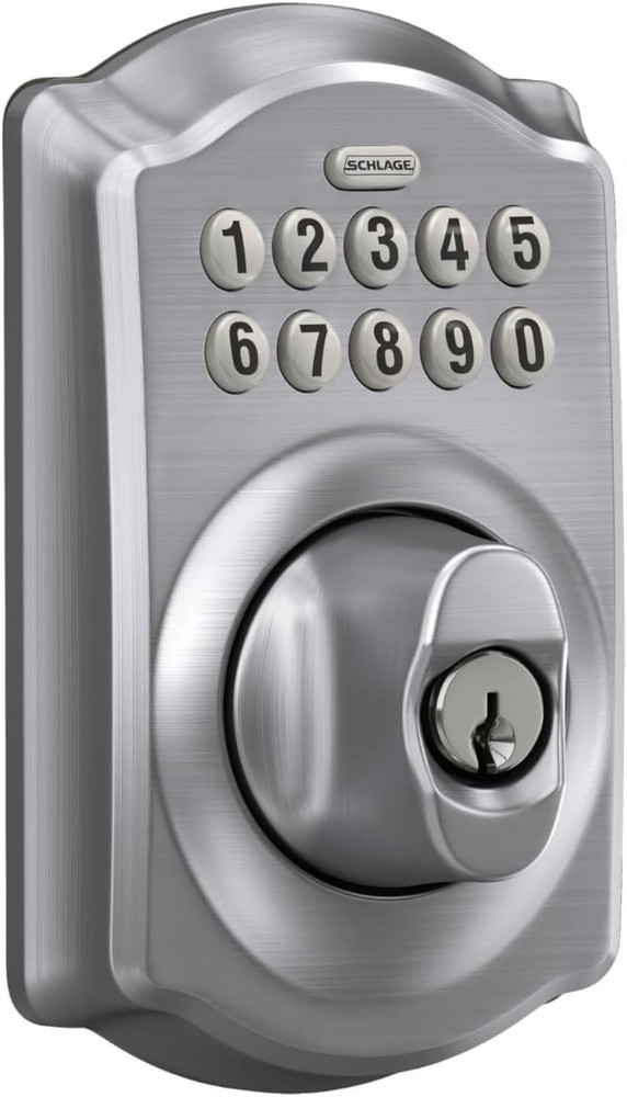 Free eBay listing template designed by dewiso.com Camelot Keypad Deadbolt, Electronic Keyless Entry Lock, Satin Chrome FREE AND FAST SHIPPING! About this item KEYLESS CONVENIENCE: Use 2 pre-programmed codes for easy setup out of the box; assign up to 19 codes for trusted friends and family to experience convenient, keyless security.Control method:Application.Note: Measure your door's backset, cross bore and thickness to ensure you find the right fit.Note: Measure your door's backset, cross bore and thickness to ensure you find the right fit. PREMIUM SECURITY: High-quality metal construction provides strength where it counts; Grade 2/AAA rating offers trusted security and durability for residential and light commercial applications BATTERY POWERED FOR RELIABLITY: Deadbolt operates with included 9V battery; avoid lockouts with dedicated low-battery indicator; get up to 2 years of battery life with typical use SECURE KEYPAD ACCESS: Durable, silicone-coated numbers illuminate when pressed making it easy to enter your code in the dark EASY INSTALLATION: Replace an existing deadbolt yourself with no skill required; install in minutes with only a screwdriver and no hardwiring EASY OPERATION: Unlocks from the outside with valid user code and locks by pressing the Schlage button and turning outside thumbturn; locks and unlocks from the inside using the thumbturn TRUSTED WARRANTY: Schlage locks are backed by a limited lifetime mechanical and finish warranty, and a 3-year electronics warranty; see Schlage warranty for full details › Product We offer a 30-Day Return Policy on items which you are not completely satisfied with. You have the option for a full-refund or an exchange of the item. No returns are available on items shipped outside of the US . Shipping We offer Free Shipping to the US and ship within 2 business days of payment, usually sooner. We use UPS express shipping. That's why your products are usually delivered within 3 days . Contact We try our very best to make sure every customer is completely satisfied. If there's a problem , message us! We're happy to help. 24/7 live chat available.