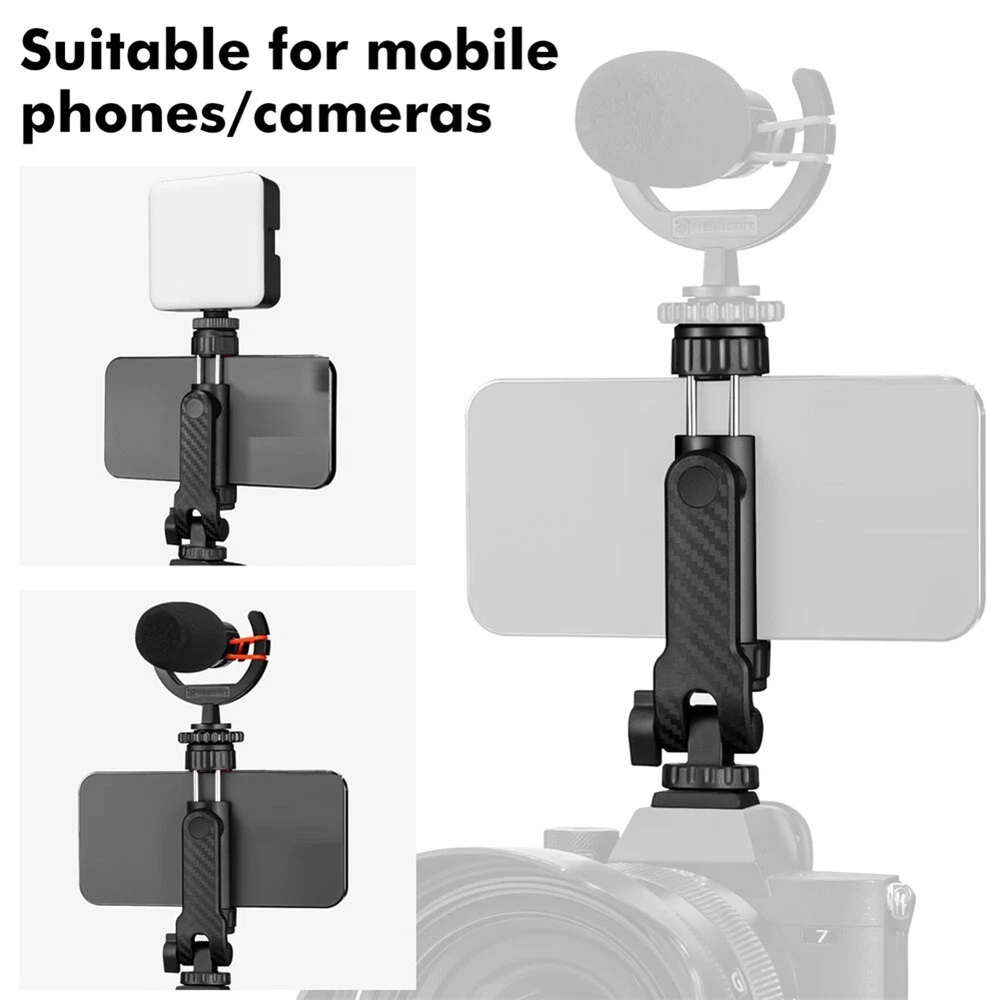 Camera Hot Shoe 360 Rotatable Phone Mount Holder Tripod W Cold Shoe for Mic1436 [Newest Phone Tripod Mount]Cell Phone Mount Tripod design with 360° Rotatable, you can attach extra LED light, microphone or other filming equipment. It helps to record steady videos for , and platforms and live streaming channels. [2 Cold Shoe Mount & 1/4 inch Screw Thread]The mobile phone tripod mount is equipped with two cold shoe mounts, allowing you to attach microphones, photography lights, and other accessories. Additionally, the cold shoe mounts can be easily rotated to adjust the angle of your equipment.Also features a standard 1/4 inch screw hole, making it compatible with tripods, selfie sticks, monopods, cameras, stabilizers, video sliders, ring lights, handle grips, and other accessories. [360° Adjustable Phone Holder] phone tripod adapter has an adjustable angle design,adopts 360° rotation design to support from different angles,allowing you to adjust the pitch angle on a tripod or camera hot shoe without needing a ball . It's more convenient and easy to use. [Quick Release]With the quick to mount smartphone tripod adapter to tedious. You just need to pull the spring, insert the phone and it will be fixed automatically. When you want to the phone, pull the spring clip, which is easy and convenient. Material: plastic colour: black Package Contents: 1 x Phone Mount Holder