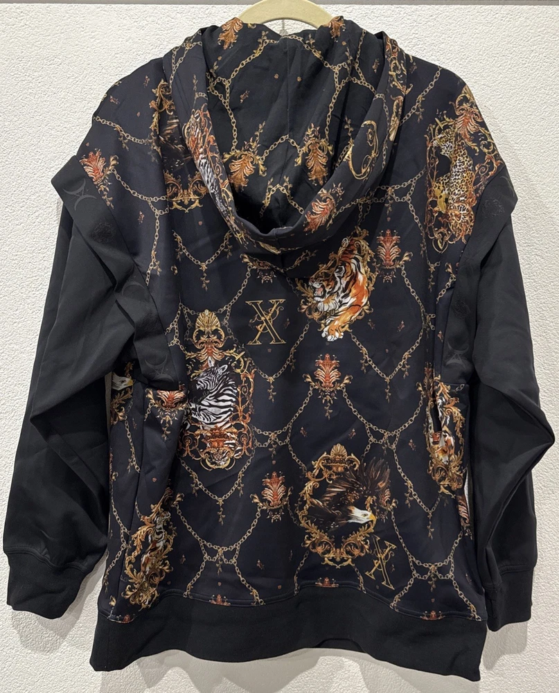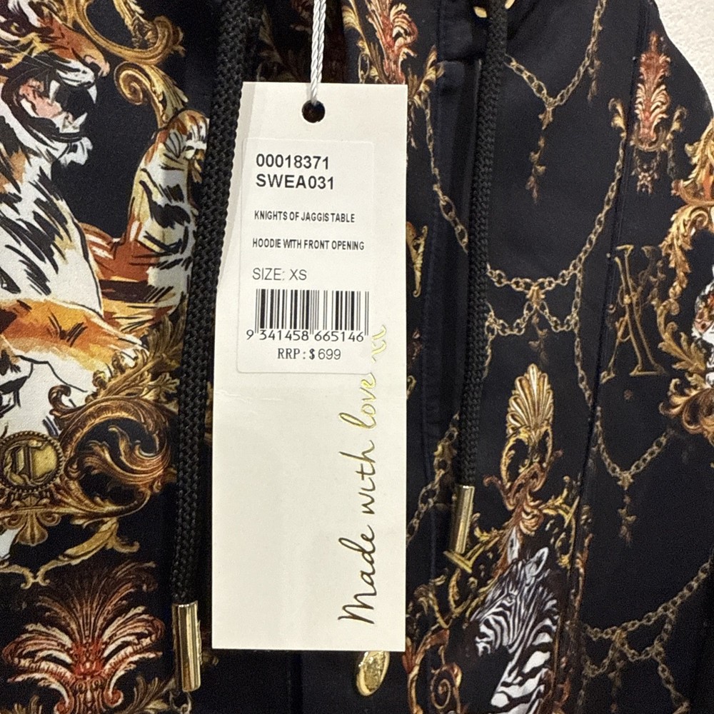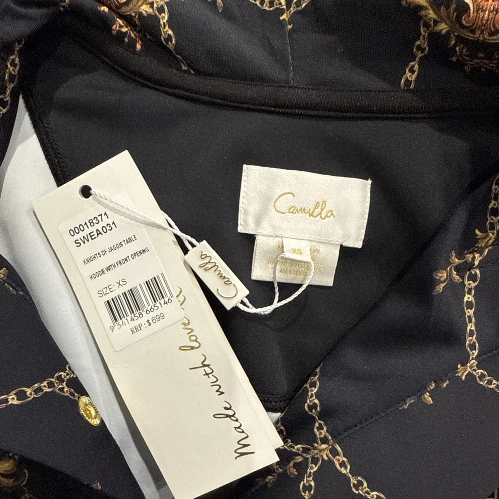 Crafted for comfort and style, the Camilla Men's Black Graphic "Knights of Jaggis Table" Hoodie Sweater is a standout piece for any casual wardrobe. This regular fit, long-sleeved pullover is adorned with a striking multicoloured graphic print, adding a bold touch to the classic black. The polyester blend material ensures both durability and a soft feel against the skin. This hoodie features a lined interior for added warmth, a hood for versatility, and convenient pockets for your essentials. Whether you're out for a coffee or lounging at home, this sweater from Camilla offers a blend of comfort and edgy style.