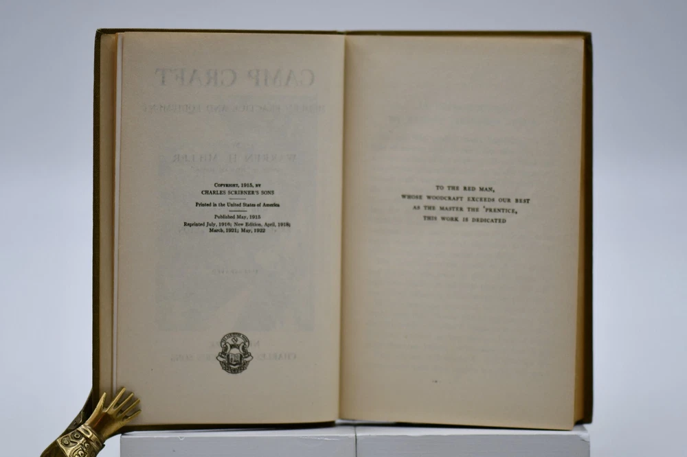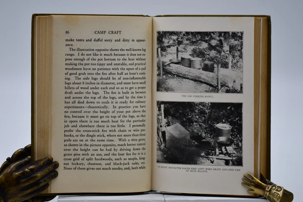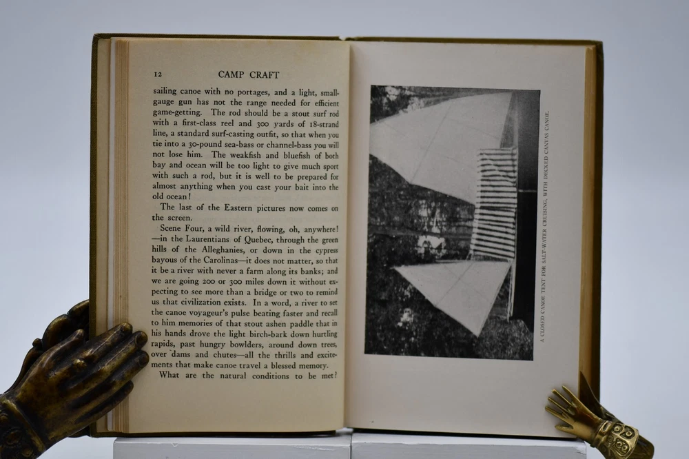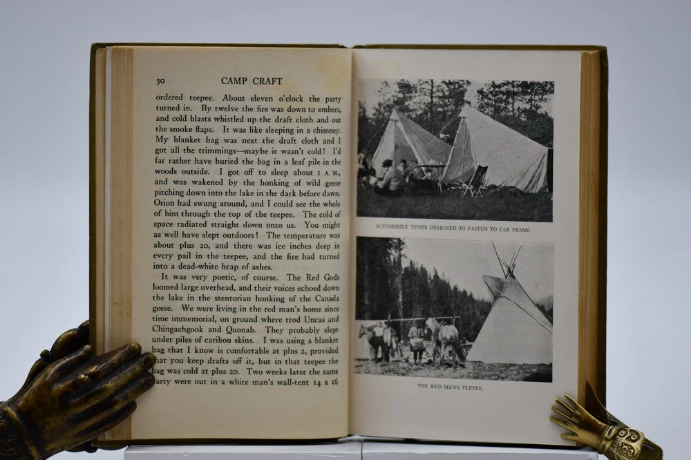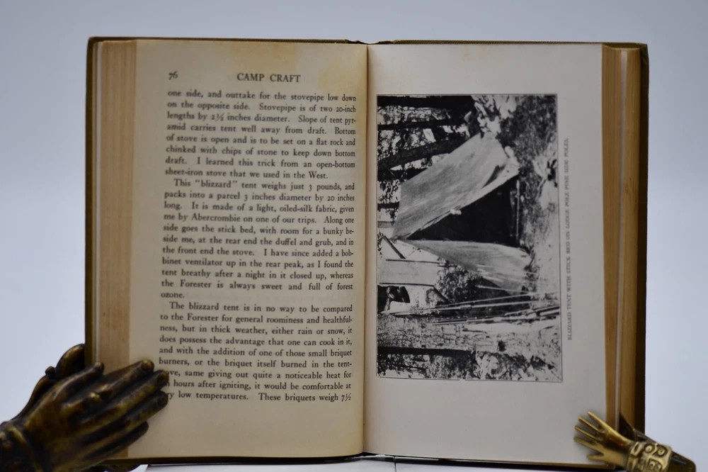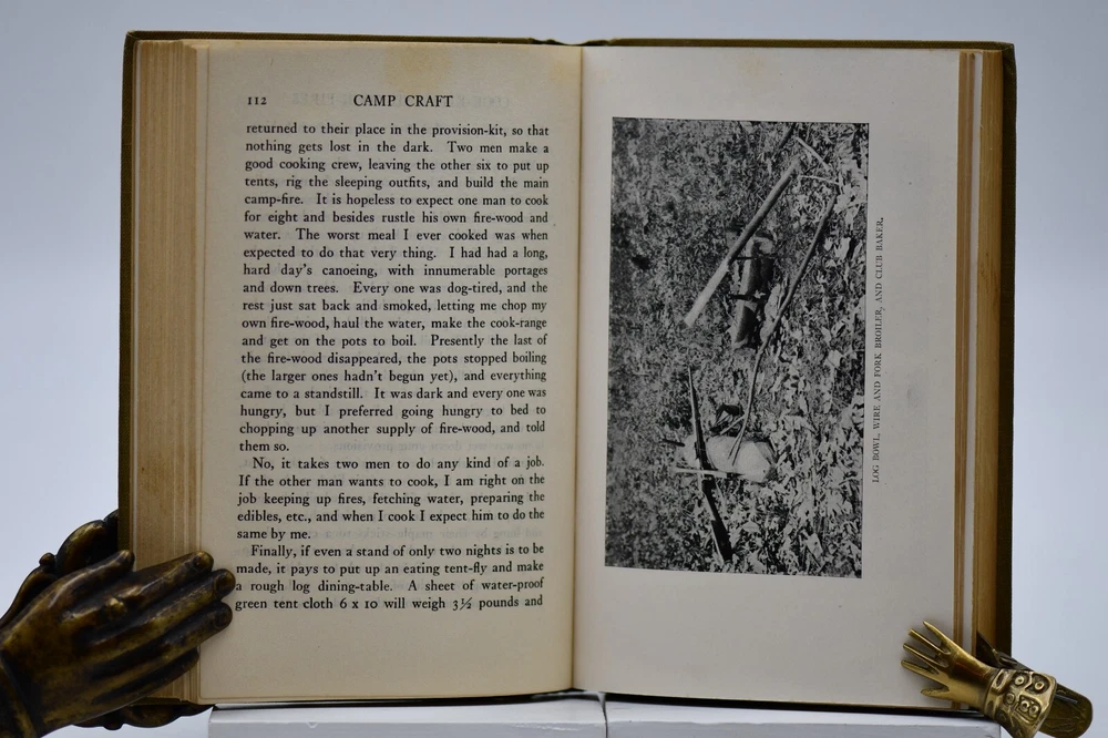 First published in 1915 “This book tells about the simple, inexpensive ways of getting the pleasures and benefits of camping out and avoiding the serious discomforts and danger.” Across sixteen chapters Miller covers: Kinds of Camps, Tents’ Eliminating the Blanket, Getting Away from the Browse Bed, The Camp-Fire, Cook-Kits and Cook-Fires, The Chef on the Trail, Trail Accessories, In Emergency, Taking the Family Along, Western Camping, The Lone Jack Diamon Hitch Tents and Clothing, Getting on Your Feet, Camp Comforts, Camp Organizations and Build Yourself a Permanent Camp. With over forty black and white photographs, hitch illustrations and introduction by Ernest Thompson Seton, this rare antique book is a wonderful addition to the outdoor persons library (but it should be noted that some text and naming would not be in common use today). While outdoor gear has progressed to new high-tech standards this book is still considered one of the best “how to” camping books for the adventurer that takes the road less traveled. Warren Hastings Miller (1878 – 1960) offered much to this American life. A graduate of Stevens Institute of Technology in 1898 with a degree in Mechanical Engineering from 1900 to 1908 he worked for a variety of companies but then went to Paris to be a writer. His writing career started as the editor of “Field and Stream”, and later vice president of its publishing company from 1910 to 1918. During the Spanish-American War at Santiago, Cuba he served as an ensign and was a naval lieutenant in World War I. In 1921 to gather material for a series of novels and travel stories, he made a 15,000-mile trip to New Guinea, Java, Borneo, and Sumatra after he had signed a contract with Harper & Brother. He was the author of thirty-two books including numerous pulp fiction books but he also wrote books on camping, hunting, fishing, dogs, and boating. Even with his busy travel and writing schedule he is also remembered today as the designer, promotor, of the Forester tent. Condition: Olive green cloth hardbound boards with blind stamped black text and camp tent image to the front board that are in very nice condition only a small cosmetic blemish to the front board. The spine back strip has slight wear to the top edge but is otherwise in very good condition – straight with strong hinges and no cracking to the endpapers. Corners have a small slant but are sharp at the tips. Text block is solid and all pages are firmly attached including glossy black and white photos. Age tanning throughout. Interior pages are clean with no tears, cracks, or previous owner marks. 282 pages. Dimensions: H – 7-1/2” W – 5”