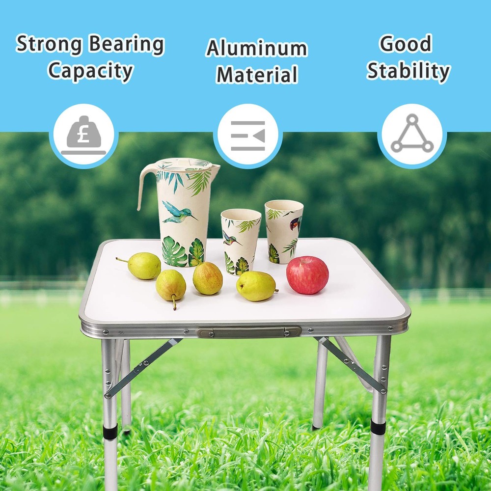 Aluminum Folding Small Table, Adjustable Height Lightweight Portable Camping Table for Picnic Beach Outdoor Indoor Easy to use :No Assembly Required, set up and fold in seconds. Two adjustable height : High height-21.6’’, Low height-10.6’’ Setup dimension:23.6''x17.7’’x21.6’’ /10.6''. Folded dimension:23.6''x1.3''x17.7''. This camping table is made of medium density fiberboard and upgrade aluminum alloy. which is stain-resistant, heavy-duty & lightweight, sturdy & durable. Versatile and practical: Whether you need a place to cook, eat, or play games, this foldable camping table is a must-have accessory for any outdoor adventure. Its compact size and lightweight construction make it easy to bring along wherever you go. Multiple Uses: Use this camp table as a picnic table, or to hold your lantern and other camping gear. It's suitable for all your outdoor activities.
