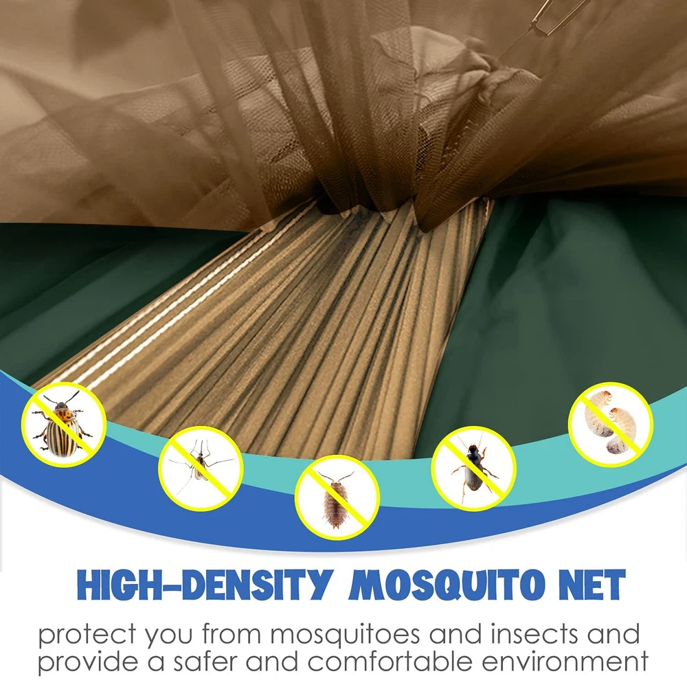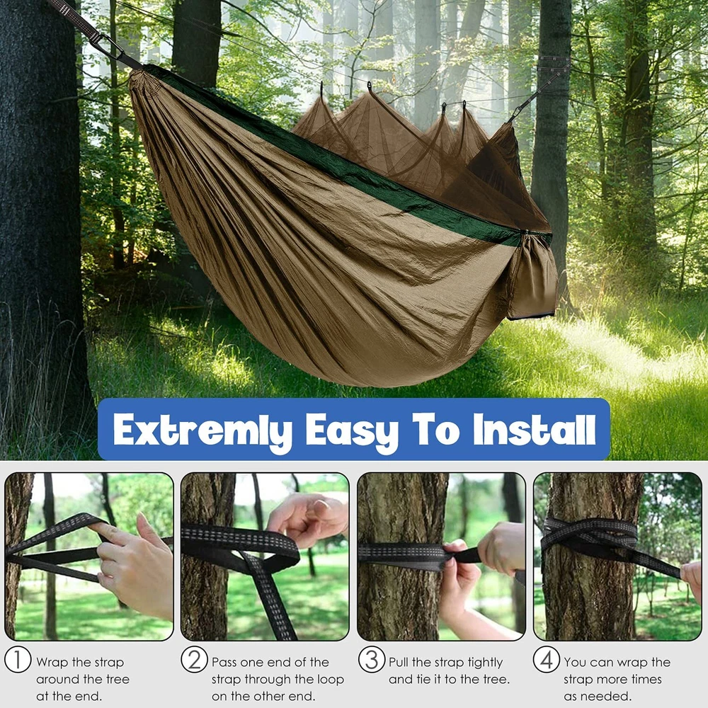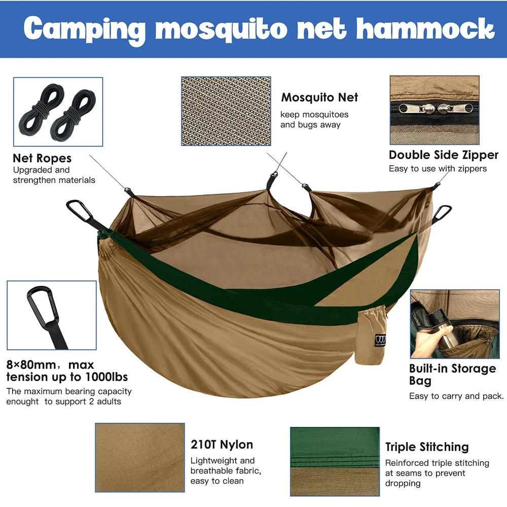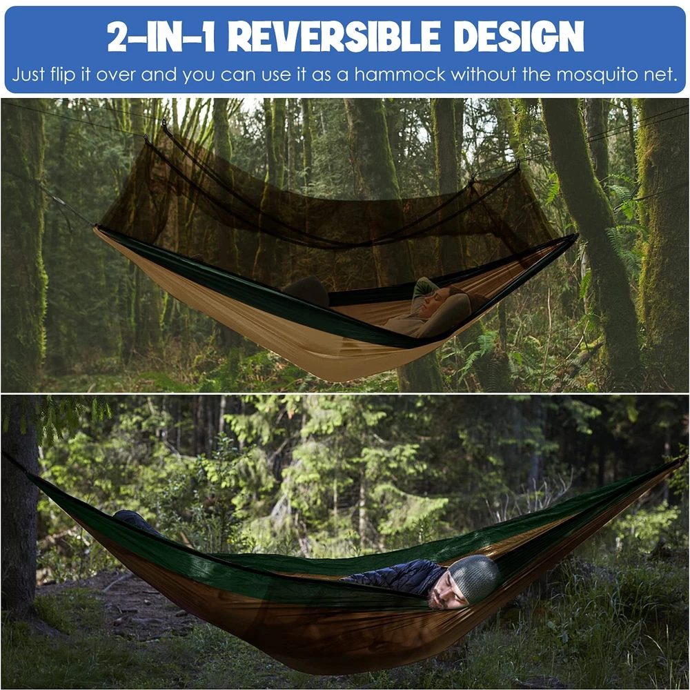 Introducing Camping Hammock - Camping Essentials, Double Hammock with Bug Net, Camping Gear Portable Hammock for Outside, Hiking, and Travel Why Choose ? ✔ DURABLE DOUBLE HAMMOCK WITH BUG NET - Our Camping hammock comfortably supporting up to 500 lbs: This double camping hammock camping essentials fits up to 2 people, you can lay down with your friend or loved one. Because of the new 210T nylon parachute fabric, this double camping essentials hammock provide relaxing support up to 500 lbs ✔ 2 in 1 REVERSIBLE DESIGN CAMPING ESSENTIALS - Just flip our camping hammock over and you can it as a double hammock without the net ✔ ADJUSTABLE TREE-FRIENDLY STRAPS CAMPING ACCESSORIES - Each strap 10ft long with 18+1 loops, 500+ lbs per strap (1000+ lbs Total) with No-Stretch Heavy Duty Triple Stitched Seams. These camping accessories tree straps easily lock the carabineers to any loops to get a perfect height and comfort level. No need to tie any knots and not damaging the trees ✔ SUPER STRONG - Our double hammock camping gear comes with unique strap design has breaking strength of 1000 lbs! Twice as strong as most competitors hammock. Camping hammock gear material made from premium 210T nylon fabric ✔ PACKAGE - Includes a double camping gear hammock 118”(Long) x 78”(Wide), an attached bug net, two heavy duty steel carabiners, two hammock tree straps 10 Feet Long (20 Ft Total) with 18 Attachment Loops (36 Total), two bug net ropes (137" Long each) ✔ Buy with Confidence - This is the best value camping accessories portable hammock, you can buy with confidence. Lifetime Warranty included by , a U.S.-based company ✔ DURABLE DOUBLE HAMMOCK WITH BUG NET - Our camping hammock comfortably supporting up to 500 lbs: This double hammock camping essentials fit up to 2 people, you can lay down with your friend or loved one. Because of the new 210T nylon parachute fabric, this double camping essentials hammock provide relaxing support up to 500 lbs ✔ 2 in 1 REVERSIBLE DESIGN CAMPING ESSENTIALS - Just flip our camping gear hammock over and you can it as a double hammock without the net ✔ ADJUSTABLE STRAPS CAMPING ACCESSORIES - Each strap 10ft long with 18+1 loops, 500+ lbs per strap (1000+ lbs Total) with No-Stretch Heavy Duty Triple Stitched Seams. These camping accessories tree straps easily lock the carabineers to any loops to get a perfect height and comfort level. No need to tie any knots and not damaging the trees ✔ SUPER STRONG - Our double hammock camping gear comes with unique strap design has breaking strength of 1000 lbs! Twice as strong as most competitors hammock. Camping hammock gear material made from premium 210T nylon fabric ✔ PACKAGE - Includes a double camping gear hammock 118”(Long) x 78”(Wide), an attached bug net, two heavy duty steel carabiners, two hammock tree straps 10 Feet Long (20 Ft Total) with 18 Attachment Loops (36 Total), two bug net ropes (137" Long each) ✔ BUY WITH CONFIDENCE - This is the best value camping accessories portable hammock, you can buy with confidence. Lifetime Warranty included by , a U.S.-based company