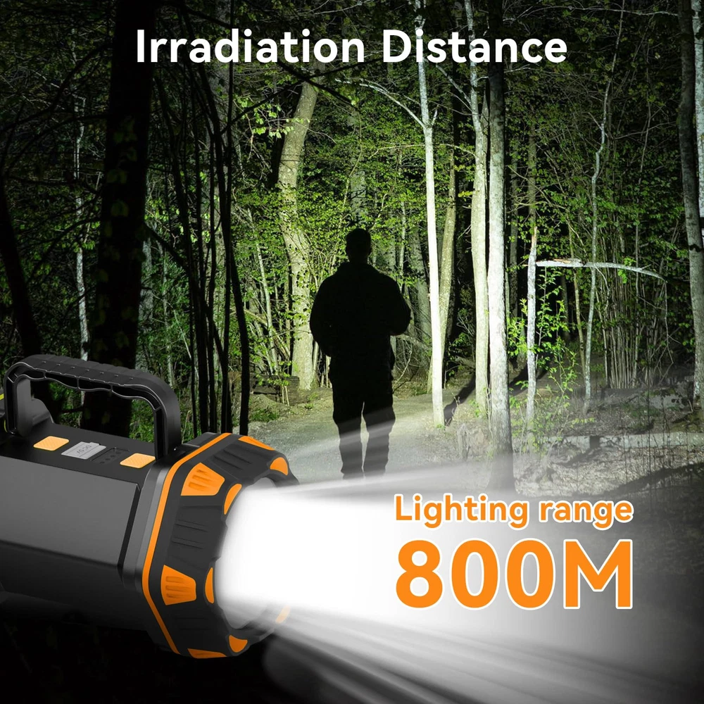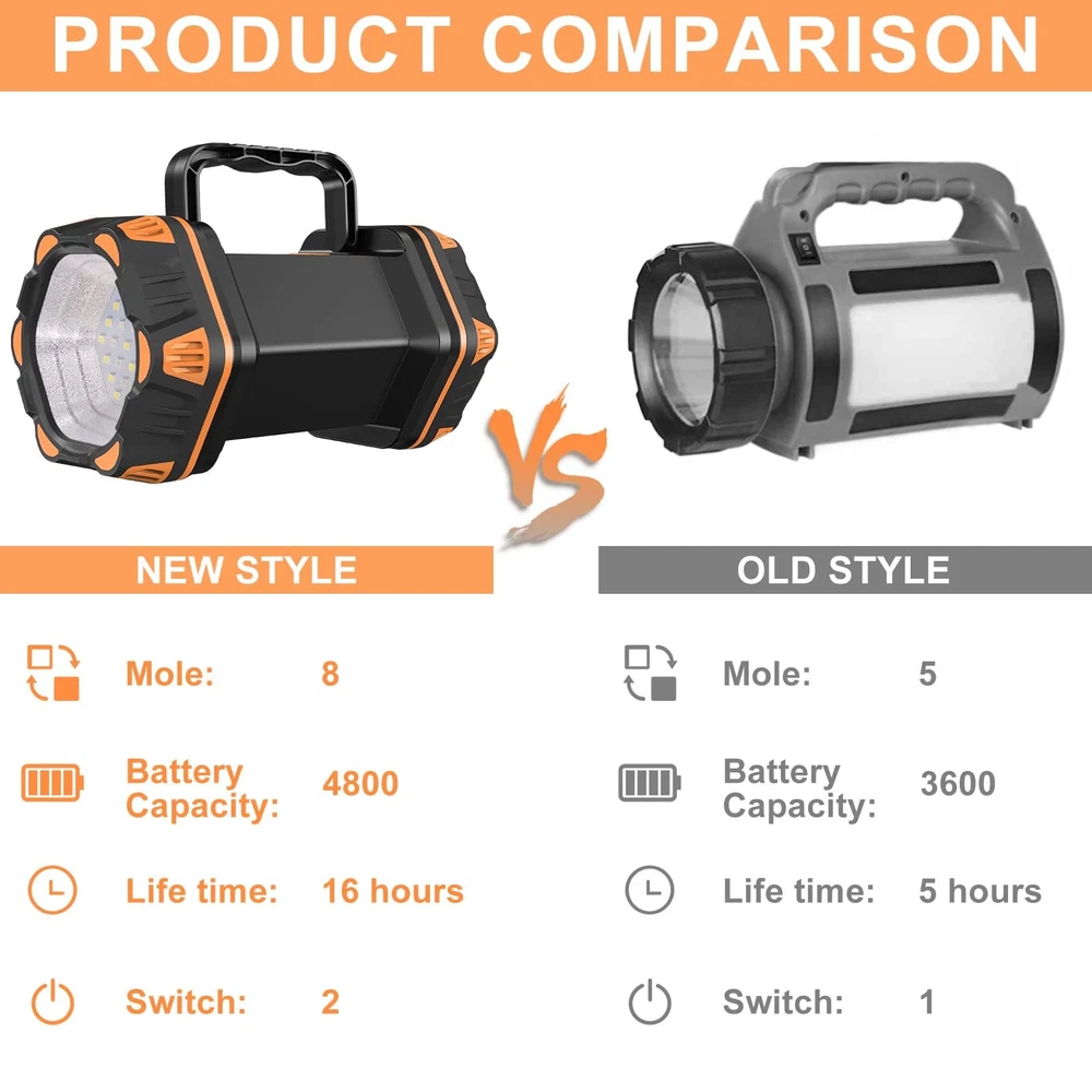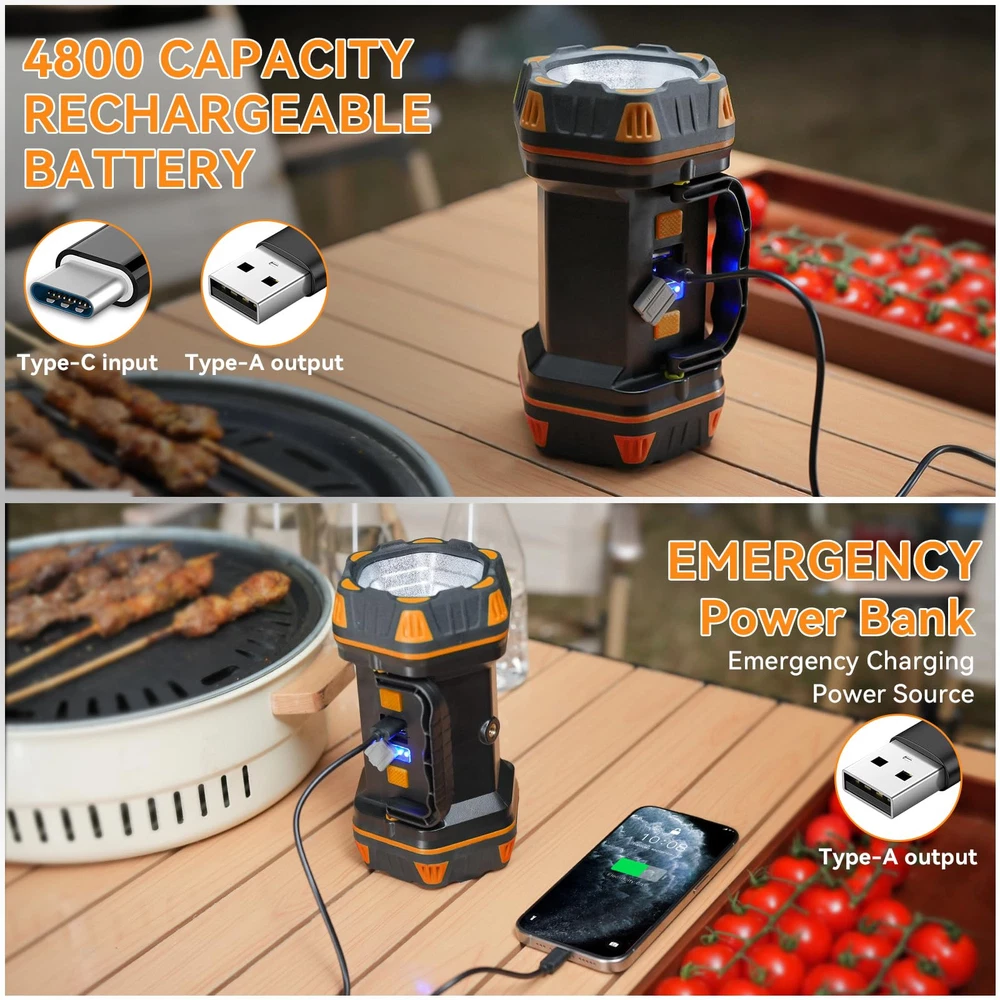 LED Flashlights high lumens rechargeable with L2 + 30 chip LED, large wide-angle irradiation range. The brightness is up to 1200lm, illuminating half a football field, the irradiation distance can reach 800m. 1200 LM HIGH BRIGHTNESS: LED Flashlights high lumens rechargeable with L2 + 30 chip LED, large wide-angle irradiation range. The brightness is up to 1200 lm, illuminating half a football field, the irradiation distance can reach 800m 4800 CAPACITY POWER BANK: The flashlight lantern with USB port has a built-in 4800 capacity rechargeable battery. It can be fully charged in 4 hours, and it can work continuously for 16 hours outdoors IP65 WATERPROOF: The camping lantern can resist rain splashing in all directions. At the same time, the LED lantern has a rubber anti-fall lamp cap, which has the function of anti-fall and anti-vibration, and can be used in extreme environments 4+4 Lights Modes: This camping flashlight has front, back lamp heads and side lights, including red warning and strobe lights, and a total of 8 lighting modes. The two-button rubber switch can satisfy the needs of turning on two modes at the same time CUSTOMER CARE SERVICE: We are committed to providing great lighting. If you encounter any problems, You can reach out to us. Please shop with confidence Note: a usb C to usb C cable won't recognize the device. You will need to use a usb A to usb C cable to charge the lantern