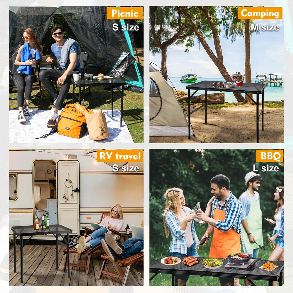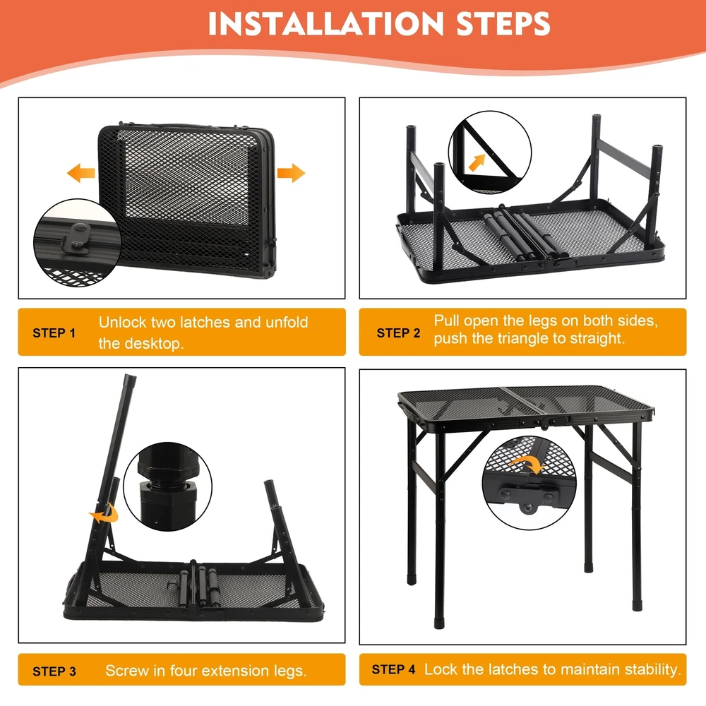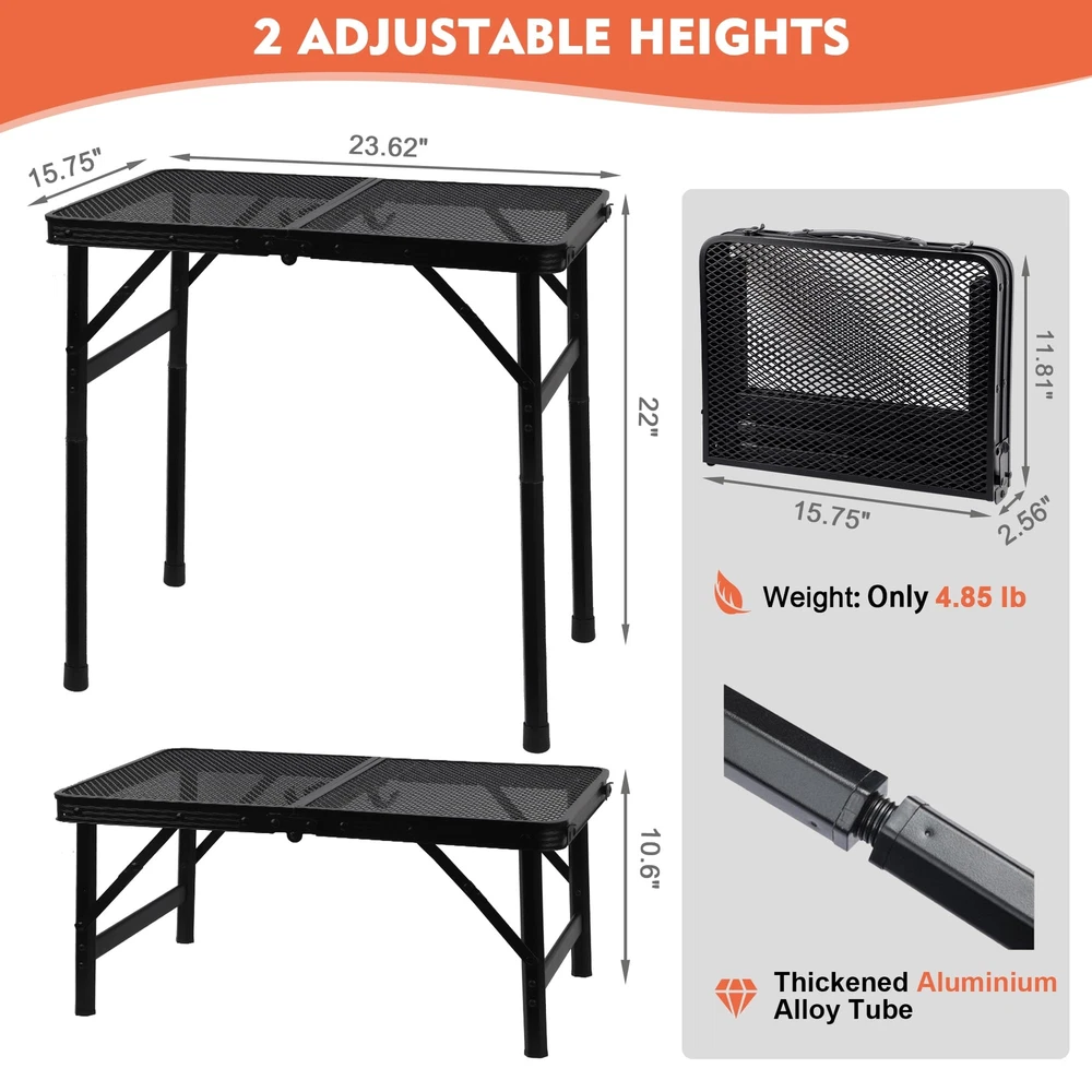 Sturdy Metal Construction: The camping table is made of iron mesh desktop and aluminum alloy frame. Hexagonal thickened aluminium alloy tube table legs have a larger weight bearing area. Holds up to 90 lbs. Height Adjustable: Height can be adjusted to suit specific needs, from a height of 10.6 inches to 22 inches by simply screwing in extension legs that embedded underneath the desktop. Easy to Install and Fold: Our foldable table is easy and quick to set up and fold up without additional tools. The unfolded size is 23.62 inches x 15.75 inches, provides plenty of space. Lightweight and Portable: Folded size is 15.75" x 11.81" x 2.56" and weighing only 4.85 pounds, it is compact and easy to store and transport in a RV. Perfect for use as a grill table while camping, traveling and picnic. Easy to Clean: The top of this folding table features an iron mesh design that resists heat, water and rust. Allows spills and crumbs to pass through for easy cleaning and maintenance.