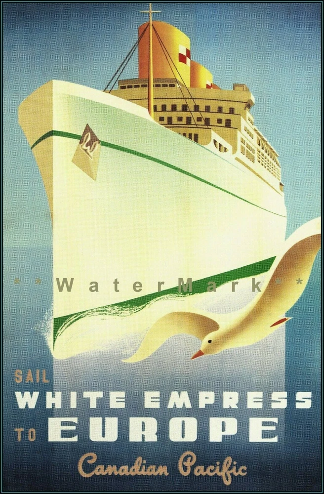 White Empress1950 Sail To Europe Canadian Pacific Ocean Liner Vintage Poster Print Retro Style Restored Art **We offer Free US Postage or Reduced Postage for Canada and worldwide. **No Extra Post Charges For Multiples!! **These are not framed or stretched or mounted NOTE:**Delivery dates shown are only "Suggested" Order Early To Avoid Post Delay Dramas **Read Please: The print looks best with a nice mat (passe-partout or Passepartout) and frame. These prints are the exact proportion as the original and will not be stretched to fit the paper or canvas...this would cause a distorted print The image will be the exact aspect ratio as per the original poster, so there might be more white on the top and bottom, or side to side. Options available..use the drop-down menu *Watermark will not be on your image. *Cloth Canvas is an artist's canvas used in museums and art galleries *Photo Gloss Paper is a high-quality Professional Photo paper *Matte Photo Paper is a great solution if you do not want a Gloss, this paper is great with colors *Luster Photo Paper This photo paper is neither glossy nor mat. Glossy paper has a smooth texture, and luster paper is slightly textured. This option is a good choice for something in between Metallic, Photo Gloss, and Matte *Metallic Pearlescent Photo Paper is a very high-quality paper with a Pearlescent sheen, a glossy finish, and a unique metallic appearance, these prints have extra visual interest and depth. This paper uses a combination of film laminate layers that produce striking, dimensional, lasting images on an ultra-bright background. The effect is sometimes described as "chrome on paper." This is NOT a metal plaque, it is a photo paper This poster print will be shipped in a sturdy container. We will ship usually within 24 business hours of payment, except for weekends or US Holidays If there is a question, please do contact me The delivery date given on the listing page is not guaranteed by the post All is done to send you the best quality poster image. Don't forget to check out the Sales. There is a great Buy 3 Get 1 Free Offer!! Shipped Worldwide!! There are a variety of reasons why the images on your monitors don't match each other. The simplest is that each monitor is different; even monitors with the same model won't have colors that match up perfectly We are located and ship only from the USA