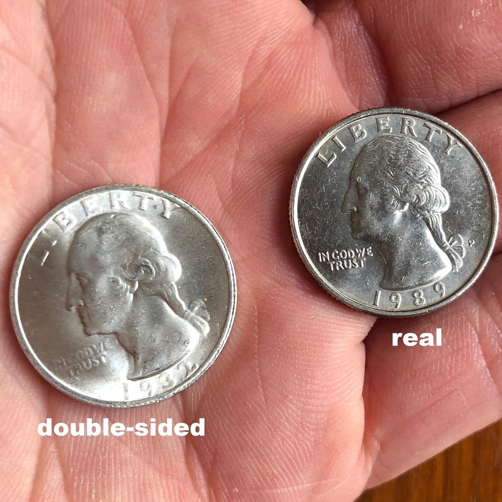 Canailles 2-Pack Double-Sided Quarters, 1 Double-Sided Heads Coin and 1 Double-Sided Tails Coin, Cool Novelty Quarter for Magic Tricks or Pranks Product Details Package Dimensions: 2.01 x 1.81 x 0.28 inches Item Weight: 0.317 ounces Item model number: doublesided2 Manufacturer recommended age: 12 months - 18 years Manufacturer: Canailles Get 1 Double-Sided Heads Coin and 1 Double-Sided Tails Coin to trick your friends and family or just prank someone by always winning a coin toss Made of metal and pressed to look like a quarter from 1932 For novelty use only, while our coins do resemble a real quarter they are not exact, metal coloring is slightly lighter than a real US minted quarter. Size and strike design mimick that of a quarter from 1932