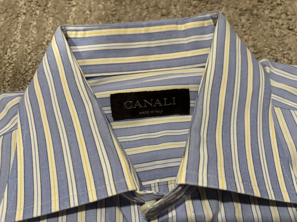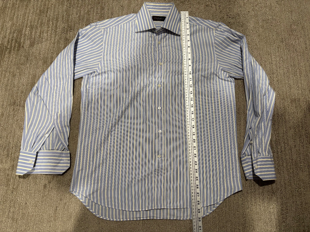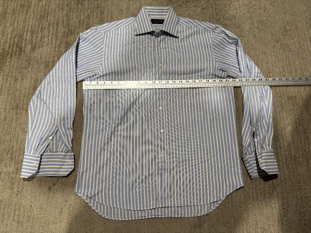 The Canali Dress Shirt for men, made in Italy, features a classic blue and white striped pattern with a collared neckline and button closure. The shirt is crafted from 100% cotton fabric, ensuring a comfortable and stylish fit for business occasions. With a spread collar style and long sleeves with a barrel cuff, this dress shirt exudes a sophisticated and timeless appeal. Perfect for adding a touch of luxury to any formal ensemble, this shirt is a versatile and high-quality addition to any man's wardrobe.