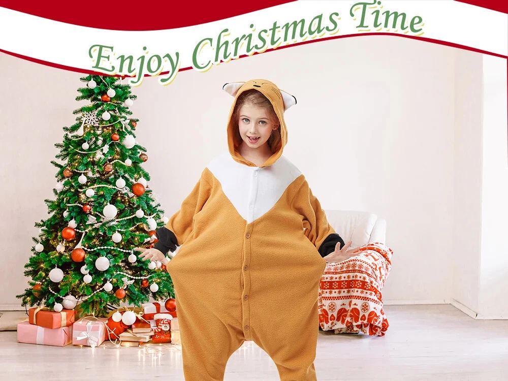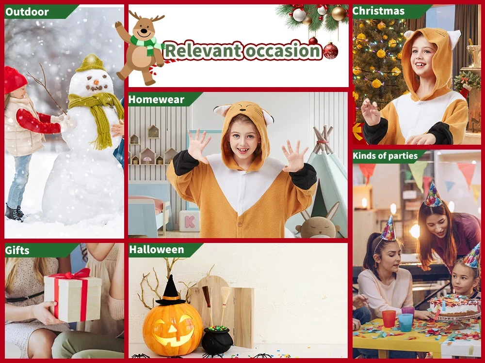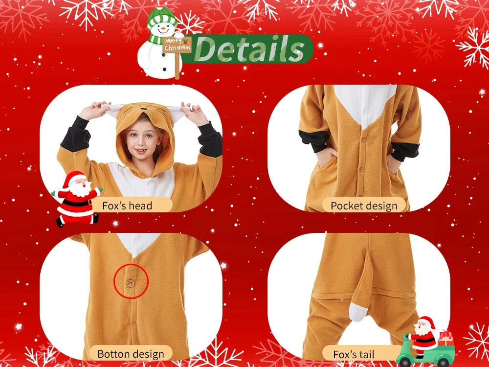 This Christmas, let's make our homes a haven of warmth, laughter and unforgettable memories - all in these festival fox one-piece pajamas. The fox one-piece pajamas are made of high quality polyester. Soft,skin-friendly and elastic,keeping you comfortable all day long. Not easy to get pilling. Not easy to shed. Not easy to easily. The hat design:The hat is designed according to the real appearance of the fox, which is cute and fashionable. The front botton:Front button design in accordance with the fox onesie. At the same time easy to button,strict thermal insulation. There is a horizontal zipper on the back of the pajamas,so it is more convenient to go to the toilet. Occasions On chilly winter evenings,our fox onesies provide extra warmth and coziness. Whether watching a movie, reading a book, or simply relaxing in bed, the material keeps one comfortably warm. On lazy weekend mornings or afternoons, the fox pajamas are perfect for lounging around the house, doing nothing in particular, and simply enjoying the comfort of being cozy and warm. When you just need to run a quick errand, like checking the mailbox or grabbing a few items from the store, the pajamas can serve as a casual and comfortable outfit. Children often love pajamas with fun designs like fox.These pajamas can make bedtime more exciting and help children feel cozy and ready for a good night's sleep. During holidays like Christmas or Halloween, animal themed pajamas like these can be a great way to celebrate. They add to the festive atmosphere and make for fun photos and memories. When hosting a sleepover or pajama party, fox onesies add a fun and unique element.Children can play, watch movies, or simply hang out in their fox pajamas, creating memorable experiences. The Shipping We will ship the item within 1-3 days after receiving the payment. Feedback If you find any problems (for example size,broken,color,wrong itemand so on) after receiving the goods, please contact us in time,we will try our best to solve you problems. If you are satisfied with the product, please give us five stars.