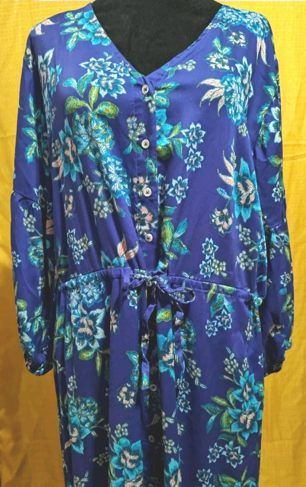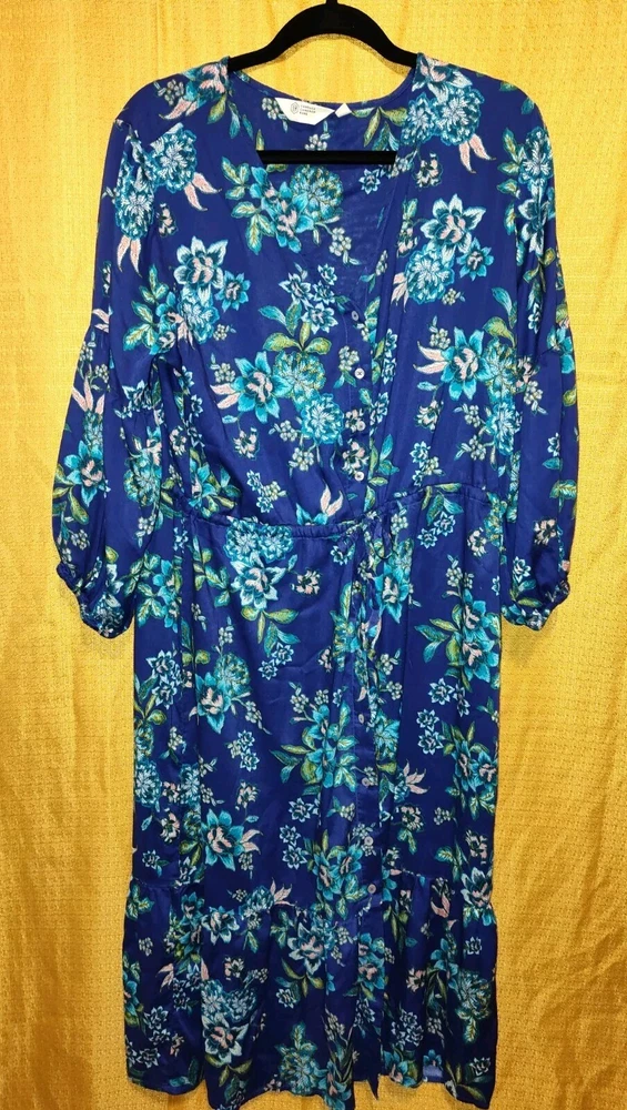 This Candace Cameron Bure dress features a beautiful floral pattern in a stunning Clematis Blue color. With a V-neckline and 3/4 balloon sleeves, this dress is perfect for any occasion, whether it's a casual day out or a wedding or travel event. The dress is made from a lightweight, comfortable knit fabric that is a blend of spandex and modal materials. The dress is an A-line style with a knee-length hemline and a button-front closure. It also includes accent buttons and a tie waist to accentuate your curves. This dress is perfect for the spring and summer seasons and is sure to turn heads with its elegant design and comfortable fit. This dress is in excellent condition. No rips, stains, tears, snags, or runs. It is beautiful, bright, and is in new without tags condition!