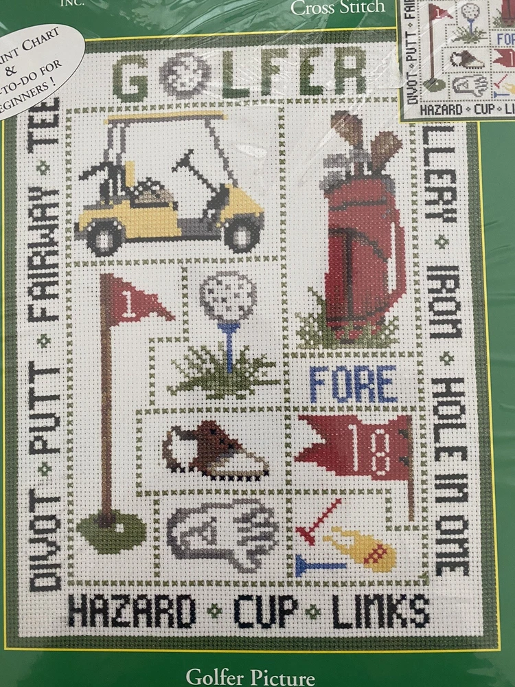 Candamar Designs Golfer Picture Counted Cross Stitch Kit #51418 Vintage 2002 Finished size 8” x 10” NEW Sealed Will ship via USPS Kit contains: - 14 count white 100% Cotton Aida cloth - 100% Cotton floss - needle - large print chart - easy to follow directions Pet and smoke free THANKS FOR SHOPPING! D