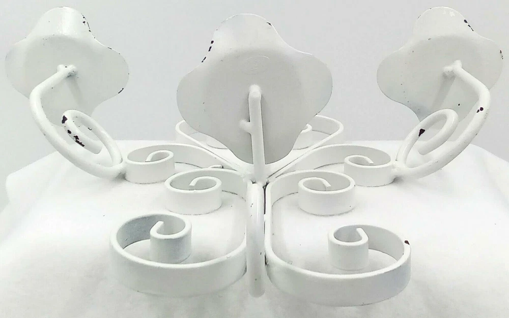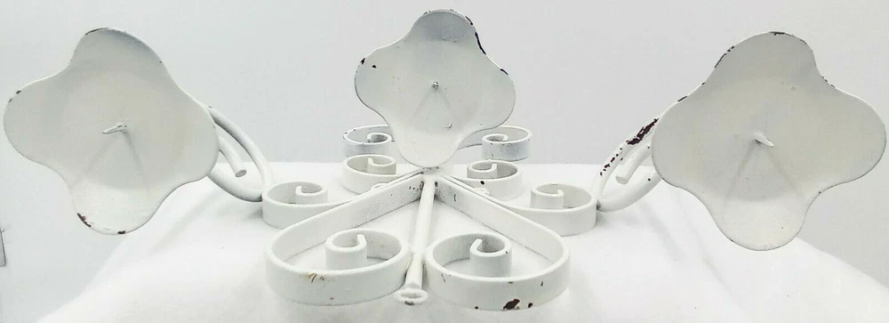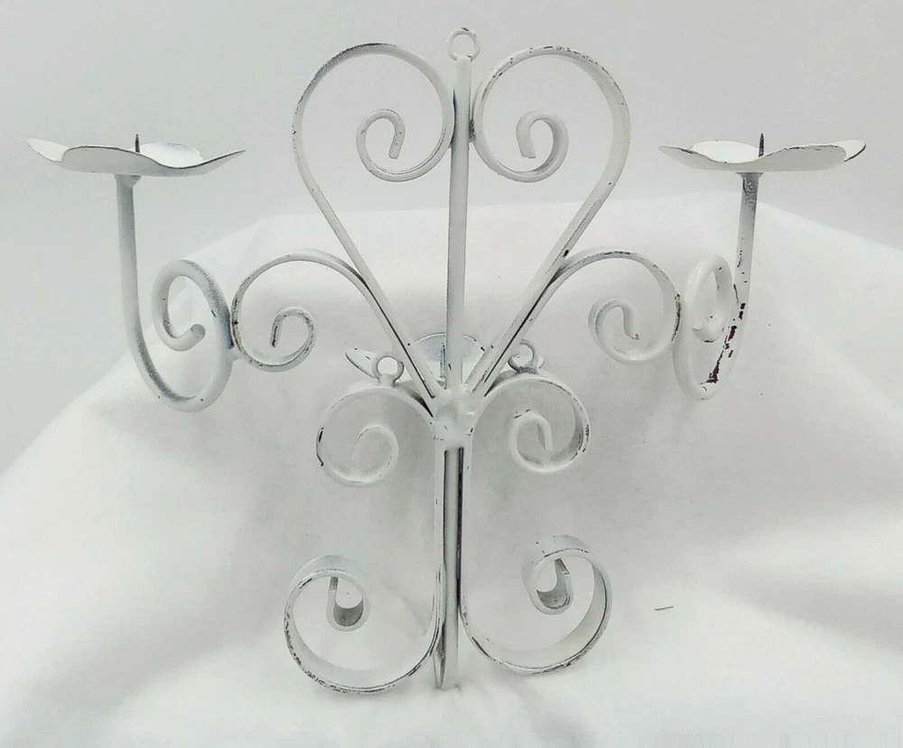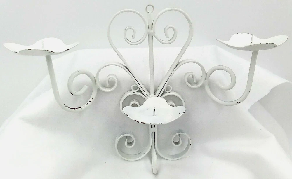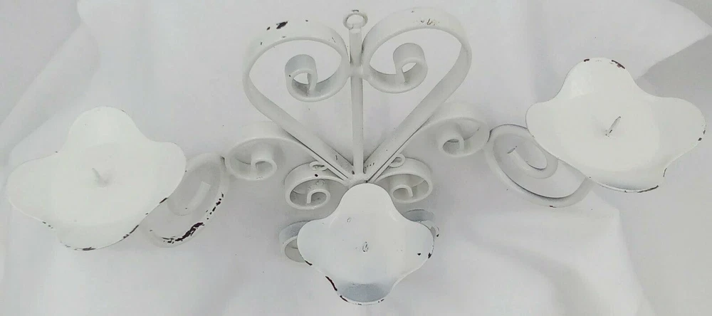 White Distressesd Hanging Metal Candelabra Heart Scroll Petal Candle Holders 10". Condition is pre-owned. Measurements are approximately 10 inches tall by 13.5 inches wide. Please check out our photos for further information. If you have any questions or concerns, please contact us. Thank you for your support! Please check out The Burly Owl Lady eBay store for more great products! Shipped USPS. We ship vintage and new items. We carefully pack with care to ensure the safety of each item. We do not pass these packaging costs onto the buyer. Furthermore, we do not charge any extra fees for handling. We only charge for the USPS shipping charge. We do monitor shipping prices frequently. In most cases, we do find the USPS to be the most inexpensive way to ship our products. We try to be as detailed as we possibly can in our photos and descriptions. We try to mention any imperfections in our vintage items. We may miss things from time to time or our photos may not be enough clarification for you to see the item. We will be gladto answer any questions or send you more photos. If at any time, you have a question or issue, please contact us immediately. We will contact you within 24 hours. We want to make sureyou have a good experience in purchasing any of the products. If you are happy with your purchase, please leave feedback. It will help us to grow and offer more great items in our store! Thank you for your interest in one of the many products in our eBay store! Renee Burly Owl Lady