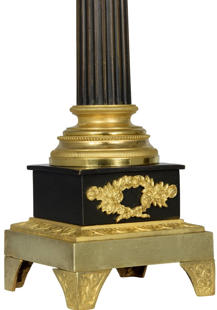 Welcome, Here, you get the very best: the guarantee of acquiring an authentic item, along with restoration work carried out to the highest standard. I am a French watchmaker with 20 years of experience, specializing in mechanism overhauls and cleaning original gilding. I have always worked remotely and have shipped thousands of items to your country (no customs fees for antiques over 100 years old). Therefore, it poses no difficulty for me. I guarantee a perfectly secure transaction as well as remote assistance at every step. ----------------------------------------------------------------------------------- These elegant chandeliers in mercury-gilt bronze and patinated bronze resemble miniature architectural compositions, reminiscent of small antique columns. They rest on a slightly flared, quadrangular base supported by four carved feet adorned with finely engraved motifs, evoking stylized palmettes. Above rises a molded base decorated with a frieze of water leaves, from which stands a vertical shaft treated like an antique column, its rhythm punctuated by deep, regular fluting. The base of the shaft is composed of torus and astragal moldings, while the upper section flares into a collar evoking a stylized Corinthian capital. From this foliate crown emerge three patinated bronze candle arms, designed with delicately twisted scrolls and tendrils, punctuated by rosettes at the base of each arm. The candle holders and sockets, crafted in gilt bronze, are richly decorated with beaded friezes, gadroons, and fluting, attesting to meticulous goldsmithing. At the center rises a fourth element, representing a sculpted flame, a symbolic motif of eternal light that harmoniously crowns the composition.