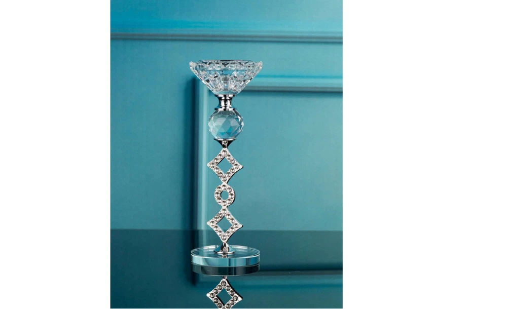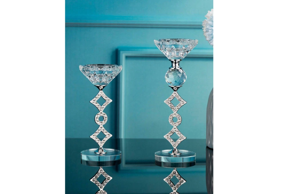Luxurious candle holders featuring a modern asymmetrical design with sparkling crystals. Suitable for various types of candles, including pillar, tea light, taper, and 3-wick. The large silver holders add a touch of elegance to any space, perfect for creating a romantic or holiday ambiance. Crafted from crystal, these candle holders are a stylish addition to any home decor collection.