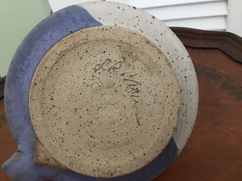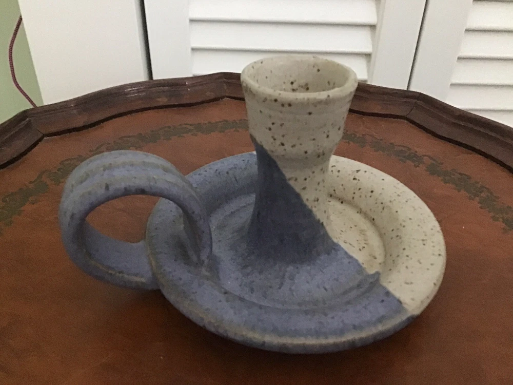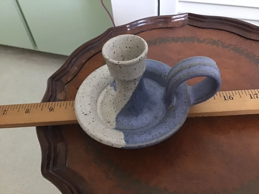Candle W/ Finger Holder Blue/ Gray Speckle North Carolina Potter,Signed