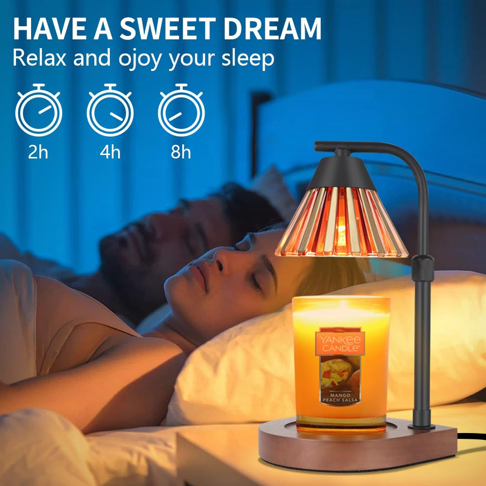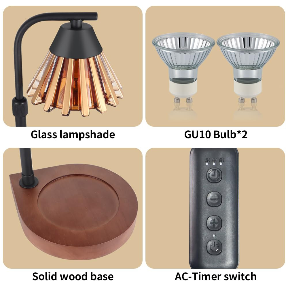 ENVIRONMENTALLY SAFE CANDLE WARMER: Equipped with a 50 watt halogen heating bulb (included), the candle warmer lamp provides a safe and environmentally friendly way to enjoy candles. No open flame, no smoke, no soot, no pollution, reduce the risk of fire. Candle light heaters are cleaner and more efficient. Ideal for sustainability and safety. EFFICIENT & ADJUSTABLE, SCENT IN MINUTES:candle warmer uses a 50W GU10 halogen bulb to melt candles and wax from top to bottom for fast and efficient scenting. With the dimmer control of the Aesthetic Home Decor Lights Candle Warmer, you can adjust the melting speed. The brighter the environment, the faster it melts. In addition, you can set the 2/4/8 hour off function of this candle warmer lamp with timer. PERFECT HOME DECOR:This candle warmer is a stylish combination of wooden base, metal body and glass shade, blending classic and modern design. Wax melting warm smelling wax as delicate and functional decorative lamp used for bedroom decor, living room decor aesthetics, den, office, yoga room, and more. FITS ALL SIZE CANDLES: There is a safe distance from the base of this candle warming lamp to the shade, with Yankee candles and most different types of jar candles or wax. Under the wooden base, non-slip pads are added for stability, making you feel safer when using this candle warming lamp. Say goodbye to candle flames and protect your house from fire hazards with halogen bulbs. BEST GIFT FOR MOM:Show your love to your family, loved ones or friends with this housewarming gift. Elegant appearance and practical performance make these candle lights a birthday gift for women, mother's day gift for mom. Suitable for Mother's Day, Valentine's Day, Easter, graduation gift, Father's Day gift, teacher gift, Halloween, Thanksgiving, Christmas, birthday gift for mom.