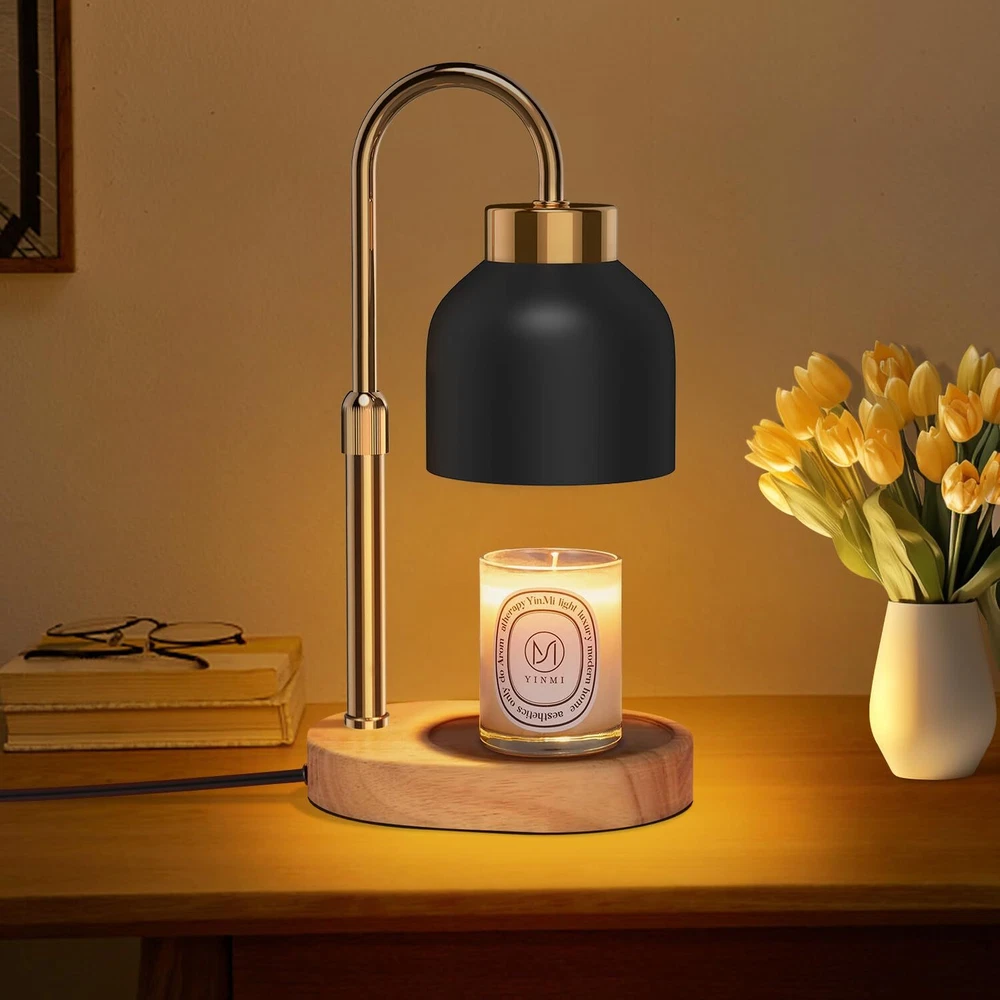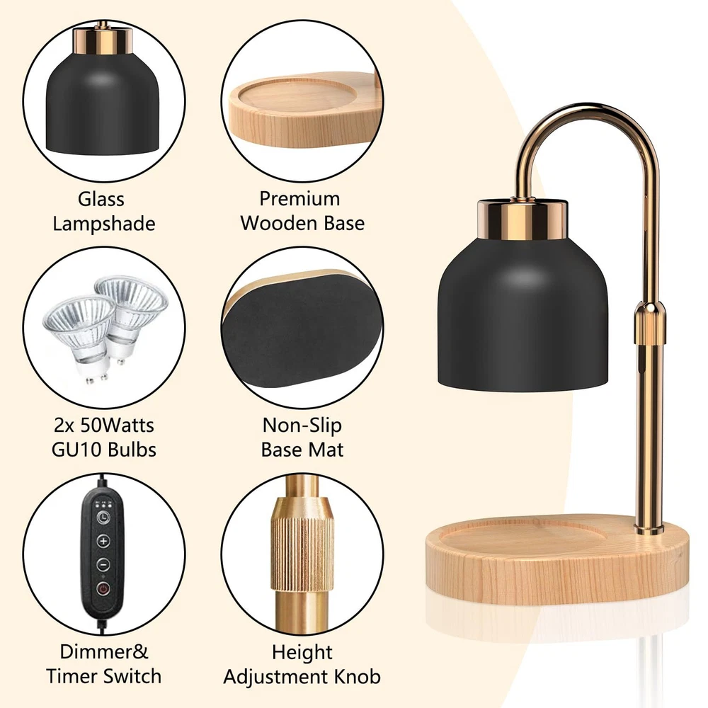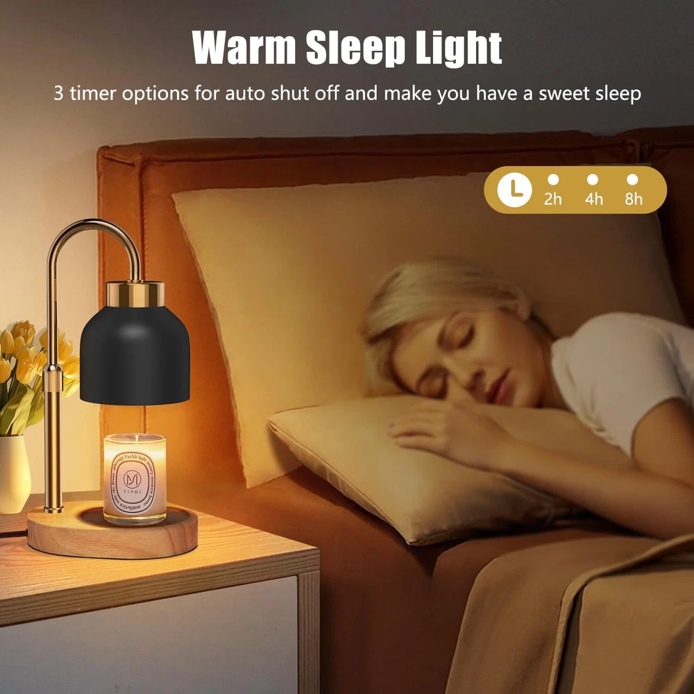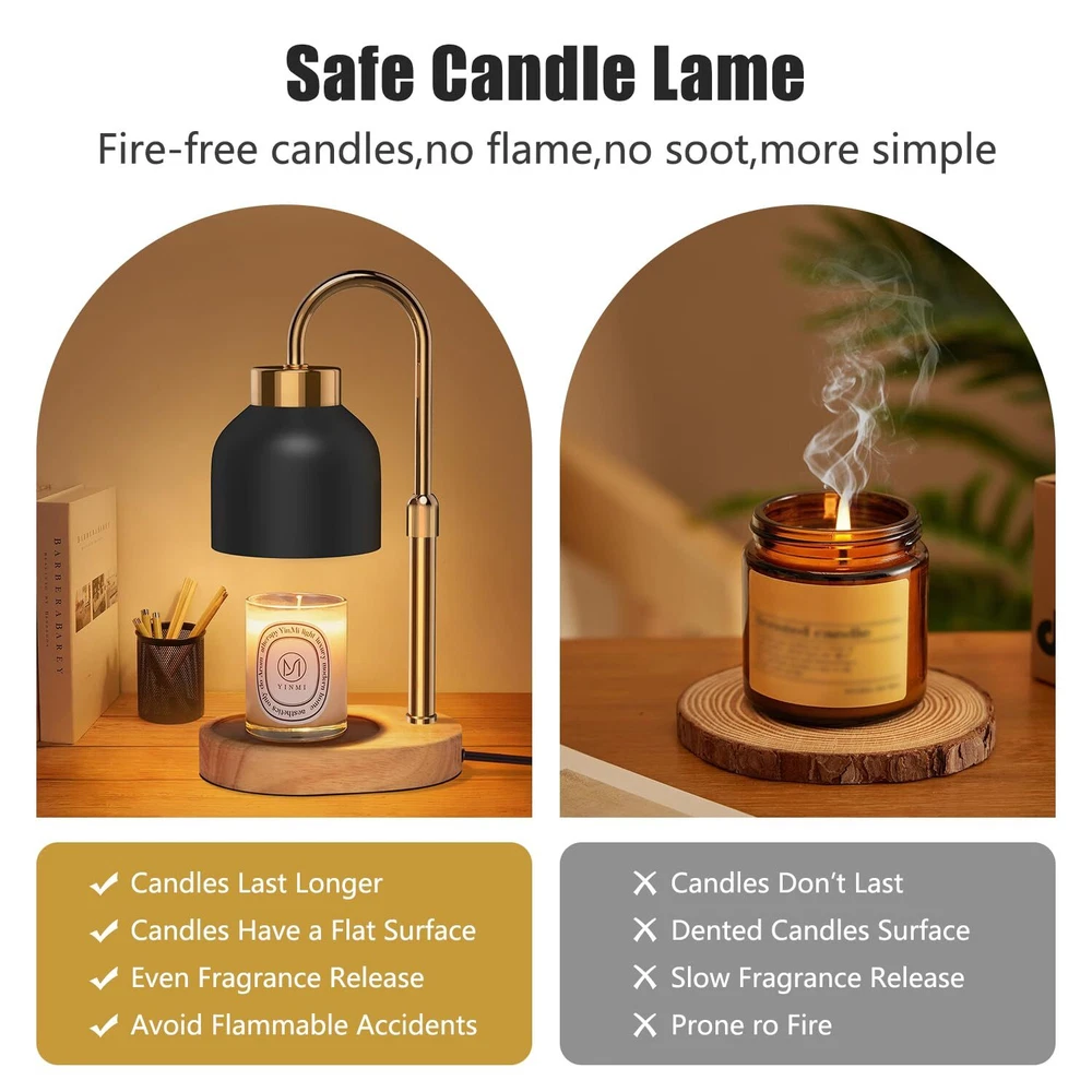 CANDLE WAX WARMER & ADJUSTABLE BRIGHTNESS:This candle lamp with dimmer,it has 4 brightness levels to meet different need.the melting speed of the candle can be controlled arbitrarily by adjusting the brightness of the candle lamp.The stronger the light, the more heat the light emits and the faster the candle melts.It releases scent naturally and evenly as it melts the candle. Perfect for when you're working out, reading, sleeping, and other relaxing times. ADJUSTABLE HEIGHT & FIT ALL CANDLE SIZES:candle warmer lamp has adjustable height function,which is with multiple jar candles or wax,the height from base to shade adjusts from 1.9 to 5.7 inches,it can hold jar candles of various sizes.The wooden base is made of high-quality material with non-slip pads under the base to ensure its stability. CANDLE LAMP WARMER WITH TIMER:This wax melt warmer is equipped with timing switch,you can choose from 2H/4H/8H timer settings,You can adjust the duration of wax burning according to different occasions and moods, and you don't have to worry about forgetting to blow out the lighted candles, which is more comfortable and safer. ECO-FRIENDLY & SAFETY: The candle wax warmer comes with 2* 50W halogen bulbs (candles not included),Candle warming lamps use of dissolving wax lamps, eliminating the need to light candles.it can release the strongest, purest, cleanest scent possible. Easily melts candles,no flame, no smoke, no indoor pollution, preventing accidents caused by flames. IDEAL GIFTS FOR MOM:The modern metal look of this elegant candle lamp complements a variety of decorative styles, creating a blend of classic and contemporary design,it is a elaborate modern home decor for bedroom,living room,office,etc.Show your love to your family, lover, or friends with this house warming gifts,it's ideal gift for Mother's Day,Thanksgiving, Christmas, Valentine's Day, Easter, Graduation gifts,also perfect birthday gifts.