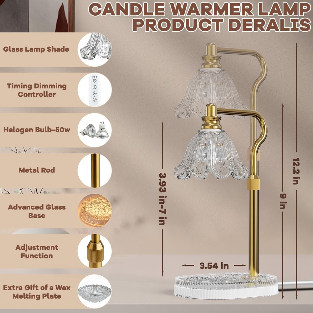 Candle Warmer Lamp,2H/4H/8H Timer,4-Level Dimming,Height Adjustable,Electric Candle Warmer Melter with 2 Bulbs for Scented Wax Home Decor for Her Birthday Gifts for Women Mom Wife Product Details Color: Flower-white Brand: BNWXOY MPN: XXD0917 UPC: Does not apply EAN: Does not apply Bulb Base: GU10 Lamp Type: Night Light Shade Color: white Switch Type: Touch Style: Modern Bulb Base: GU10 Lamp Type: Night Light Shade Color: white Switch Type: Touch Style: Modern Brand: BNWXOY Color: Flower-white Special Feature: Adjustable Color Temperature, Adjustable Height, Lightweight, Color Changing Light Source Type: Halogen Material: Crystal, Metal, and other unspecified materials Recommended Uses For Product: Decoration Power Source: Corded Electric Connectivity Technology: USB Mounting Type: Tabletop Cartoon Character: mom gift; house warming gifts new home Wattage: 5E+1 Number of Items: 1 Lighting Method: Adjustable Indoor/Outdoor Usage: Indoor Specific Uses For Product: Decoration Installation Type: Tabletop Number of Pieces: 1 Voltage: 1.2E+2 Volts (AC) Is Cordless?: No Manufacturer: BNWXOY Product Dimensions: 1 x 1 x 1 inches Item Weight: 3.69 pounds Item model number: XXD0917 Date First Available: September 17, 2024 Perfect Candle Lamp Design: This candle heating lamp perfectly balances aesthetics and functionality. The crystal transparent base is connected to a metal telescopic rod and a unique new appearance lampshade, providing stable support and suitable for candles of all sizes. The most important thing is that the crystal transparent base can reflect different lighting effects with different lampshade patterns and colors, creating a comfortable atmosphere and projecting beautiful ambient light Sleep Light With 4 Brightness & 8h Timing Function: The lamp candle warmer has 4 levels of height temperature adjustable (0%-15%-30%-70%-100%), the stronger the brightness, the faster the candle melts. And our candle warmer lamp can be turned off by timer feature 2H/4H/8H, don't need to worry about forgetting the heating time while enjoying the fragrance, with peace of mind sleep and play anytime. Plus, our candle lamps come with two GU10 50W halogen bulbs to get you started Excellent Security:This candle warmer lamp with timer utilizes advanced heating technology to melt candles from top to bottom, achieving a flameless, smokeless, and pollution-free effect. Both the lampshade and base are coated with a high-temperature resistant material, effectively addressing concerns of fire hazards. When you relax or read time to put it on the side, you can enjoy the melting candle light brings ease and comfort, BNWXOY candle warmer light is your top choice.(Candles are not included) Perfect Home Decor: This candle warmer light suitable as a decorative match for any scene, especially for those living in apartments that do not allow the use of open flame candles. It is a good choice.The candle warmer adopts a Retro style design and is a delicate functional decorative lamp, suitable for living rooms, bedrooms, offices, yoga rooms, cafes, etc. It can also be used as a bedside lamp to create a sleep-inducing atmosphere Best Birthday Gifts for Women: This Candle Lamp Warmer with exquisite packing gift box will be the best gift choice.It can be a Mother's Day gifts, Christmas gifts, Thanksgiving gifts, Valentine's Day gifts, Mother's Day Gifts for Mom Home Decor House,Birthday gifts, Anniversary gifts, Housewarming gifts to show your love. Any problems please contact us, we will respond in 24H and provide a hassle-free replacement or refund