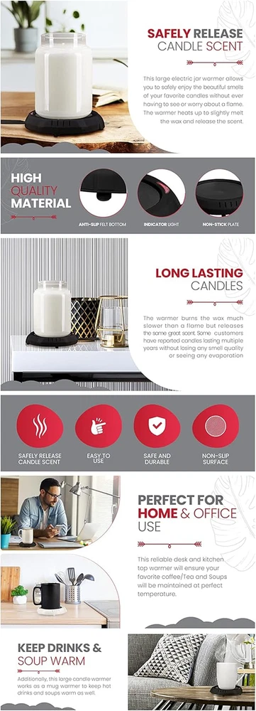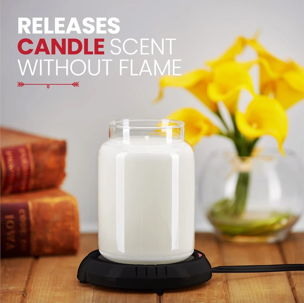 Store New Arrivals Add to Favorite View Feedback Contact Candle Warmer Plate Safely Releases Scents without a Flame- Used as Candle Jar Warmer, Candle Melter, Coffee Warmer, Mug Warmer, Cup Warmer in Your Home & Office (Black) Description Item model number 1199-15BPBLK Product Dimensions 5"L x 5"W x 1.5"H Capacity 4 Inches Power Source Corded Electric Color Black Upper Temperature Rating 100 Degrees Celsius Wattage 17 watts Material Plastic Item Weight 6.7 ounces Number of Trays 1 Voltage 120 Volts SAFELY RELEASE CANDLE SCENT: This electric jar warmer allows you to safely enjoy the beautiful smells of your favorite candles without ever having to see or worry about a flame. The warmer heats up to slightly melt the wax and release the scent. The warmer has a 4.25inch diameter making it perfect for the typical 4-inch candle. Plug in electric cord length is 1.1m (43.3 inches) HOME AND OFFICE USE: This reliable desk and kitchen top warmer will ensure your favorite coffee/Tea and Soups will be maintained at perfect temperature. ANYWHERE FLAT WITH FELT BOTTOM: You can place the warmer on almost any flat surface. Use it in your home, office, shop, den, kitchen, or anywhere else. The warmer has felt covered feet to ensure it will not slip and slide on slippery surfaces such as wood or granite. LONG LASTING CANDLES: The warmer burns the wax much slower than a flame but releases the same great scent. Customers have reported candles long lasting without losing any smell quality or seeing any evaporation. EXTENDED WARMTH FOR BEVERAGES AND CANDLES: Picture this: your coffee or tea is always at the perfect sipping temp. And those candles? Pure relaxation, no flames. Our electric coffee mug warmer for desk works its magic, keeping it all cozy just for you! Product Description ABOUT US We offer the best prices around on high quality products. Our E-store includes media such as books, movies, music and games while offering electronics, toys, sporting apparel, clothing, tools, general home, garden items and more. SHIPPING We are always working hard to ensure your package arrives as soon as possible. Please understand that some factors like weather, high postal traffic, and the performance of shipping companies are outside of our control. We offer free shipping to the lower 48 states and ship within 2 business days of payment, usually sooner. We do not accept P.O. Boxes. Please provide a physical address. For shipping outside of the continental USA, we only use eBay's Global Shipping Program.The item is shipped to KY and then sent to the rest of the world. International customers are responsible for all duties and taxes. Continue to check out in order to calculate costs for shipping the item to your country. Messages regarding eBay's Global Shipping Program MUST be directed at eBay EXCLUSIVELY. RETURNS We offer a 30-Day Return Policy on items which you are not completely satisfied with. You have the option for a full-refund or an exchange of the item. No returns are available on items shipped outside of the USA. PAYMENT We accept PayPal. CONTACT US This page content is yet to come Please ad us to your favorite seller and visit again later Thank You CUSTOMER SATISFACTION We try our very best to make sure every customer is completely satisfied. If there's a problem, message us! We're happy to help. WE ACCEPT Copyright © 2021 AutoDS. | All Rights Reserved