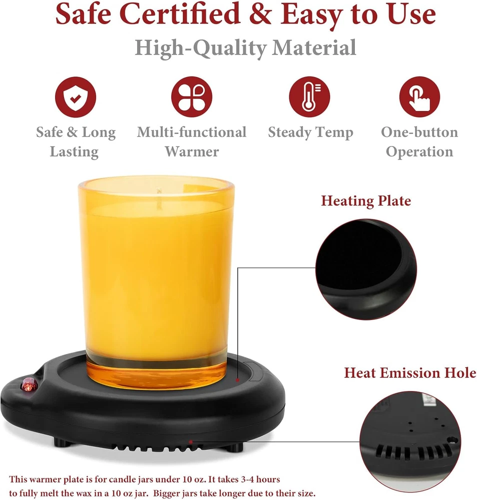 Store New Arrivals Add to Favorite View Feedback Contact Candle Warmer Wax Melter, Warmer Plate for Candle Jar, Wax Cubes Melter, Warmer Plate, Electric Coffee Mug Warmer, Tea or Various Beverages Warmer, for Home, Office Desk, Etc(Black) Description Reusability Reusable Unit Count 1.0 Count Style Compact Number of Items 1 Material Plastic Item Weight 80 Grams Color S-black Pattern Solid Product Dimensions 3.74"W x 5.07"H Country of Origin China Specific Uses For Product Home Item Weight 2.82 ounces Shape Round Material Feature Plastics Age Range (Description) Adult Recommended Uses For Product Home Item model number US0002CW Brand Dialan's Product Care Instructions Can't Wash Manufacturer Dialan's Multiple Functions & Uses: This Wax Cup Warmer is suitable for various sizes of candle cups, so you can easily enjoy your favorite scent; It can also be used to keep warm coffee, tea, milk, and other beverages, whether you're at home or in the office, you'll have a perfect temp drink is waiting for you when you're happy or bored, bringing you warmth from your heart. (Note: Only use for glass, ceramic, metal, or stainless mugs) Lasting & Efficient Use: The Candle Warmer Plate is made of high-quality plastic, the power of this product is 17W, the temp can reach around 270℉ during use, and the heating is stable and durable, it can quickly release a pleasant scent, at room temp of 75°F, it only takes 25-30 minutes can melt 3 wax cubes of about 35.6g, the temp of the melted wax liquid is 170-190°F, so there is no need to worry about being burned. Compact Design & Portable: The diameter of this Coffee Mug Warmer is 3.74inch(9.5cm), small and simple style, plugged in and ready to use, very portable and easy to use, and the 3.6ft(1.1m) long power cord also making you can easily enjoy the fragrance anywhere. And the minimalist style makes it suitable for any corner of your home. Fully Certified & Safe to Use: Our Cup Warmer Plates have ETL and UL certifications, which ensures that the product does not have any safety hazards. There is also no flame and any dust in use, safer than using candle jars with open fire hazards, it's very convenient to use and clean. (Please keep away from children and pets to avoid injury) Perfect Gift for Anyone: The simple and elegant style of the Wax Cubes Melters is the perfect gift for anyone who is important, whether it is Valentine's Day, birthday, or other holidays, so that the other side can get purely relaxed every day, and feel the warmth and love from you every moment. Product Description ABOUT US We offer the best prices around on high quality products. Our E-store includes media such as books, movies, music and games while offering electronics, toys, sporting apparel, clothing, tools, general home, garden items and more. SHIPPING We are always working hard to ensure your package arrives as soon as possible. Please understand that some factors like weather, high postal traffic, and the performance of shipping companies are outside of our control. We offer free shipping to the lower 48 states and ship within 2 business days of payment, usually sooner. We do not accept P.O. Boxes. Please provide a physical address. RETURNS We offer a 30-Day Return Policy on items which you are not completely satisfied with. You have the option for a full-refund or an exchange of the item. No returns are available on items shipped outside of the USA. PAYMENT We accept PayPal. CONTACT US This page content is yet to come Please ad us to your favorite seller and visit again later Thank You CUSTOMER SATISFACTION We try our very best to make sure every customer is completely satisfied. If there's a problem, message us! We're happy to help.