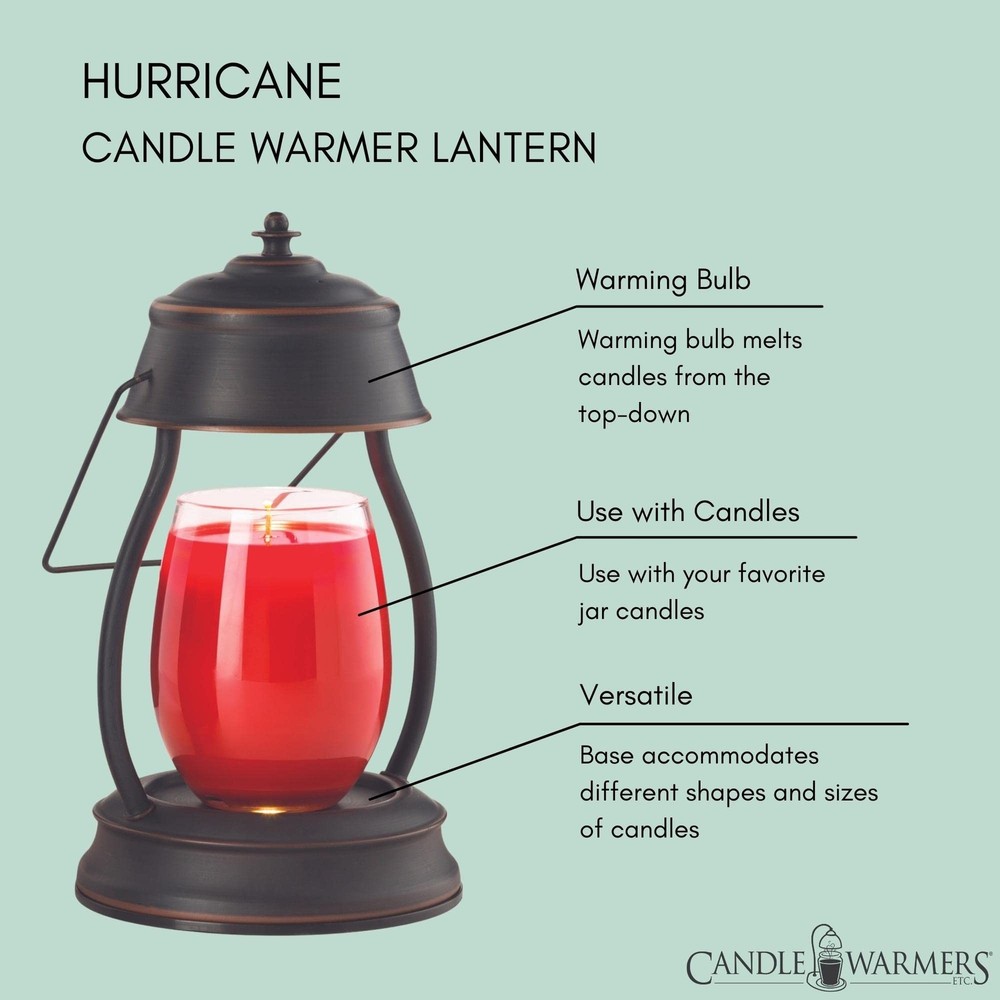 Candle Warmers Etc Hurricane Candle Warmer Lantern For Top-Down Candle Melting, Oil Rubbed Bronze Product Details Color: Hurricane Oil Rubbed Bronze Material: Iron Brand: Candle Warmers Product Dimensions: 7.2"L x 7.2"W x 11.5"H Finish Type: Oil Rubbed Color: Hurricane Oil Rubbed Bronze Material: Iron Brand: Candle Warmers Product Dimensions: 7.2"L x 7.2"W x 11.5"H Finish Type: Oil Rubbed Item Weight: 0.01 Ounces Number of Pieces: 1 Theme: Wedding Item Diameter: 3.88 Inches Mounting Type: Tabletop Manufacturer: Candle Warmers UPC: 739485657286 833245000548 Global Trade Identification Number: 48 Indoor/Outdoor Usage: Indoor Item Weight: 0.01 ounces Department: Mens Item model number: HLORB Is Discontinued By Manufacturer: No Volume: 1 Milliliters Finish types: Oil Rubbed Perfume: scented Batteries required: No A WELCOME CHANGE IN TODAY'S CANDLE-BURNING - Revolutionary patented lamp illuminates and melts the top of the candle to quickly and safely release the candle's fragrance; It provides a sweet-smelling ambiance to your home A SAFE WAY TO DIFFUSE THE FRAGRANCE - Eliminates fire hazard, smoke damage, and indoor pollution caused by burning candles indoors; It gives peace of mind and a scented home STYLISH AND VERSATILE - Pedestal base accommodates different sizes and shapes of candles; It gives style and versatility a whole new meaning CREATES AN AROMATIC AMBIANCE - Soft Halogen light creates the ambiance of a burning candle and the scent of your favorite candle sets the mood right; Make your home feel like home with Candle Warmers Etc. Hurricane Candle Warmer Lantern MADE OF QUALITY MATERIALS - Made of heavy duty metal; environmentally safe and friendly; Candle Warmers Etc. Hurricane Candle Warmer Lantern uses Rocker Switch, a NP5 Candle Warmers Etc. replacement bulb and an electric rating of 120V, 60Hz, 25W.