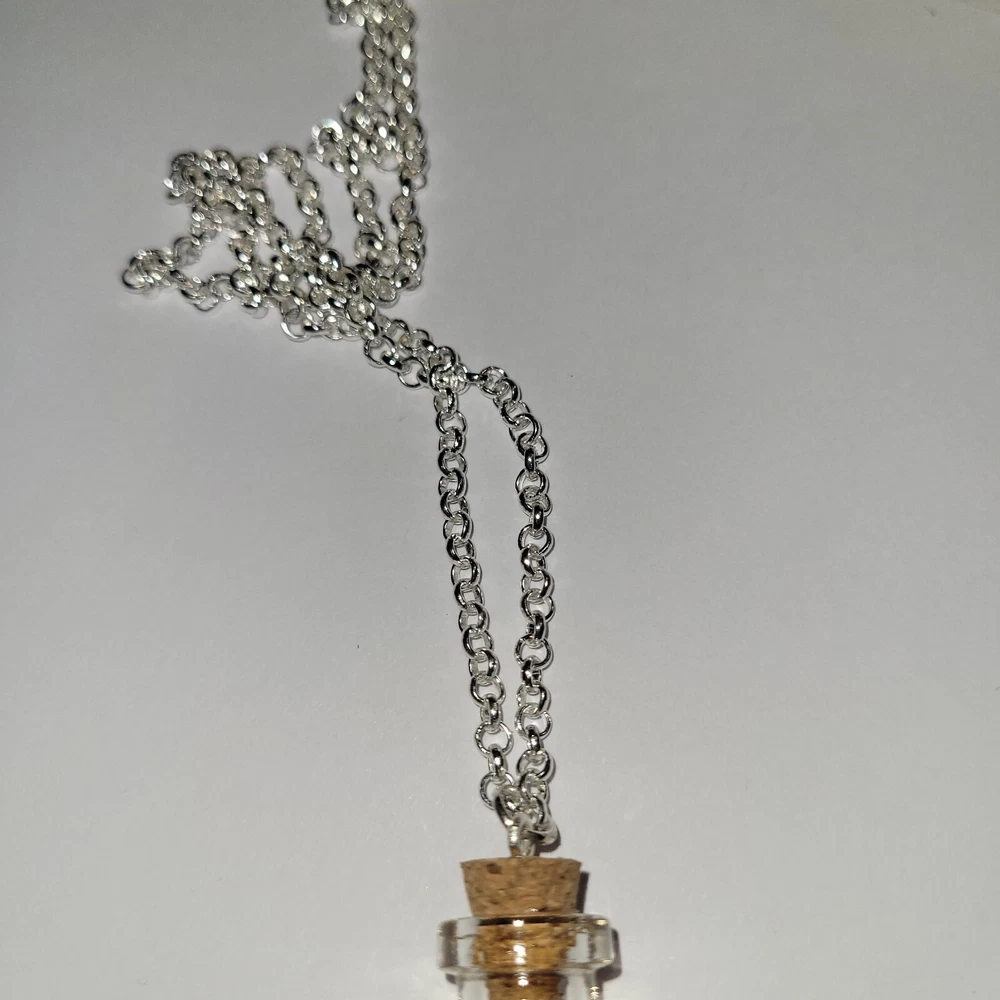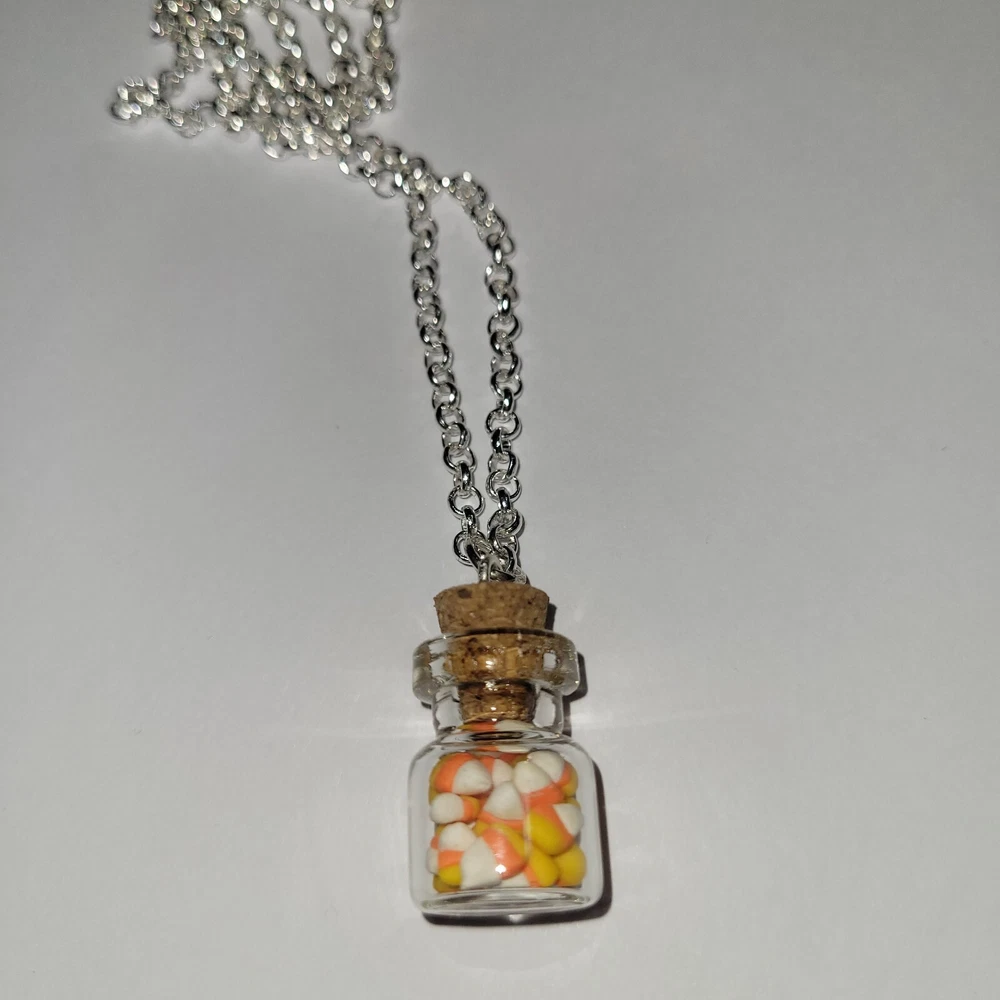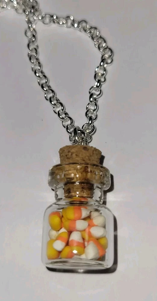 This unique necklace is perfect for the Halloween season with its candy corn design. The bottle charm hangs from a 20-inch silver chain. The charm is handmade and features a spooky Halloween theme. The necklace is a great addition to any jewelry collection and can be worn by women of all ages. It is a perfect accessory for any Halloween outfit. The necklace is made in the United States and is of high quality.
