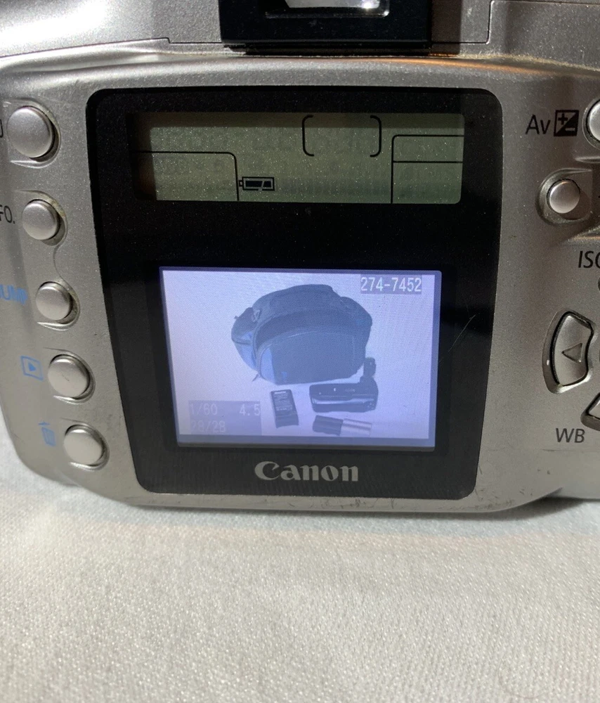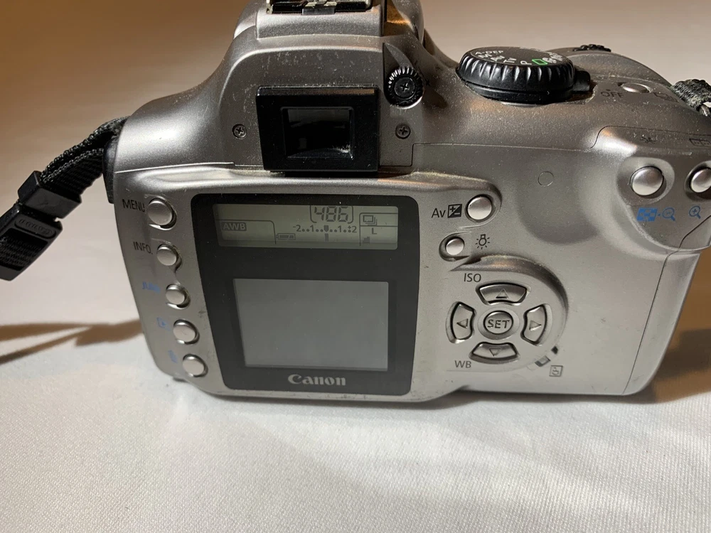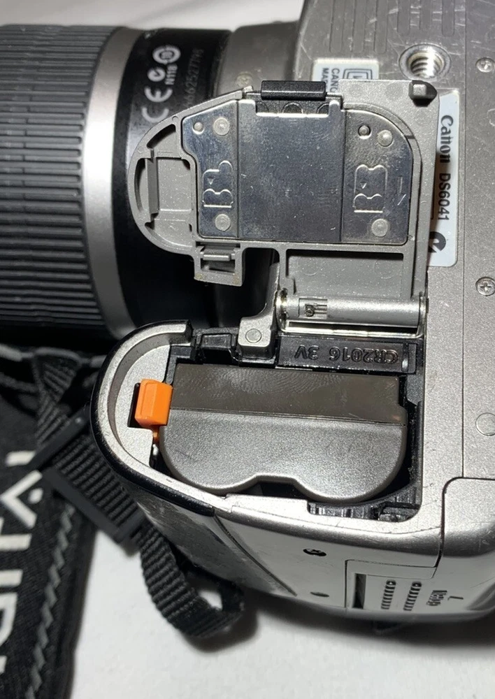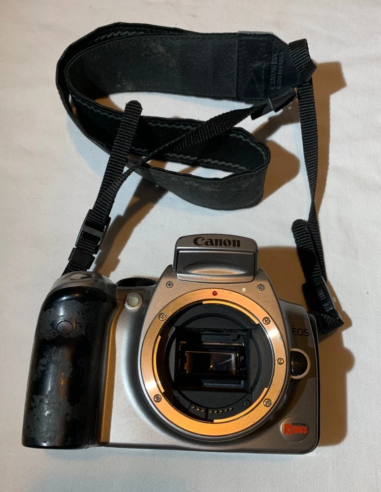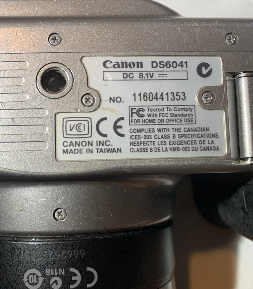 Color: Silver Type: Digital SLR Model: Canon DS6041 Digital Rebel EOS Country/Region of Manufacture: Taiwan Features: AE/FE Lock, AF Lock, Auto Focus, Built-in Flash Maximum Resolution: 6.3 MP Brand: Canon Battery Type: Lithium-Ion Screen Size: 1.8 in Series: Canon EOS