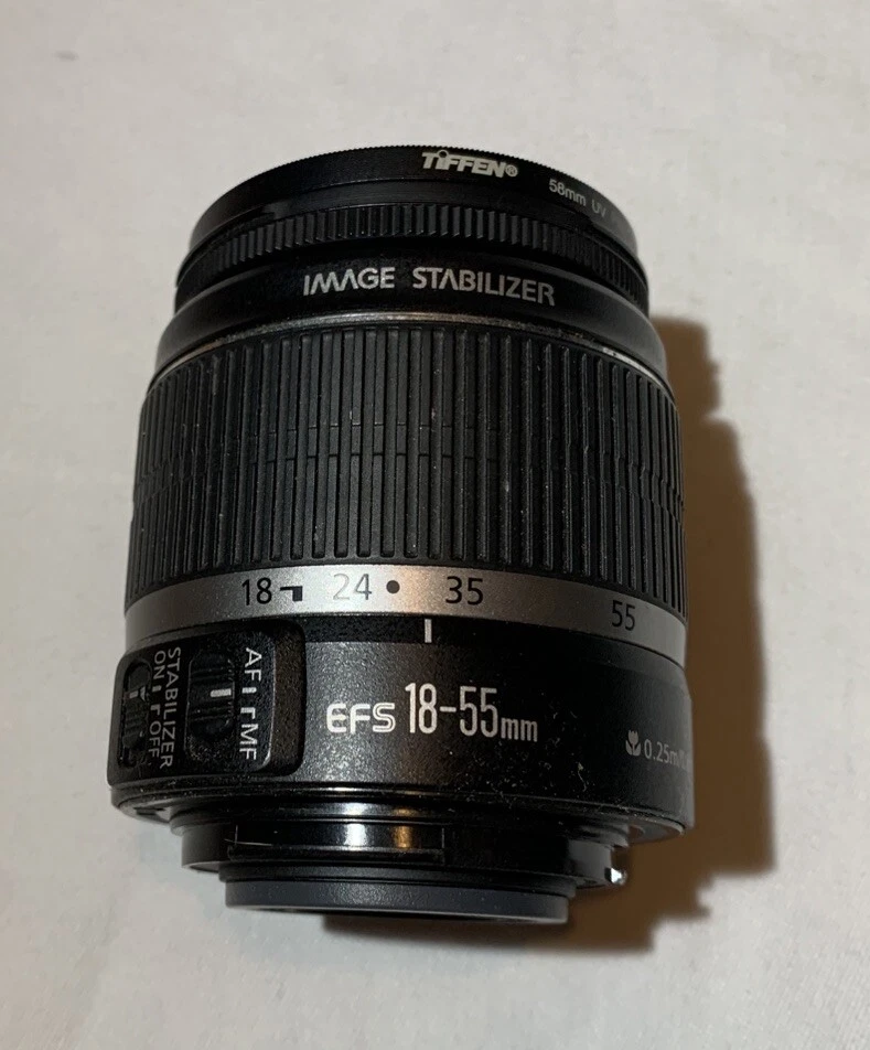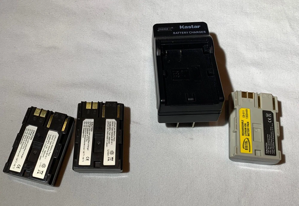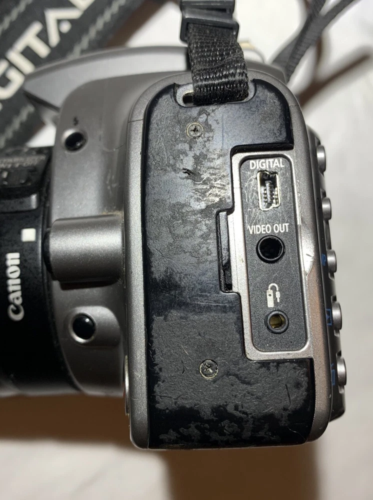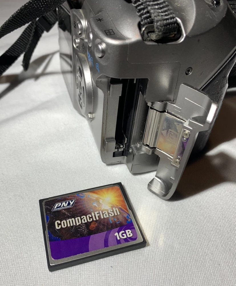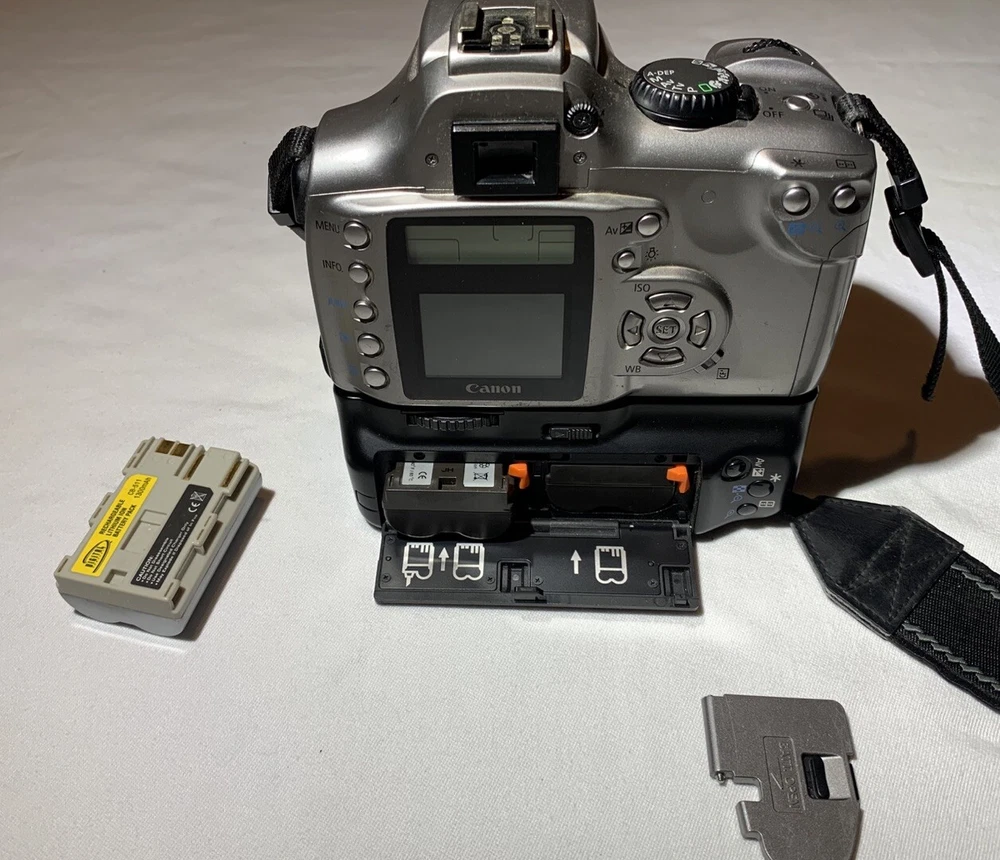 Canon 300D DS6041 DLSR Digital Camera. Features include 6.3 Megapixel sensor as well as flash, autofocus, and 1.8inch viewing screen. Bundle includes zoom lens with autofocus, 3 batteries, double battery holder, carrying case, 1GB CompactFlash memory card, and battery charger. Fully tested and in good used condition. Scuffs and wear from normal use. The rubber handles are well worn but do not affect usability. Batteries have all been charged and function but have unknown life left.