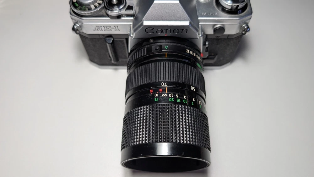 Canon AE-1 in great condition with minimal cosmetic wear. Everything works great. Selling because I bought a Nokon FE2. Had a great time with this camera. Great camera for beginners , very forgiving. Lenses for this camera are affordable since so many were built back then. Works with FD mount , converters for other mounts are available. Included lens is a Canon Zoom lens FD 35-70mm 1:4 , very versatile. Rings work smoothly, also has an automatic mode. I recommend getting a 50 and 28mm prime lens to round out the kit.