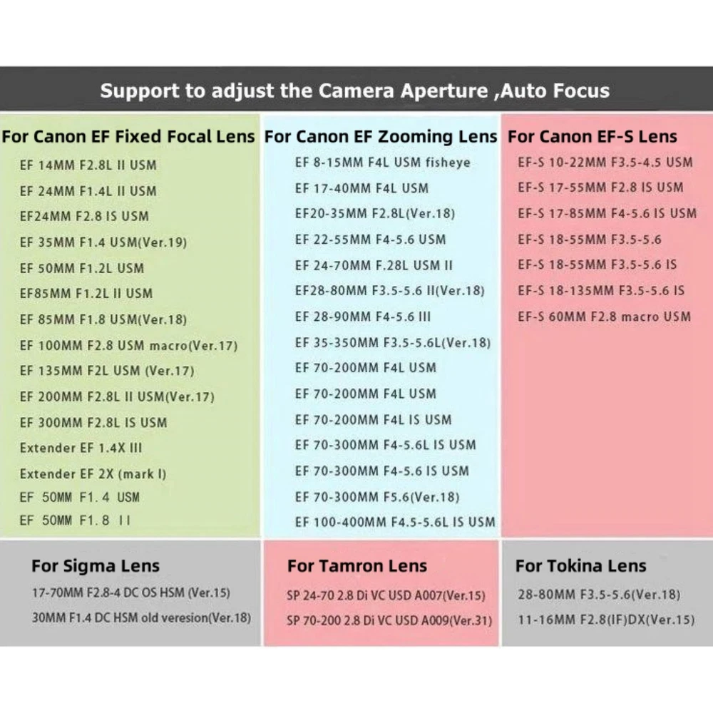 Product Description Auto Focus Lens Mount Adapter For Canon EF EF-S For Sony NEX E Mount Camera Features: Cross-Compatibility for Enhanced Lens Options: It bridges the gap between for Canon's EF series lenses and for Sony's NEX E-mount cameras, allowing photographers to leverage their existing for Canon lens collection or explore a wider range of lenses from the EF lineup, unlocking new creative possibilities and enhancing the versatility of your for Sony NEX camera. Full-Frame Support for Sony A7/A7R Series: Designed with a full-frame aperture hole, it perfectly aligns with for Sony's full-frame mirrorless cameras, ensuring optimal performance, clarity, and image quality when using EF lenses on these high-end cameras. Gold-Plated Pins for Exceptional Conductivity: Featuring gold-plated pins for signal transmission, it provides superior electrical conductivity, minimizing signal loss and maximizing performance, especially during fast-paced or demanding shooting scenarios. Comprehensive Camera Function Support: It supports slow auto-focus, TTL metering, automatic exposure, and automatic aperture control, enabling seamless integration with your for Sony NEX camera and ensuring that you can capture stunning images with ease. Built-In Anti-Shake Function: Incorporating an anti-shake function, it helps to minimize blur and enhance image stability, even in low-light or handheld shooting conditions, making it particularly useful for capturing sharp, clear images. Quick Lens Release Mechanism: Equipped with a lens release lever, it allows for quick and easy lens attachment and detachment, saving time and ensuring a secure and hassle-free lens changing experience. Tripod Mount for Added Stability: Including a 1/4-inch screw mount, it can be securely attached to a tripod or other camera support systems, providing additional stability and allowing you to shoot with confidence, even in challenging environments or with heavy lenses. Innovative autofocus technology: With its revolutionary design, the EF-NEXII adapter is the first to achieve autofocus between the E mount and the EF mount, completely breaking the boundaries between brand and system. Specifications: Model: EF-NEXII Color: Black Material: Aluminium alloy Compatible lens: For Canon EF series lens Compatible cameras: For Sony NEX E Mount Camera (Including for Sony NEX full-frame camera A7/A7R) Front mount: For Canon EF mount Lens Rear mount: For Sony NEX E mount Camera Tripod screw: 1/4 screw Size: 8*6.5*3cm / 3.1*2.6*1.2in Package Included: 1 * Lens Mount Adapter Shipping Returns Contact Us Payment 1. Items sent from US warehouse. 2.Receiving time = Processing time + Shipping time 3. Processing Time: Around 1-2 business Days 4. Shipping Time: 3-5 business day it may have a little delay during some holiday (such as Christmas),any problem ,please feel free to contact 1. 30 days warranty from the purchased date. Please contact us via email before returning the defective item. 2.Our warranty does not extended to any product that are physically damaged or that are not under normal operating conditions as result of misuse or improper installation on the buyer/user's part. 3.Return items should include the original packaging and all accessories. buyers MUST contact us for the returning address. 4.In all cases, buyers pay shipping fees at their own cost to return products for exchange or refund. We will be responsible for the postage of replacements. Refund will be made upon receipt of the returned item. Pls contact us if you have any problems,we will try our best to solve for you We accept all verified payment from eBay. Shipping 1. Items sent from US warehouse. 2.Receiving time = Processing time + Shipping time 3. Processing Time: Around 1-2 business Days 4. Shipping Time: 3-5 business day it may have a little delay during some holiday (such as Christmas),any problem ,please feel free to contact Returns 1. 30 days warranty from the purchased date. Please contact us via email before returning the defective item. 2.Our warranty does not extended to any product that are physically damaged or that are not under normal operating conditions as result of misuse or improper installation on the buyer/user's part. 3.Return items should include the original packaging and all accessories. buyers MUST contact us for the returning address. 4.In all cases, buyers pay shipping fees at their own cost to return products for exchange or refund. We will be responsible for the postage of replacements. Refund will be made upon receipt of the returned item. Contact Us Pls contact us if you have any problems,we will try our best to solve for you Payment We accept all verified payment from eBay. You may also like Watch Crystal Glass Sapphire Bubble Magnifier Calendar Lens Small Date Window 10.66 USD Repair LCD Screen Hinge Flex Cable For Canon PowerShot G7X Mark II G7 X II G7X2 12.75 USD Storage Case Travel Carrying Bag For Bose SoundLink 3 SoundLink III Speaker 20.0 USD New Industrial USB To RS485 Converter Upgrade Protection RS-485 A Connector 11.65 USD TV Remote Control Controller For Bose Solo 5 TV Soundbar System 535 AUX1 CM525 16.49 USD 3.49 USD N9 MINI GSM AUDIO LISTENING BUG 2x SENSITIVE MICROPHONE Two-Way Ear Bug Device 14.29 USD 3.49 USD powered by