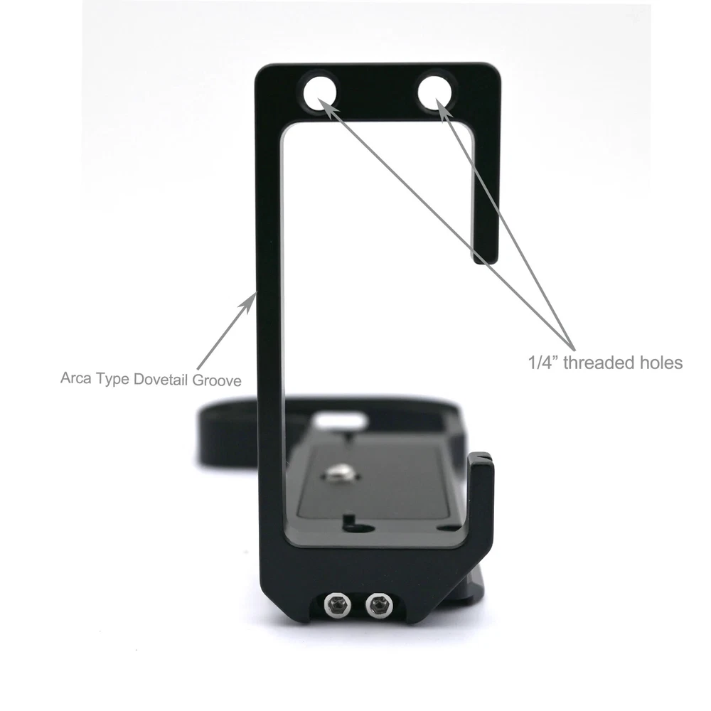 The EOS R5 Mark II Quick Release Vertical Arca Plate is designed for photographers who demand precision and versatility. This expertly crafted plate is tailored specifically for the EOS R5 Mark II, ensuring a perfect fit and seamless integration with your camera. Key Features: 1.Providing maximum stability and support while maintaining easy access to all camera functions. 2.Features a standard Arca-Swiss dovetail design, allowing for quick attachment to tripod heads and other accessories, making transitions between horizontal and vertical shooting effortless. 3.Made from high-quality aluminum materials, this plate is built to withstand the rigors of professional use while remaining lightweight and easy to carry. 4.Ergonomically designed for improved handling, ensuring a secure grip for comfortable shooting during long sessions. It includes multiple 1/4"-20 threaded holes for attaching additional accessories, such as external monitors or lights, giving you the flexibility to customize your setup. Whether you’re capturing stunning landscapes, dynamic portraits, or fast-paced action, this vertical Arca Plate is your essential companion for stable, precise, and creative photography.