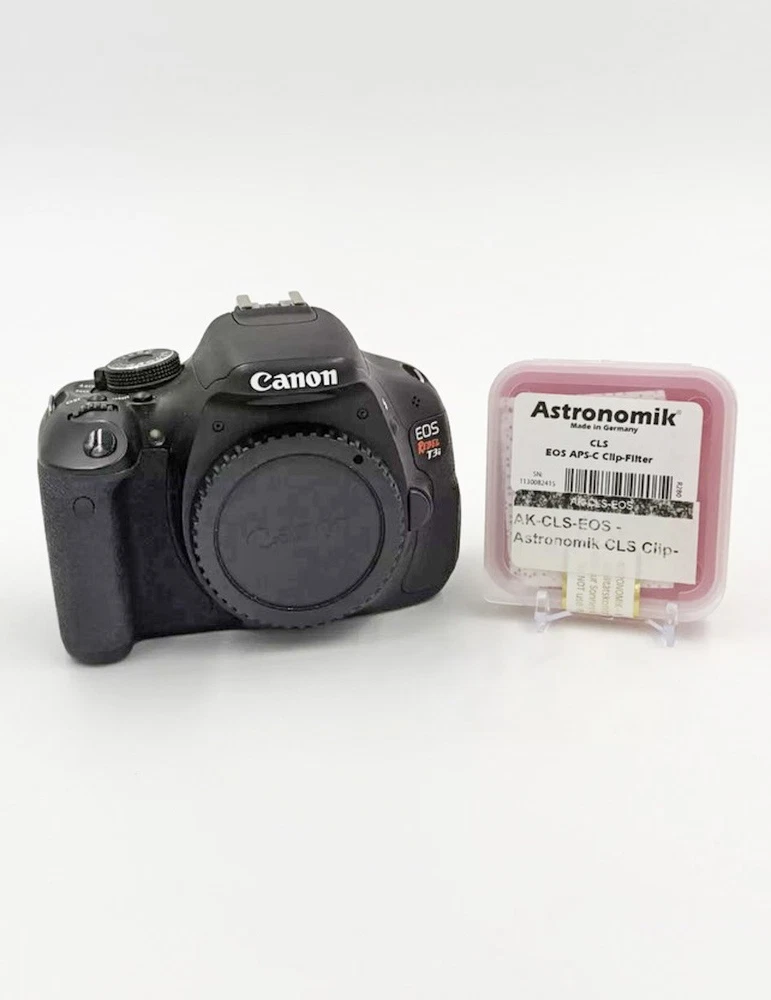 The Ultimate Astro Photography Kit – Ready to Go! Capture the wonders of the night sky with this fully equipped Canon EOS Rebel T3i. This 18.0MP Digital SLR camera is designed to meet the needs of astrophotographers, whether you’re a seasoned stargazer or just starting out. Here’s why this kit is the perfect choice for astrophotography: • High-Resolution Imaging: With its 18.0MP sensor and maximum resolution, the Canon EOS Rebel T3i delivers stunningly detailed photos of celestial objects, from distant galaxies to vibrant nebulae. • Astronomik EOS Clip-In Filter Installed: The pre-installed Astronomik EOS filter is specifically designed for astrophotography. It enhances light transmission in key wavelengths, blocking unwanted light pollution while improving the contrast and color accuracy of stars and other celestial objects. • Wide Aperture Capability: Paired with a lens that features a maximum aperture of f/3.5, this camera allows for better light gathering, crucial for capturing faint details in low-light conditions. • User-Friendly Features: The camera’s auto focus and 3-inch articulating screen make it easy to frame and focus on your target, whether it’s the moon, planets, or deep-sky objects. The screen’s flexibility ensures you can comfortably shoot from any angle, even with your telescope mounted. • Versatile Connectivity: With USB and HDMI connectivity, you can easily connect the camera to your computer or external monitor for quick image transfers or live previews—perfect for real-time tracking and adjustments during your astrophotography sessions. • Compact and Lightweight: As part of the Canon EOS Rebel series, this camera combines portability with performance, making it ideal for on-the-go stargazing adventures. • 3x Optical Zoom: Perfect for framing the perfect shot without compromising image quality, whether you’re shooting wide-field views of constellations or zooming in for detailed lunar photography. • Ready for Telescope Integration: The Canon EOS Rebel T3i is compatible with most telescope adapters, allowing you to use it for prime focus astrophotography and take full advantage of your telescope’s optics. Whether you’re capturing breathtaking images of the Milky Way, photographing meteor showers, or exploring the craters of the moon, this kit is ready to deliver exceptional results straight out of the box. Don’t miss your chance to own the ultimate astrophotography setup!