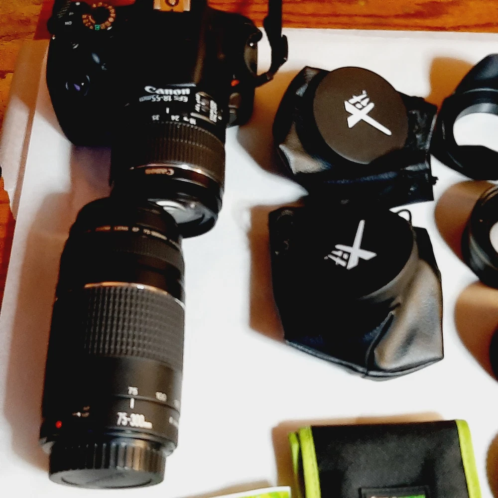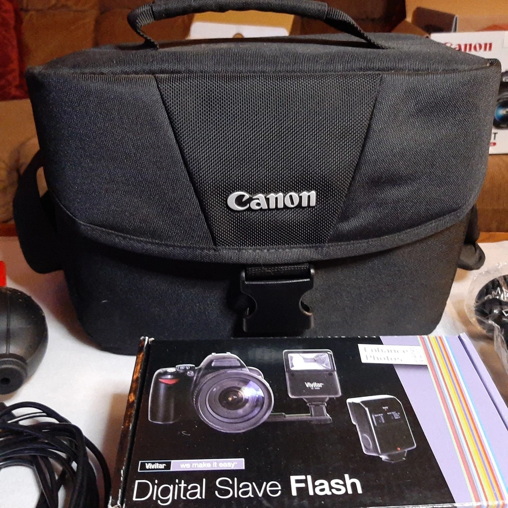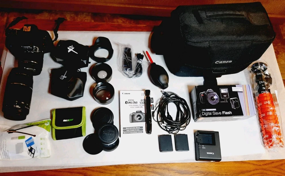 HUGE Canon EOS Rebel T6 18MP Digital SLR Camera Lot w/ Lenses Flash Accessories Everything in great condition - lightly used with little to no signs of use or wear; some include original boxes Comes with everything pictured, including but not limited to: Camera Bag Flash Lenses Three piece filter set Extra battery Cords Two tripods - one mini and one larger Remote shutter control Instruction manual