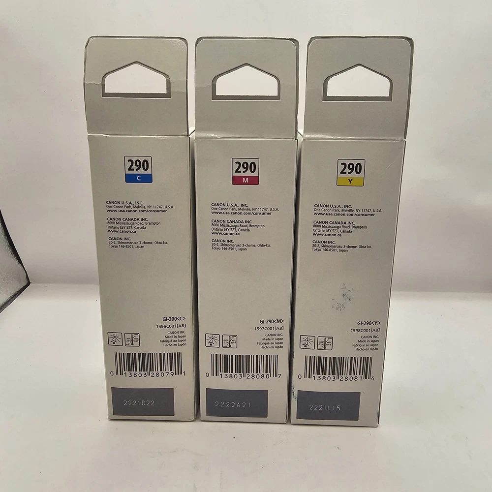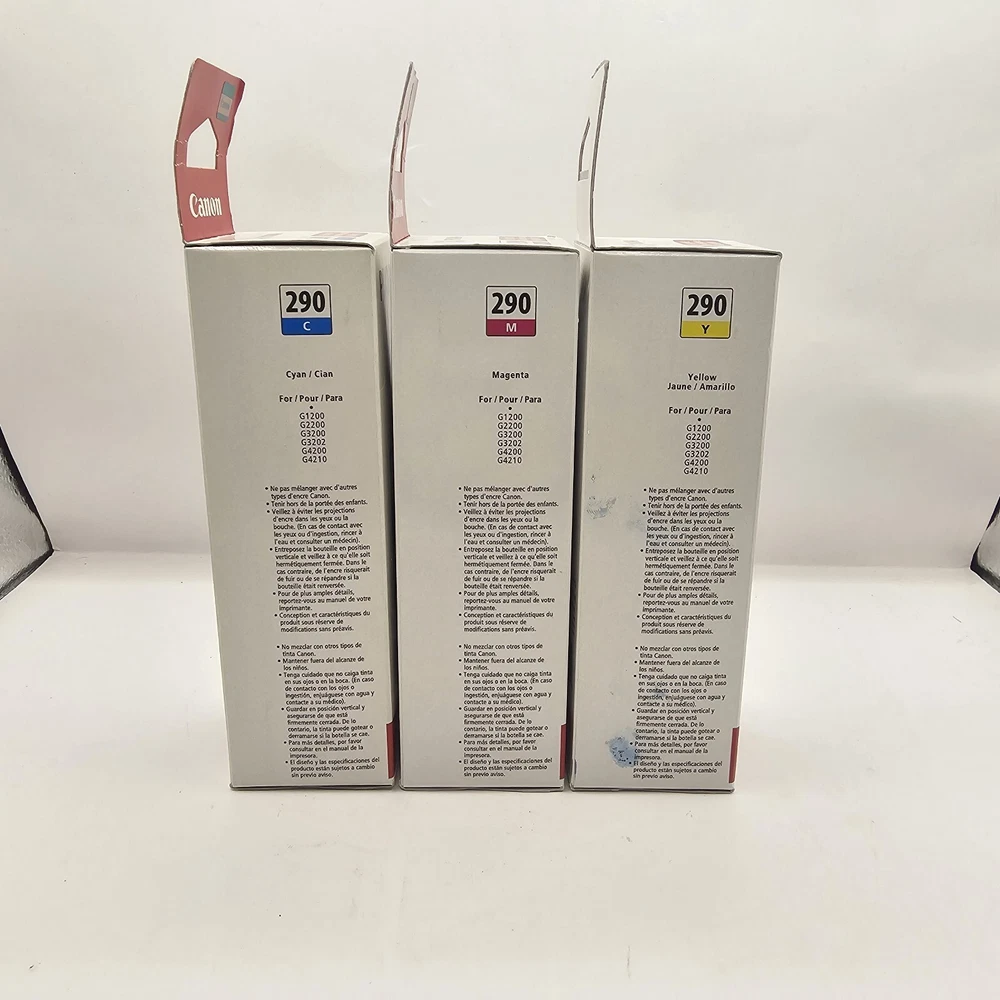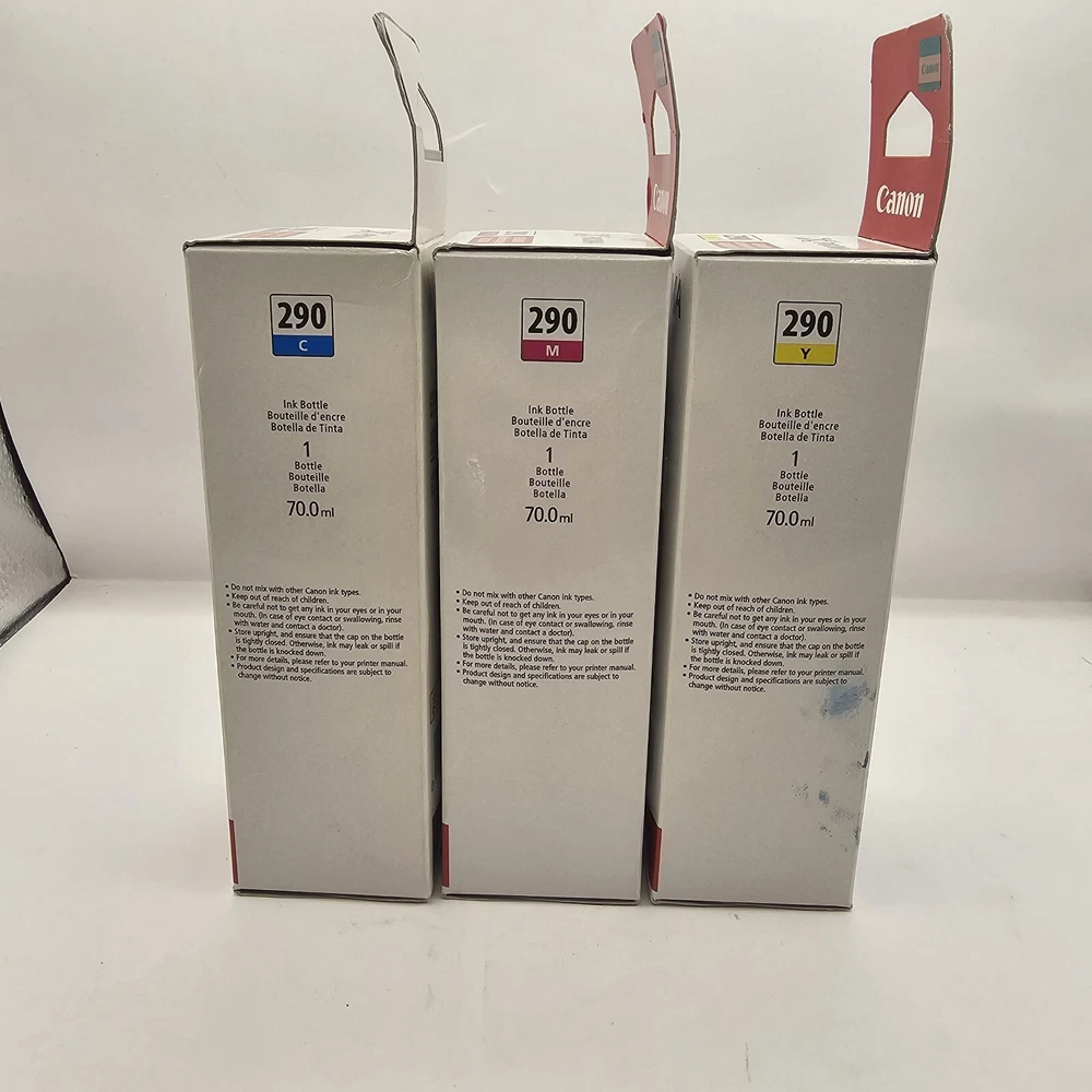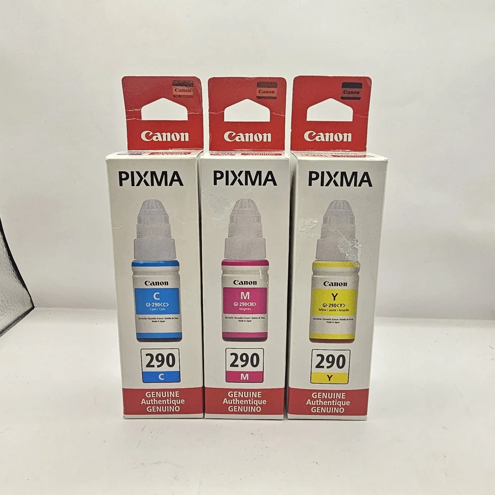 Canon Genuine MegaTank Refills GI-290 Cyan Magenta Yellow Ink Cartridges OEM Some damage to boxes but ink is still sealed.
