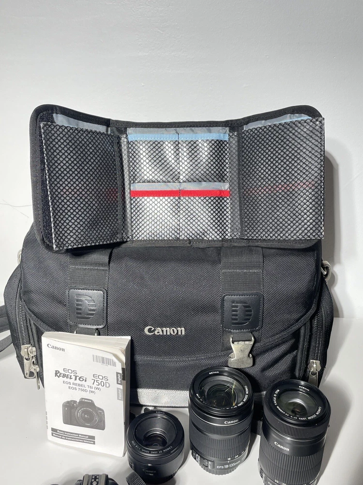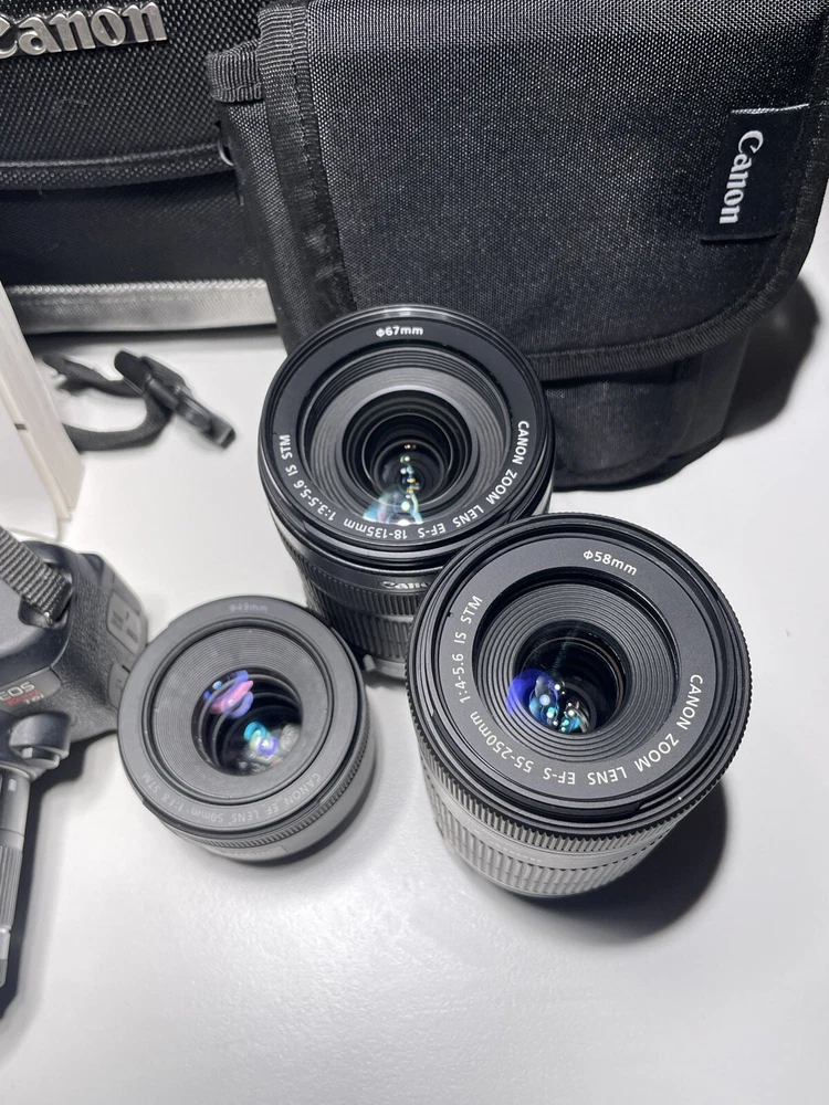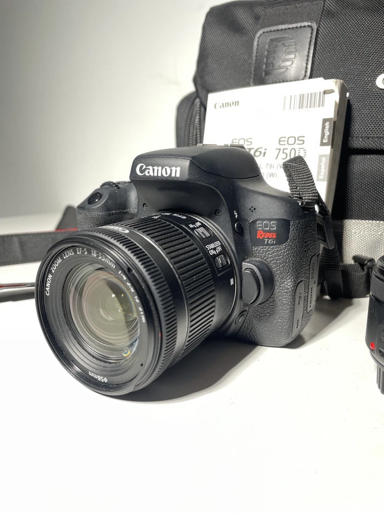 Canon T6i kit with four lenses, sturdy case, charger (not pictured) and instructions booklet. I purchased this new about two years ago and hardly used it (I mostly shoot analog). It has been very well maintained in a smoke free home. This kit would be great for any beginner, hobbiest or professional photographer! The lenses are; EF 50mm 1.8 (AMAZING lens.) EF-S 18-55mm 1:4-5.6 EF-S 18-135mm 1:3.5-5.6 EF-S 55-250 1:4-5.6 I have years of professional experience in camera sales, don’t hesitate to reach out with any questions. Willing to ship, let me know. Happy holidays! (PS - This model is listed on Amazon with only ONE lens for $799)