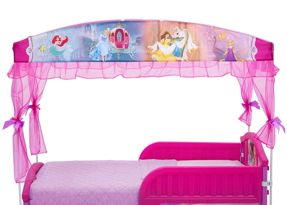Recommended for ages 15 months and up Easy assembly certified to meet or exceed all safety standards set by the CPSC & ASTM JPMA certified Create a fairy-tale bedroom with this Disney Princess Canopy Toddler Bed from Delta Children. Designed in bold shades of pink with enchanting decals and graphics of Cinderella, Belle, Ariel and Rapunzel, this sturdy kids' bed topped with a sheer organza canopy will make bedtime a royal affair. Finished with two attached guardrails to help keep your little one from falling out of bed while sleeping, the Disney Princess Canopy Toddler Bed by Delta Children provides the independence your child is seeking, while keeping them safe all night long. This bed will magically transform your little one into a sleeping princess each and every night. About Disney Princesses: From royal castles to happily ever after, the Disney Princesses evoke the stories girls love to dream about. Belle, Ariel and Cinderella are just a few of the famous princess depicted on the Princess-inspired chairs, beds, toy storage and more from Delta Children. Shipping Dimensions (W x H x D): 17.32 x 5.31 x 30.51 inches.