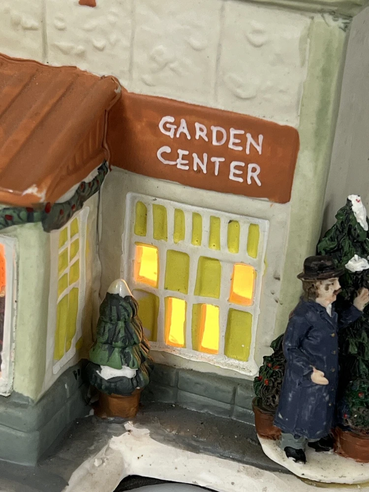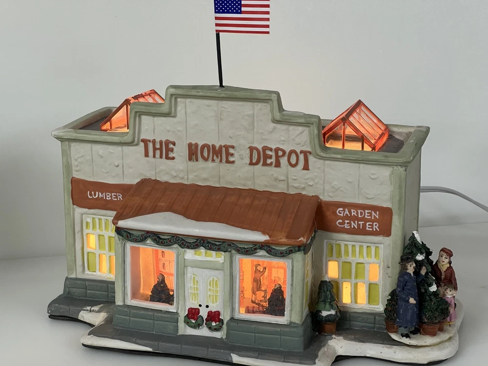 This Home Accents Christmas Village House depicts "The Home Depot Store" with a whimsical design. Made of porcelain, it features an illuminated 3D effect, suitable for seasonal display. The medium-sized house measures 10" in length, 7" in height, and 5 3/4" in width. Part of the limited edition "The Home Depot Store" collection from 2012, it is a festive addition to any room during the holiday season. No original box , comes with cord & light