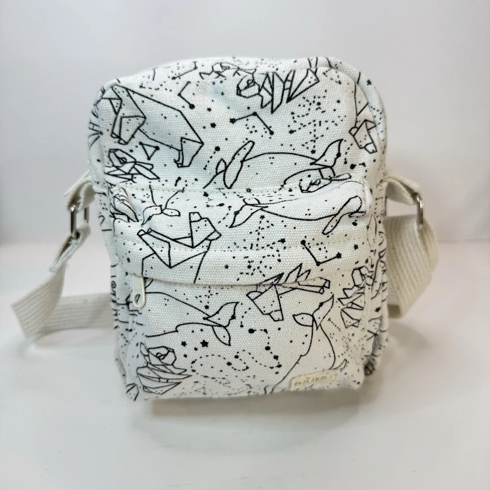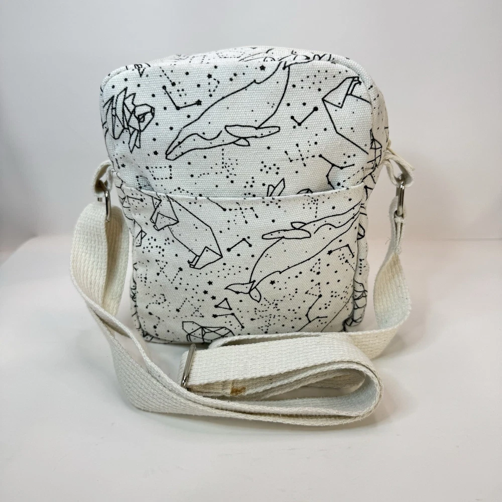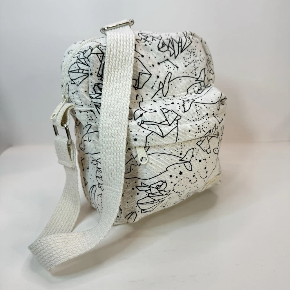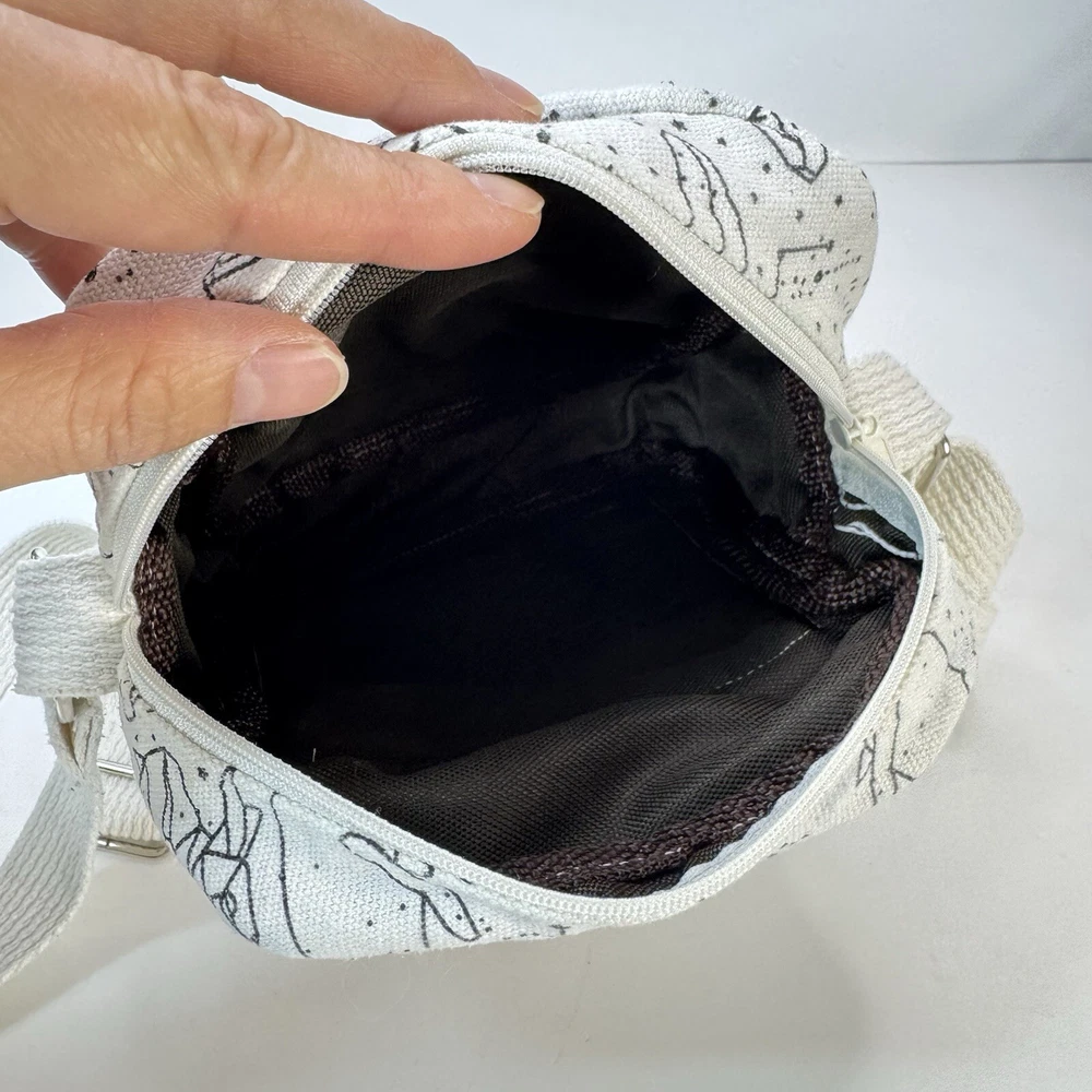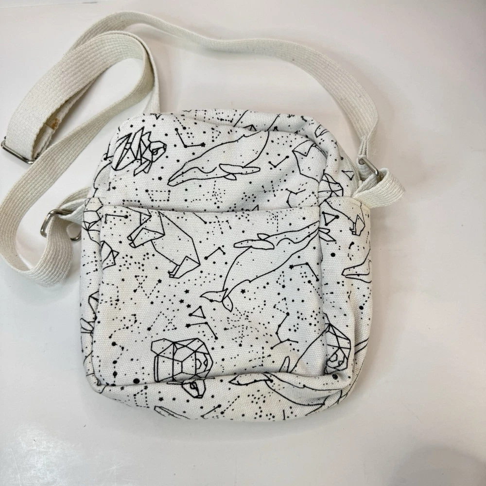 This crossbody bag is perfect for any occasion, whether it's for travel or just for casual use. The adorable animal print design features polar bears and a whale bear in a natural white color with silver hardware accents. The adjustable canvas strap and top handle in ivory add to the bag's functionality and style. The bag has a spacious interior lined with brown cotton and includes accessories such as a key. The fleece fabric type and polyester exterior material make it durable and comfortable to use. This crossbody bag is a must-have for any fashion-forward woman who loves animals and cartoons. Good used condition. Please see photos for wear and tear. There are two small marks on the strap that didn’t come out with washing.