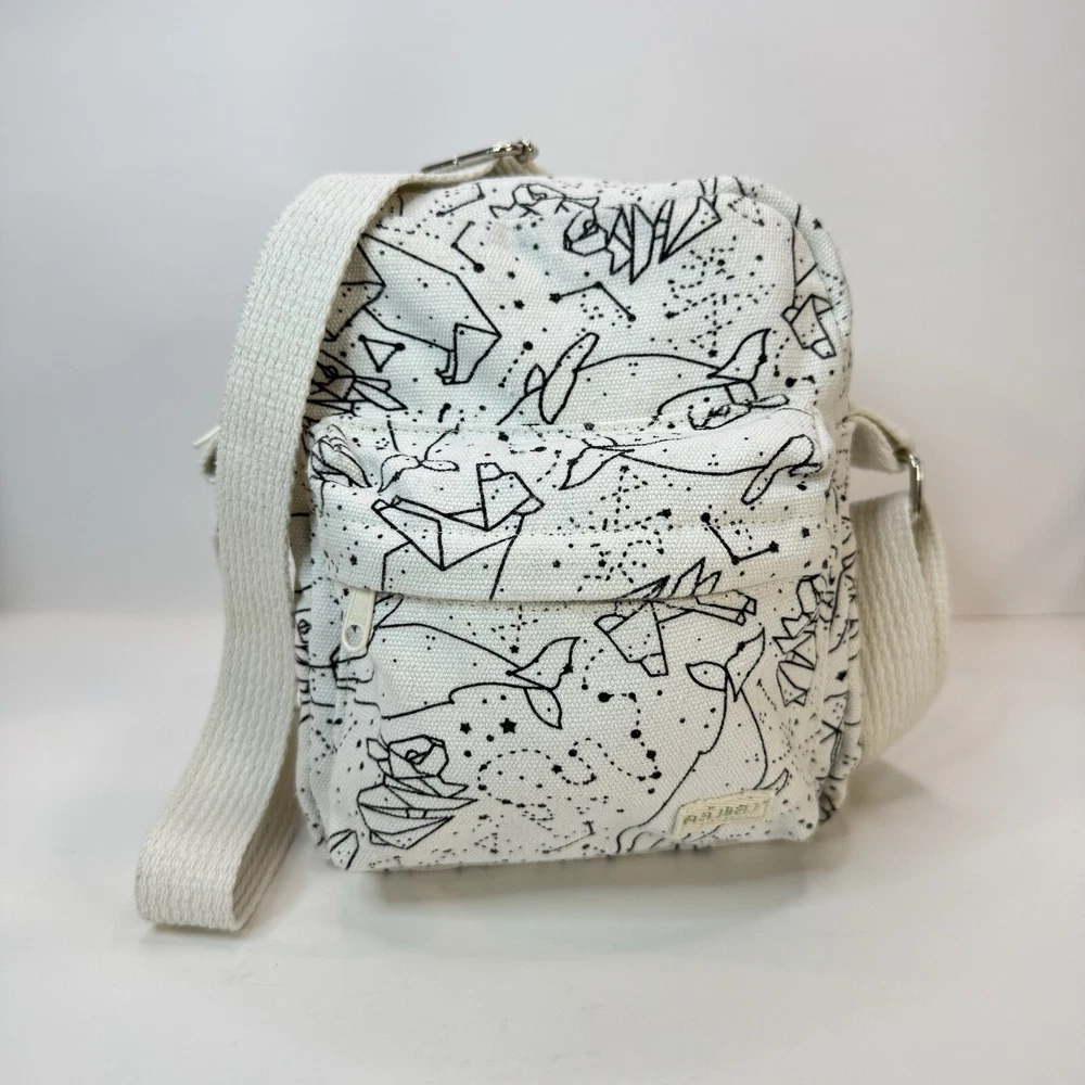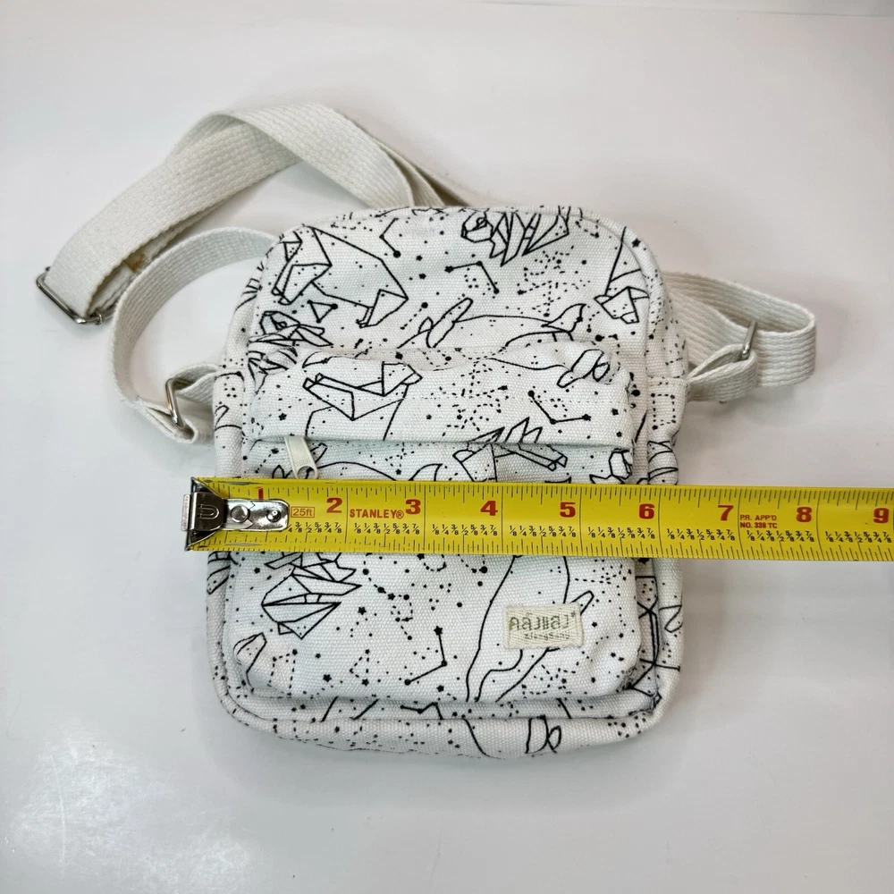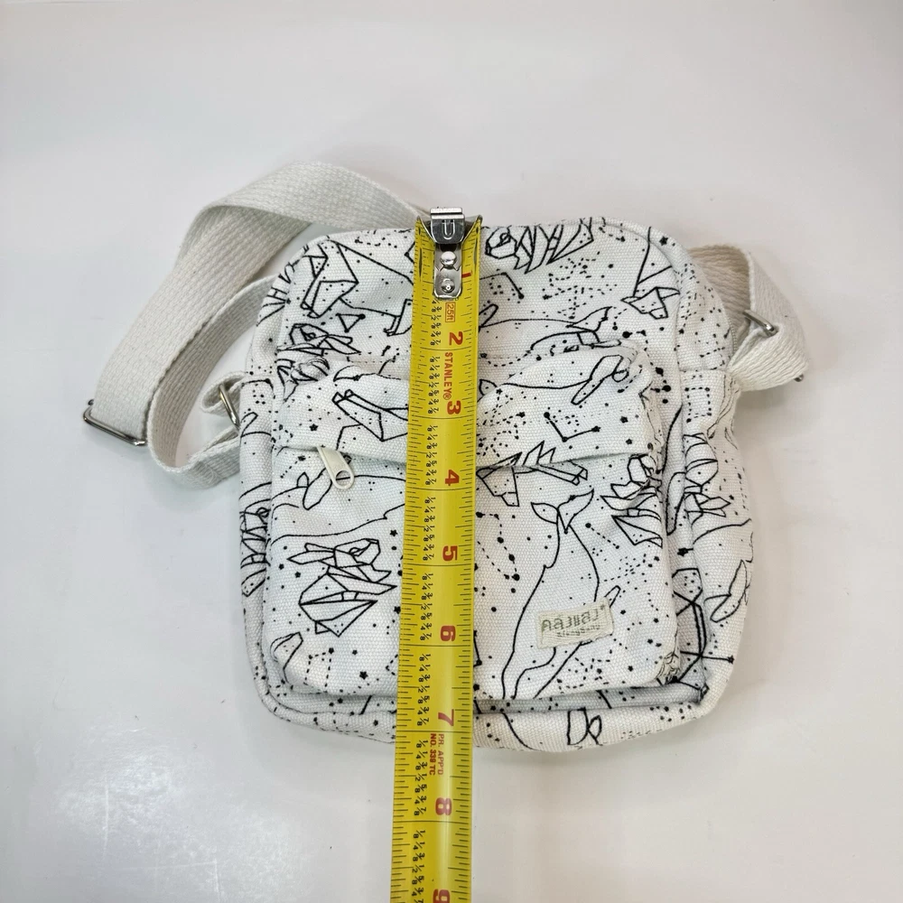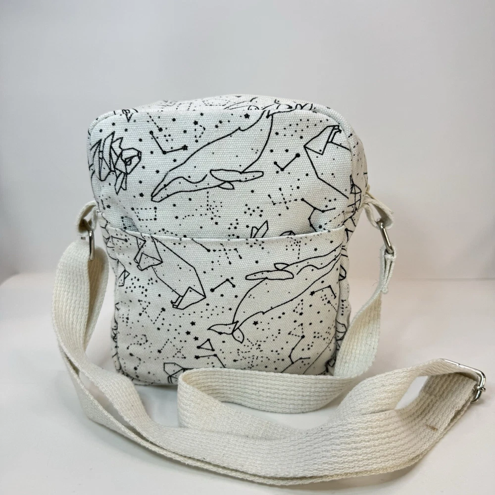 This crossbody bag is perfect for any occasion, whether it's for travel or just for casual use. The adorable animal print design features polar bears and a whale bear in a natural white color with silver hardware accents. The adjustable canvas strap and top handle in ivory add to the bag's functionality and style. The bag has a spacious interior lined with brown cotton and includes accessories such as a key. The fleece fabric type and polyester exterior material make it durable and comfortable to use. This crossbody bag is a must-have for any fashion-forward woman who loves animals and cartoons. Good used condition. Please see photos for wear and tear. There are two small marks on the strap that didn’t come out with washing.