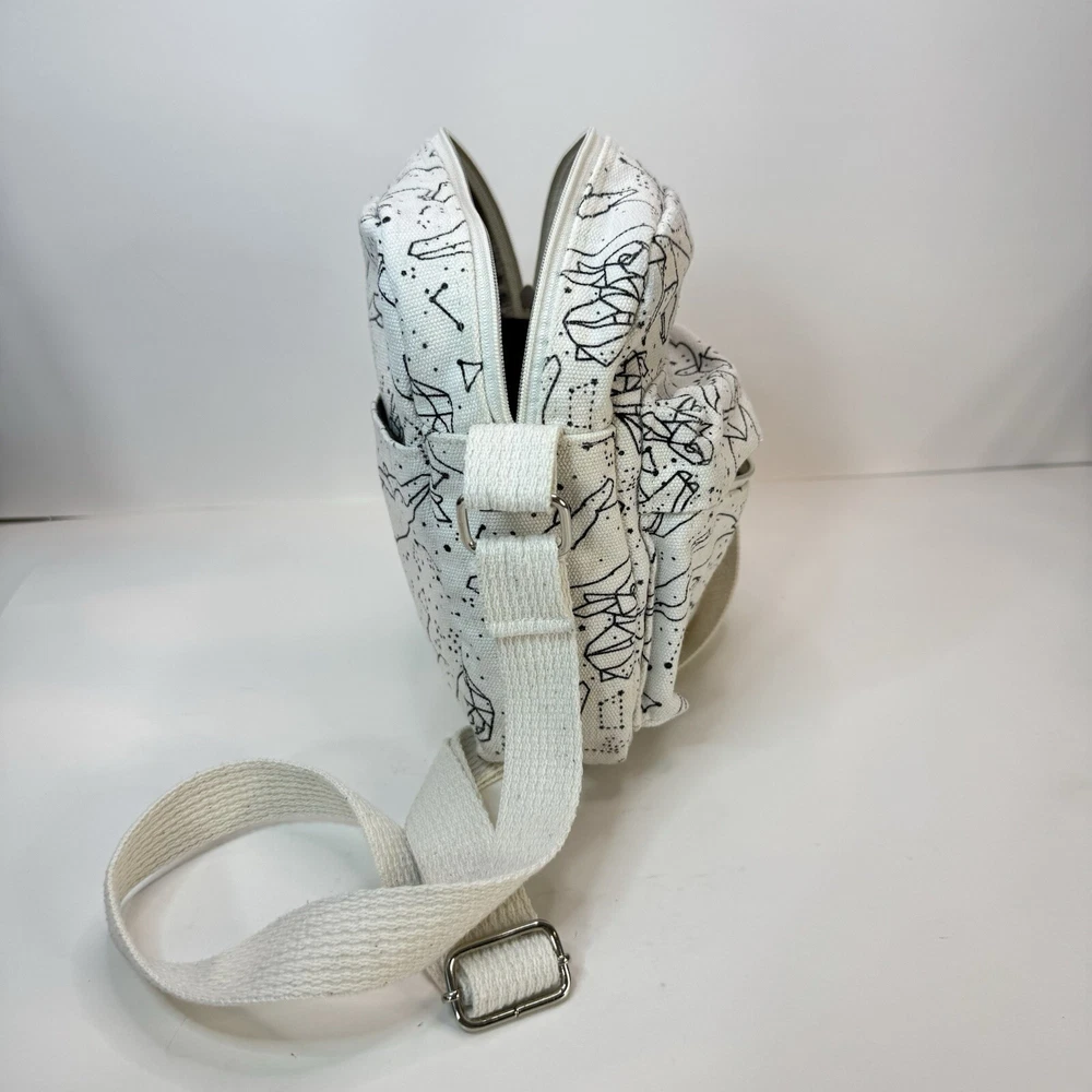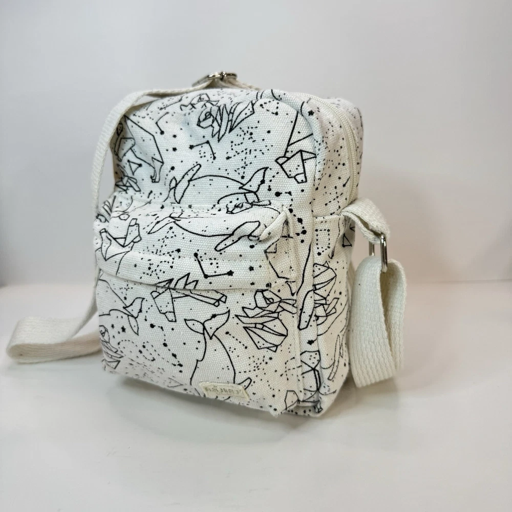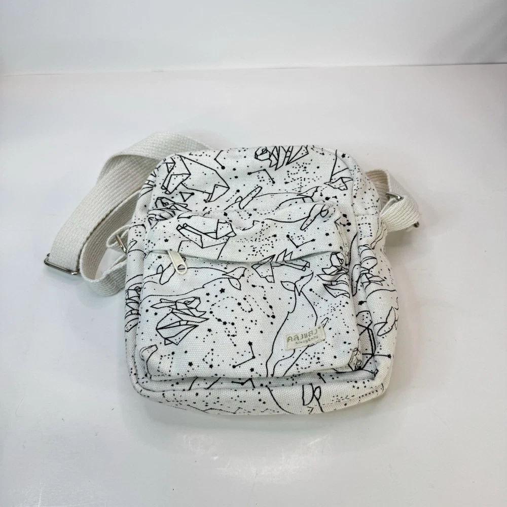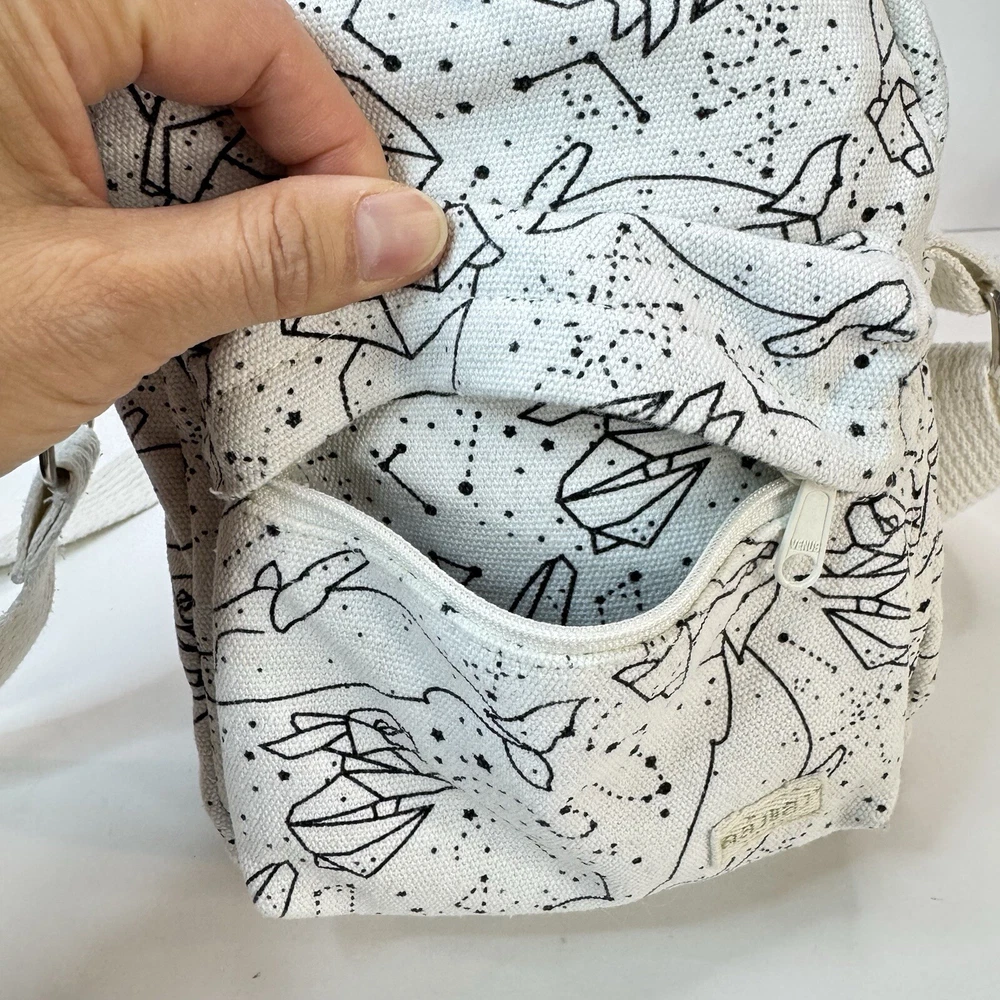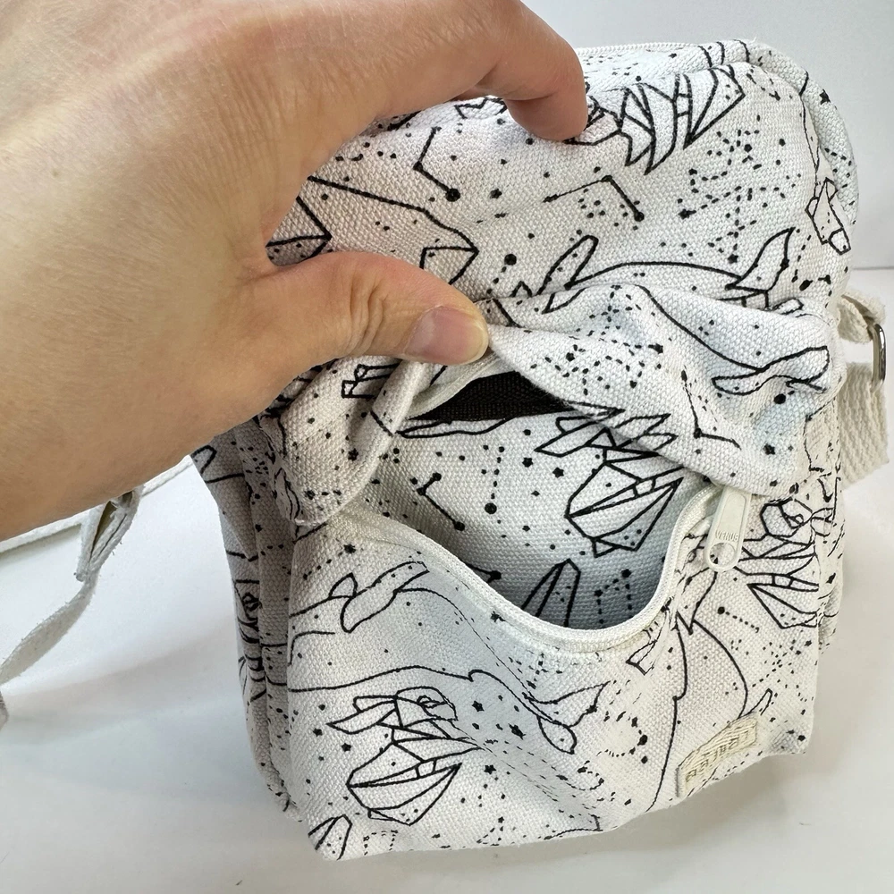 This crossbody bag is perfect for any occasion, whether it's for travel or just for casual use. The adorable animal print design features polar bears and a whale bear in a natural white color with silver hardware accents. The adjustable canvas strap and top handle in ivory add to the bag's functionality and style. The bag has a spacious interior lined with brown cotton and includes accessories such as a key. The fleece fabric type and polyester exterior material make it durable and comfortable to use. This crossbody bag is a must-have for any fashion-forward woman who loves animals and cartoons. Good used condition. Please see photos for wear and tear. There are two small marks on the strap that didn’t come out with washing.