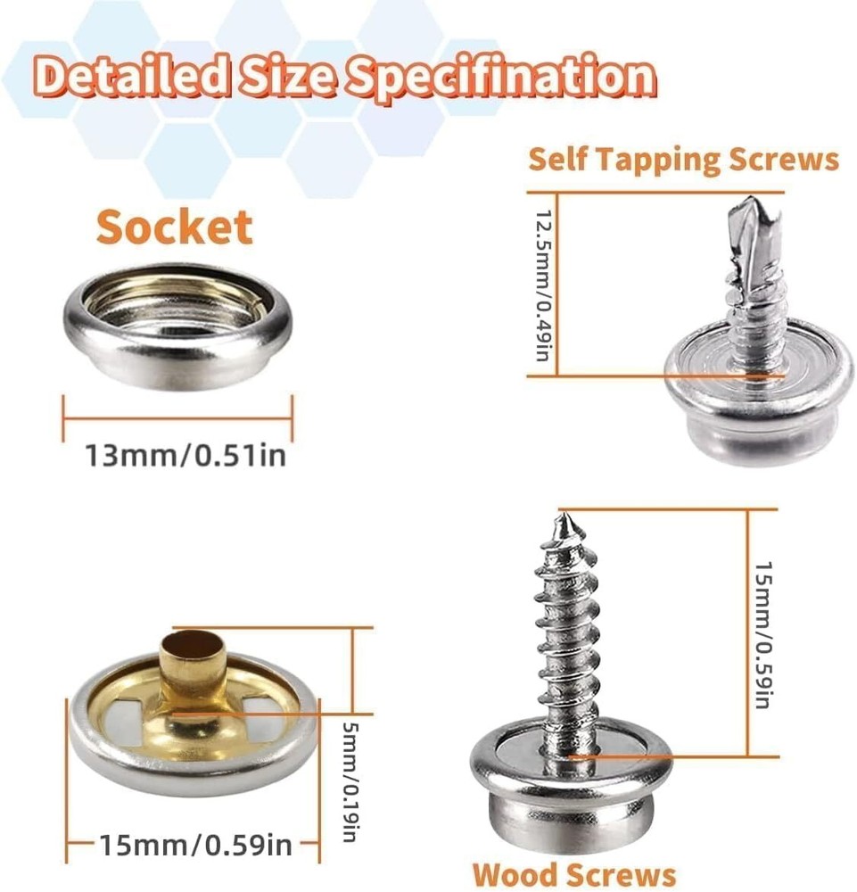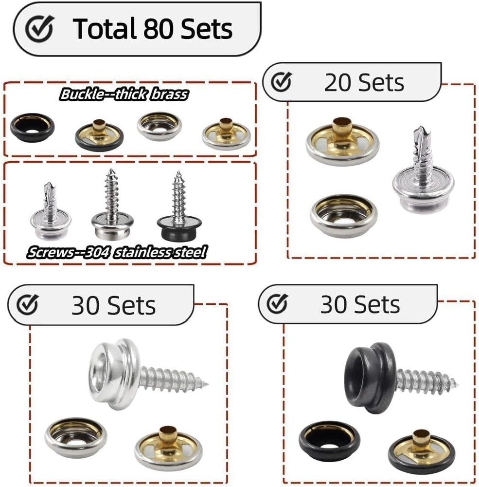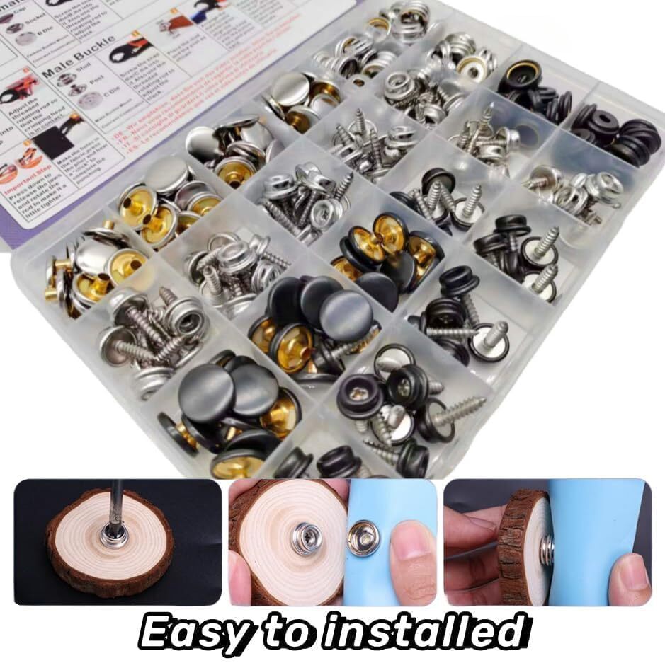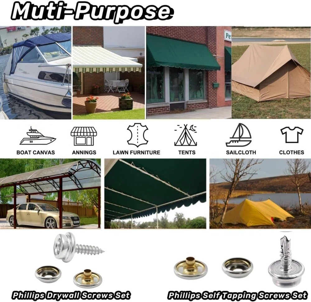 Canvas Snap Kit Heavy Duty Screw Snap Fastener Tool 80 Sets Metal Screw Snaps... Snap Button Kit Packaging: Includes 2 colors and 2 styles of screw snaps, total 80 sets, and one pliers tools, a manual. There are 80pcs caps, 80pcs sockets, 80pcs screws. separately stored In a clear plastic box for convenience In storage and use. Two types of screws: Phillips drywall screws and Phillips self-tapping screws, you can choose according to your needs. The screws are all made of #304 stainless steel, which is really hard and practical, and can fit tightly with the wall and other objects without loosening. High-Quality Material: Heavy Duty Snaps are made of #62 brass, the screw part is made of #304 stainless steel, It has excellent rust prevention and oxidation resistance while ensuring the hardness of the button.Snap fastener Remain Excellent Retention After Years Of Use. Fit for various environments for long-time usage. Product Specification: Each set of buttons consists of 3 parts: cap, socket, phillips screw. The diameter of cap is approx. 15mm/0.59 inch, Phillips Drywall Screw length is 15mm/0.59 inch,Phillips Self Tapping Screw length is 12.5mm/0.49 inch. Versatile Application: The canvas Snaps Button Screws are widely used for boat covers, canvas, tarps, tents, awnings, furniture and etc. Fit for both indoor and outdoor use. Perfect for DIY. Easy to operate: The newly upgraded tool includes 3 dies that you can use to easily complete punching holes and installing snap buttons. And it is easy to carry. Adjustable pliers design enables greater leverage that it crimp the cap and the socket together more easily. Now it's time to say goodbye to the traditional hand-knock installation snap. NOTE: The stud is ONLY 5mm/0.2 inch deep. So the fastener part is not suitable for leathers and fabrics over 2mm. Shipping We offer FREE shipping on all orders! We ship within Three business days of payment, usually sooner. Local pickups and combined shipping options are not provided at this time. Return You can return a product for up to 30 days from the date you purchased it. Any product you return must be in the same condition you received it and in the original packaging. Please keep the receipt. Payment We accept payment by any of the following methods: PayPal Please pay as soon as possible after winning an auction, as that will allow us to post your item to you sooner! Feedback Customer satisfaction is very important to us. If you have any problem with your order, please contact us and we will do our best to make you satisfied. Contact Us If you have any queries, please contact us via ebay. We usually respond within 24 hours on weekdays. Please visit our eBay store to check out other items for sale! Thank you for shopping at our store.