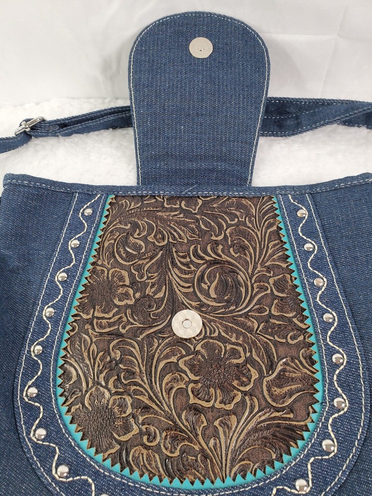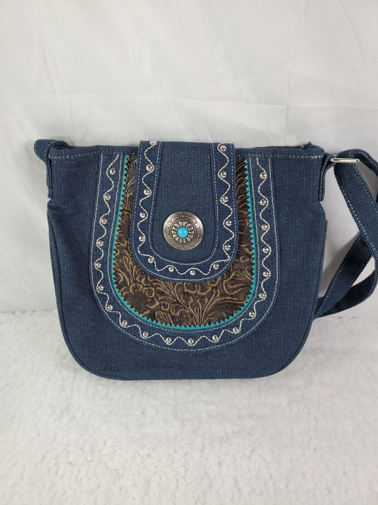 Elevate your accessory collection with the Canyon Sky Women's Denim Crossbody Bag, a versatile and stylish addition tailored for those who appreciate a blend of convenience and fashion. Boasting a semi-circle shape and a medium size of 10"x9"x8" inches, this bag offers ample space for your essentials without the bulk. The exterior features a classic blue denim fabric with studded accents, complemented by a functional bandana pattern, and a durable crossbody strap in a matching hue. The bag's interior is lined with a black fabric that ensures your items stay secure and dust-free, while the mix of silver, blue, and brown aluminum hardware adds a touch of rustic charm. With a mix of magnetic and zip closures, your belongings are kept safe and organized. Whether you're out for a casual day, traveling, or need a compact accessory for workwear, this Canyon Sky crossbody bag meets the mark for style and practicality.