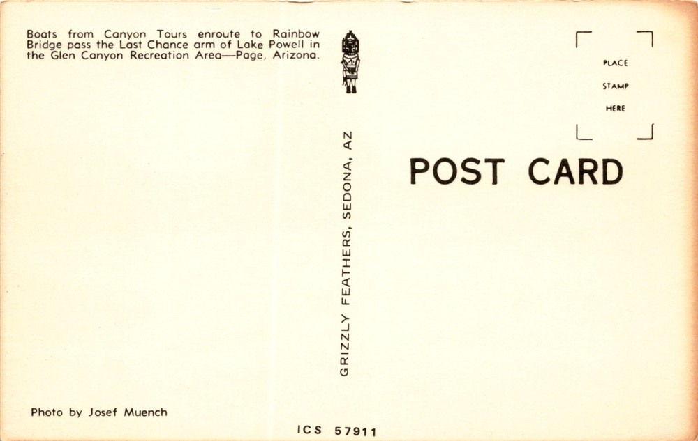 MAKE AN OFFER. THE MORE YOU BUY THE BETTER DEAL I WILL ACCEPT The postcard features a photo by Josef Muench showing boats from Canyon Tours on their way to Rainbow Bridge passing through the Last Chance arm of Lake Powell in the Glen Canyon Recreation Area near Page, Arizona. The image captures the scenic beauty of the area with the boats cruising on the lake surrounded by stunning rock formations.
