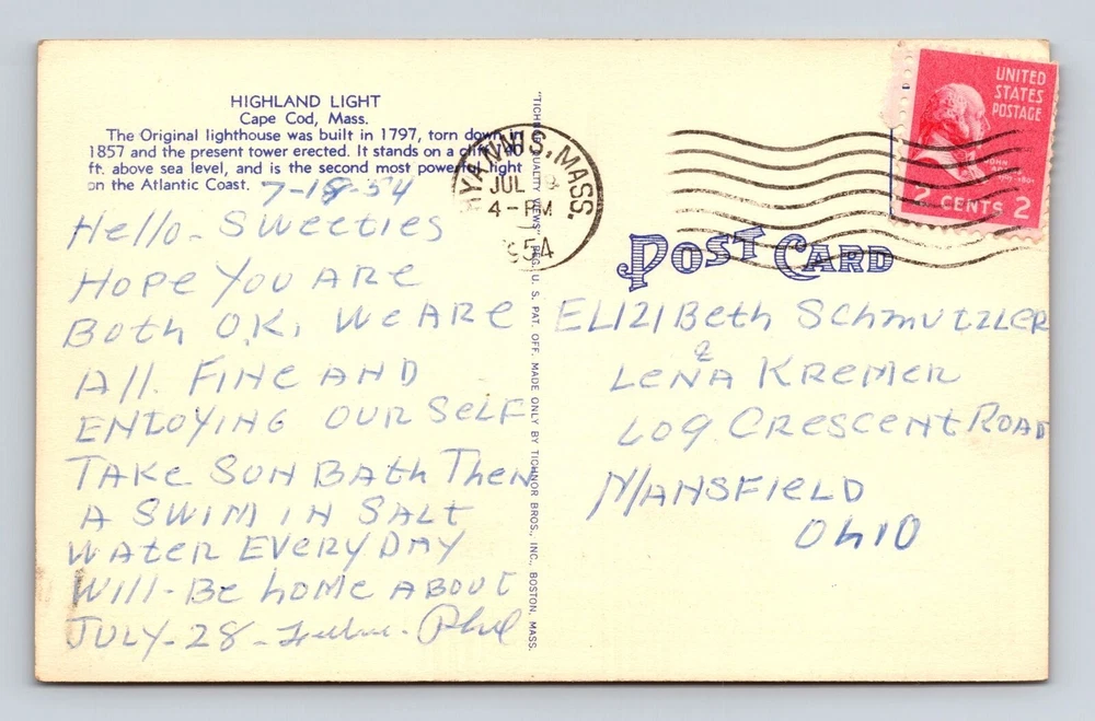 Cape Cod MA-Massachusetts, Highland Light, Lighthouse, Vintage c1954 Postcard