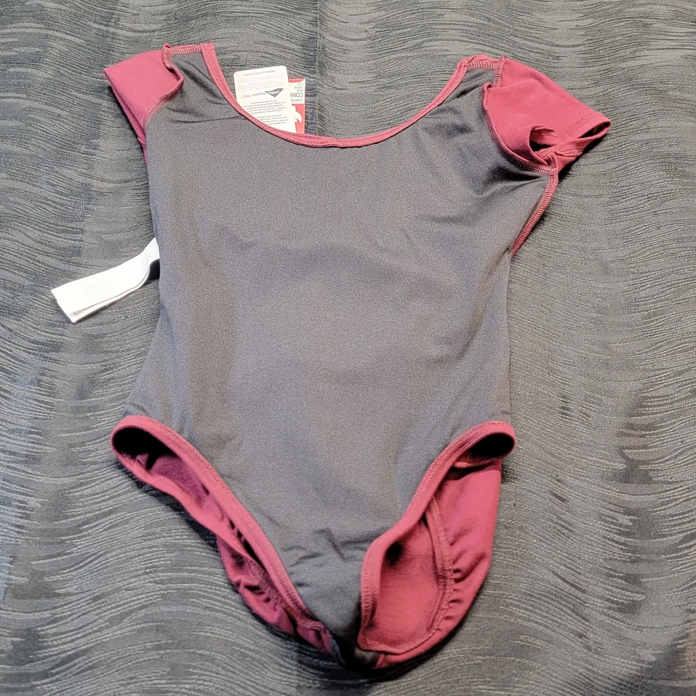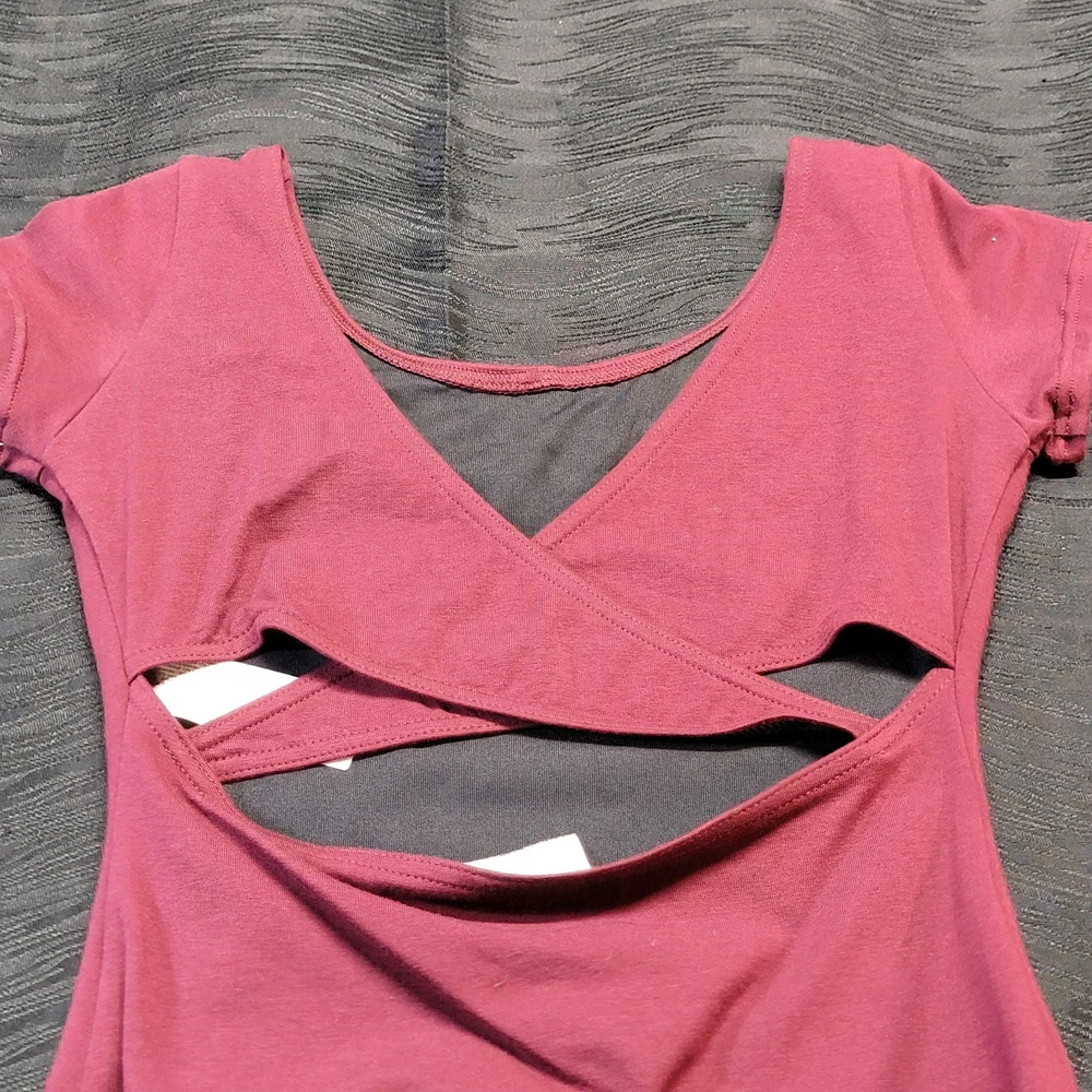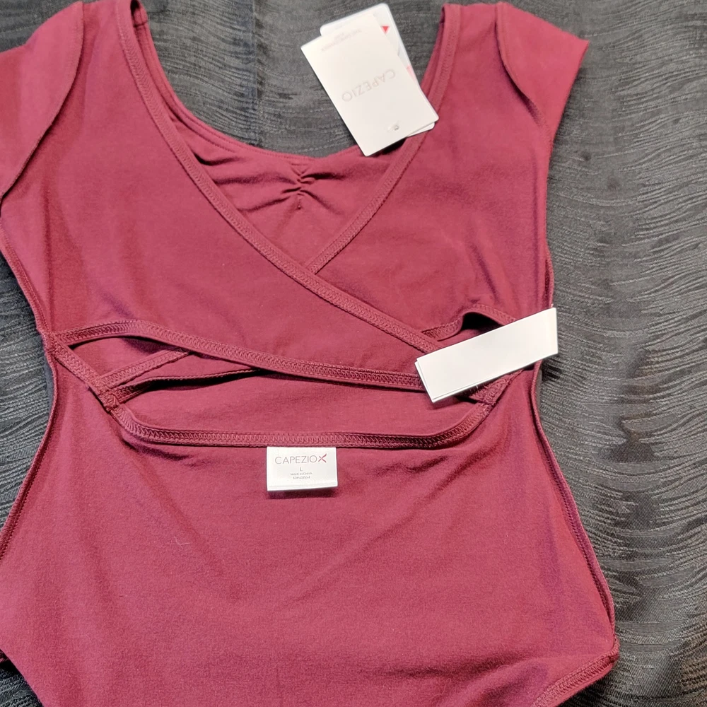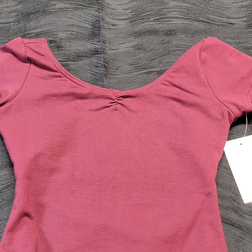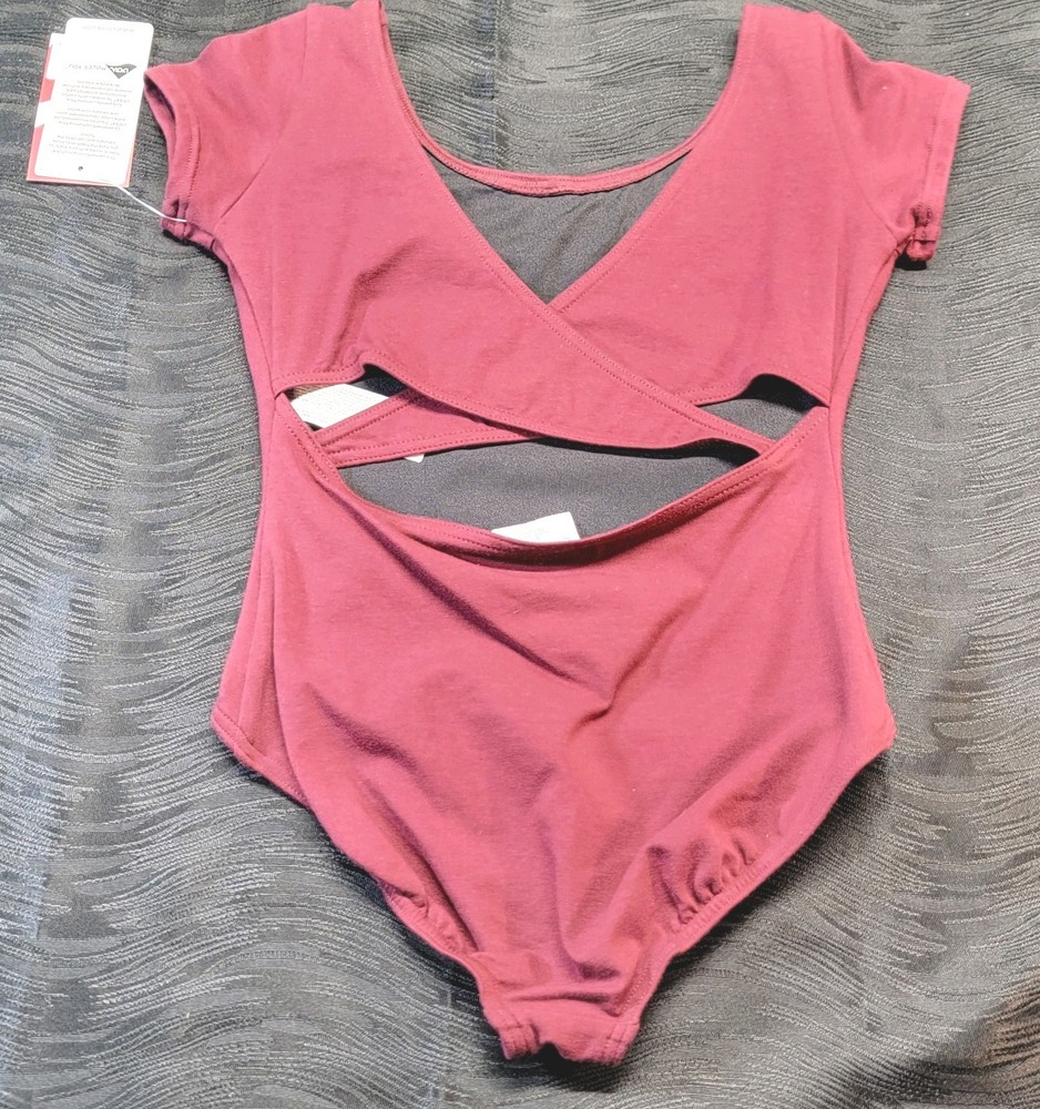 Capezio Short Sleeve Leotard Burgundy Scoop Front & Back Cross-over Back SZ. LC