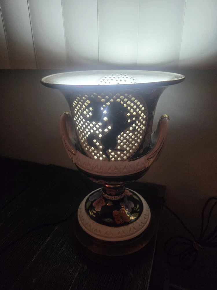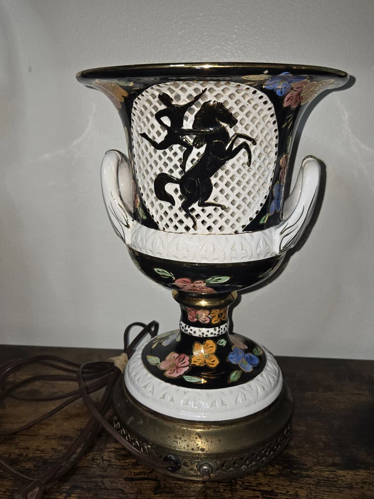 This exquisite table lamp is a stunning example of 1950s Italian design. The lamp features a beautiful painted porcelain base with a brass equestrian figure on top. The lamp diameter is 12 inches and it stands tall at [insert height]. The lamp is an original piece from Italy and is a true collector's item. The lamp is in excellent condition and is perfect for adding a touch of elegance to any room. The style is Italian and the lamp is a great example of Capodimonte craftsmanship. The lamp is made of high-quality materials including porcelain and brass. The lamp is a perfect addition to any collection and is sure to impress guests. Has signs of wear as it's 75 years old.