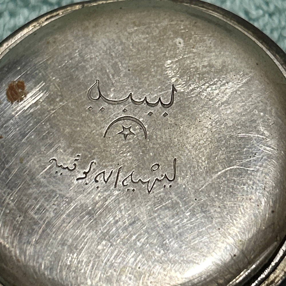 Captains Dual Time Zone Antique Pocket Watch. Working. Silver Case. Arabic Market. EL&B case marked with lion and .800 silver. Real nice dial. Case is excellent except for a side dent that I planned to work out when I serviced. About a size 14. Case is about 58 mm.It’s a beautiful piece of history. Could use a cleaning. Everything works as it should. Please look at the photos and please check my other listing