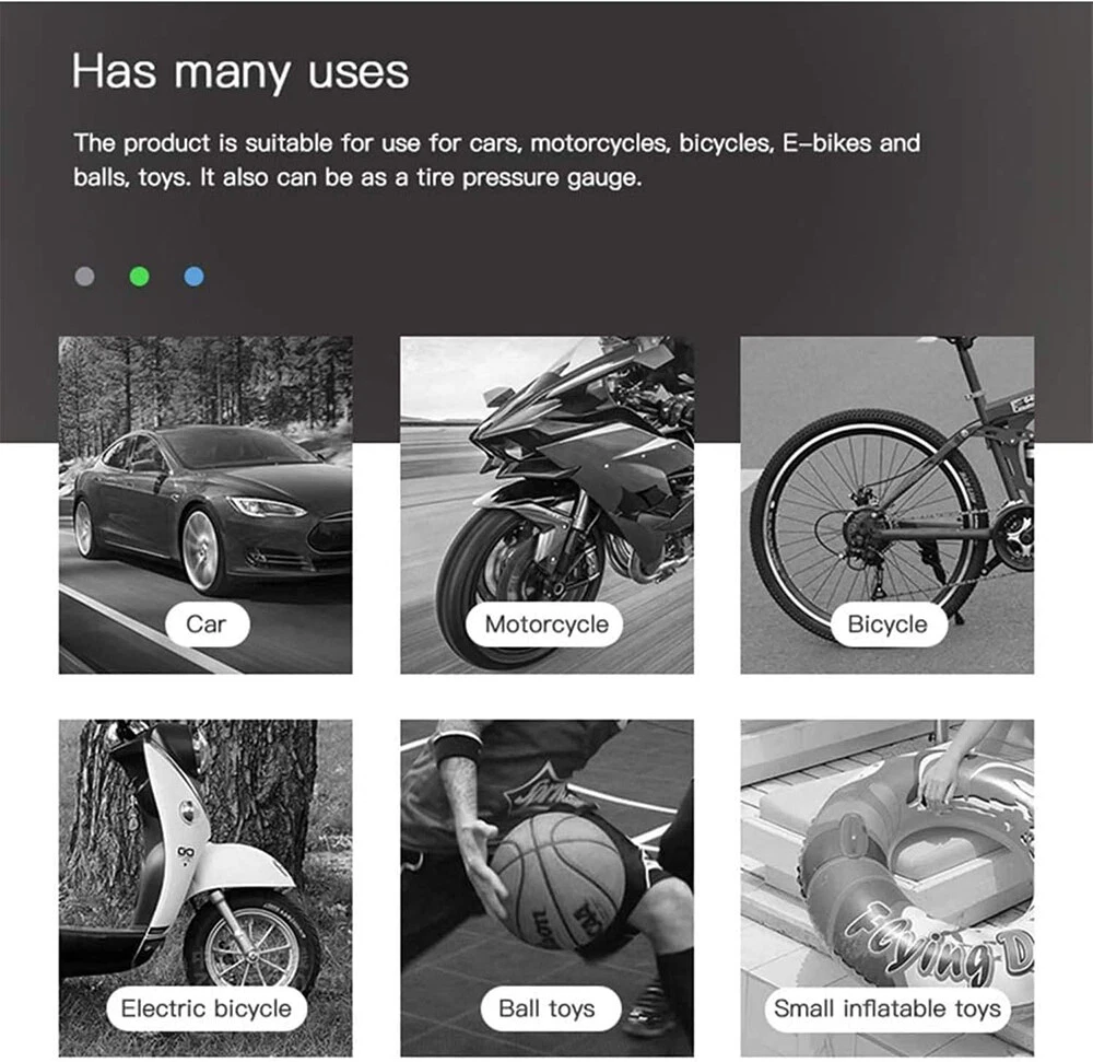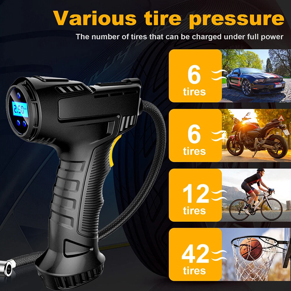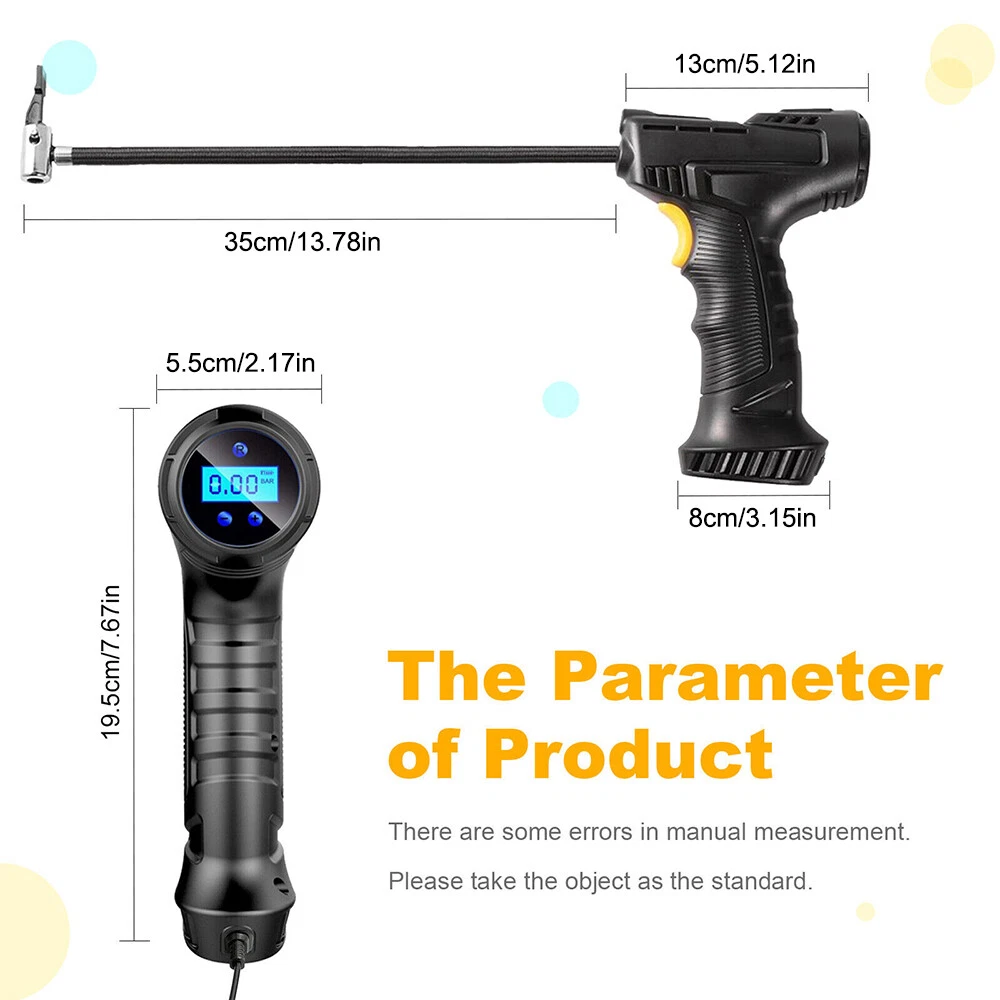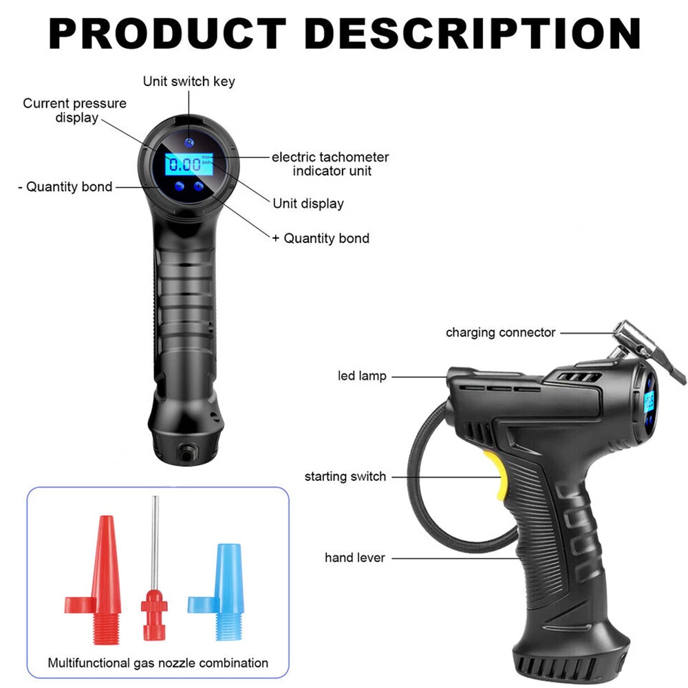 Car Air Tire Pump Inflator Compressor LED Digital Electric Portable 150PSI 12V Overview: What people may not realize is that a tire inflator can be a life saver. If you’re stranded in the middle of a snow storm and have a flat tire with no way to call for help, this 12v portable air compressor can inflate that tire and get you back on your way within minutes. You can set the pressure value manually between 0-150PSI and it will stop working automatically after reaching the set value. The 9.8ft charging cord can easily reach all tires easily. It’s not limited to car tire inflation, but also applied to bicycles, motorbikes, pools, balls, and so on. Features: Easy To Use & Auto Shut Off:First,start the car. Insert the cigarette plug into the socket and connect the inflation nozzle to the tire. Finally set the pressure and switch it on to start inflating. It will automatically power off after reaching the set value. 150PSI Max Working Pressure:With a maximum pressure of 150PSI and air flow of 20L/min,it can fully inflate a flat tire within 10mins. No need to worry about frequent cooling down with continuous working time reaching up to 22mins. The faster the tire inflator is,the faster you’ll be on the road. Digital Display & LED Lighting:Equipped with a high-brightness and high-precision display screen,you can easily check the tire pressure and pre-set the pressure value. The LED lighting makes operation more convenient in darkness. Portable & Convenient:With a size of 7.7x5x2in,it will not take up too much space when not in use. The 9.8ft charging cord can easily inflate all tires,making inflation more convenient. Multi-functional:Equipped with 3 air nozzles,it can also be applied to other inflation items,such as bicycle tires,balls,pools,mattresses,and so on. Note:Only suitable for suvs,cars,not for trucks,vans,or other oversize vehicles. Limited to DC 12V power supply. Specifications: Product Type: Portable Car Tire Inflator Working Voltage: DC12V Inflatable Flow: 20L/min Power: 120W Inflatable Tube: 36.5cm/14.4in Charging Cable Length: 3m/9.8ft Color: Black Material: ABS Maximum Pressure: 150PSI Inflation Time: 10Mins Continuous Work Time: 22Mins Item Size: 19.5x12.6x5cm/7.7x5x2in Item Weight: 420g Package Size: 16x21x6.5cm/6.3x8.3x2.6in Package Weight: 490g/1.1lbs Package Contents: 1 x Portable Car Tire Inflator 3x Air Nozzles 1x User Manual On Aug 7, 2024 at 21:54:05 PDT, seller added the following information: On Dec 8, 2024 at 23:49:36 PST, seller added the following information: