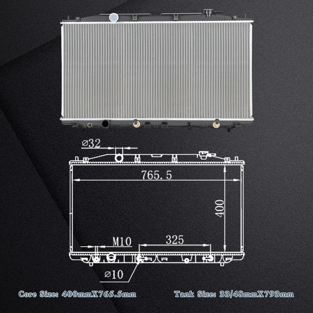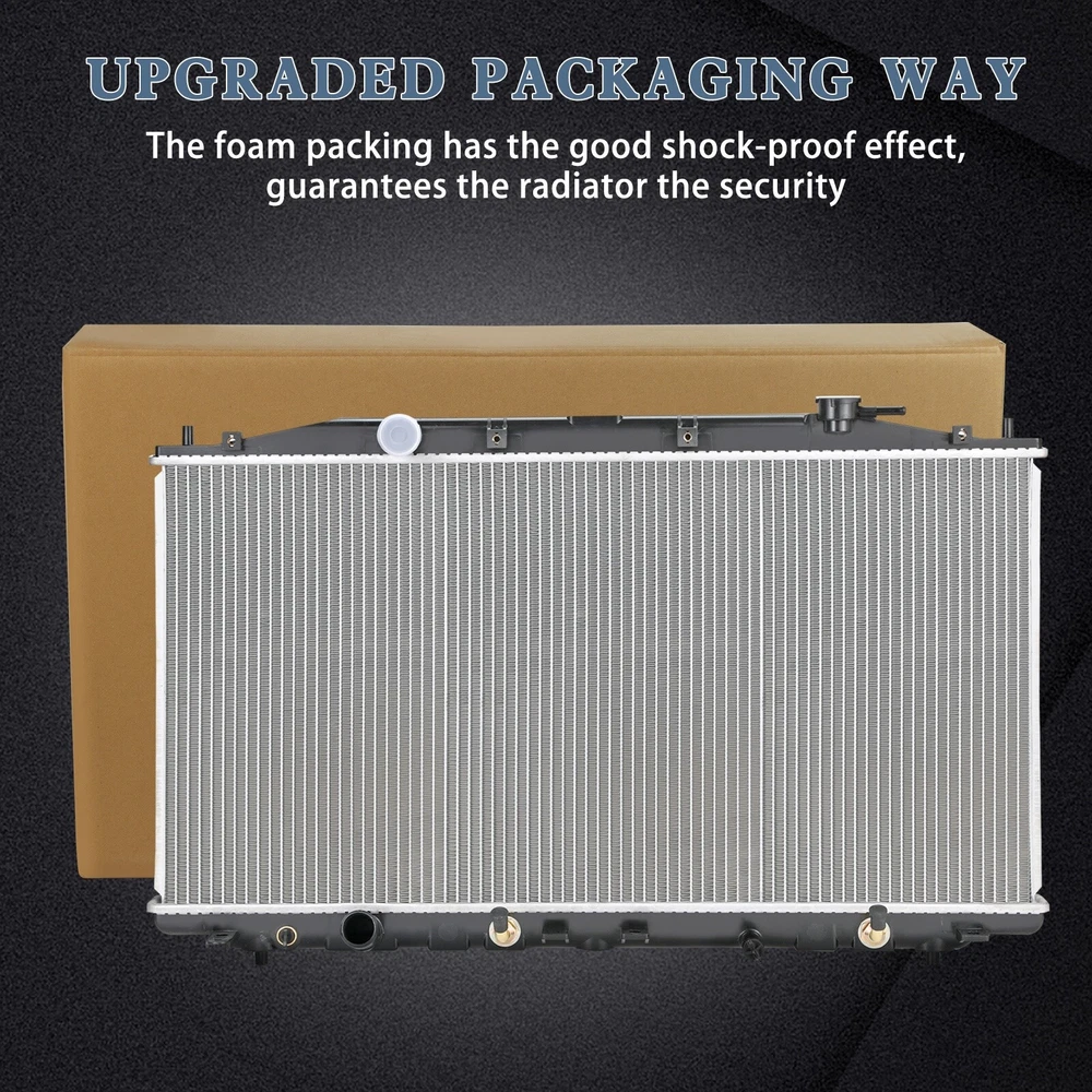 Fitment 2010-2012 Honda Accord 2.4L GAS 2008-2012 Honda Accord 2.4L GAS 2012-2015 Honda Crosstour 2.4L GAS Specification Inlet Diameter(inch): 1.26 Outlet Diameter(inch): 1.26 Package Weight(kg): 4.5 Package Size(inch):length×width×height: 33.46x5.71x22.24 Core Size(inch): 15.75x30.14x0.63 Interchange Part Number: 2990 Row Count: 1 Core Material: Aluminum Tank Material: Plastic Fitment Type: Direct Replacement Color: Silver Core, Black Tank Radiator Cap: No Style: Downflow Compatibility: A/T radiator, without radiator cap ISO Specification: ISO 16949 Features Perfect radiator direct replacing part for car engine cooling system. Radiator is really easy to get damaged during delivery. We have upgraded packaging (EPE foam and cardboard)to prevent aluminum fins, plastic water tank and fitting parts from damage. EPE foam helps fix radiators to reduce wobble. Regularly clean your radiator to prevent clogging that may lower cooling efficiency. Don't mix different brands of coolant. Before you start up your vehicle, please make sure there is coolant in the radiator. Highly recommended to check car cooling system of the whole vehicle before professional installation. We are willing to provide 1 Year warranty service. Highest grade plastic tanks with aluminum core - made to withstand rust and wear. Leak tested & Sealing tested, durable and long-lasting. Direct Bolt-on Replacement with No Additional Time. With plastic cover to prevent dust during delivery. Louvered core fins increase waterflow and accelerate heat transfer to keep your engine running cool. An aluminum core and durable plastic tank prevent rust and corrosion while also limiting weight and promoting longevity. Wider tube or dimpled tube surface increases contact surface area for more efficient cooling. Our radiator is suitable for standard vehicles, not for modified car/vehicles.