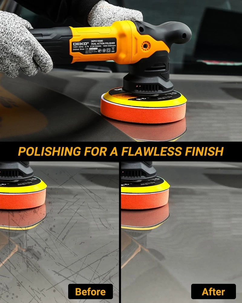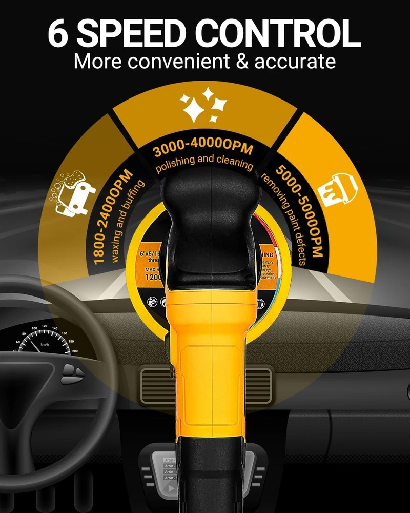 PRACTICAL BUFFER POLISHER: Dual action polisher for car detailing machine with constant speed and power control keeps polishing speed constant even under load 6 VARIABLE SPEED POLISHER: The car wax kit feature allows you to adjust the speed of the small electric waxer tools from 1800 to 5500 RPM according to your usage DUAL ACTION POLISHER MOTION: 6 Inch random orbital car polish kit is equipped with dual action motion, which ensures swirl-free and burn-free polishing results ERGONOMIC DESIGN: Our pulidora de autos is equipped with soft rubber side handles, ensuring non-slip control and comfortable operation WIDE APPLICATION: The hand tool rotary polisher includes 3 different foam buffing pads and 1 wool polishing pad, perfect for buffing and removing swirls, scratches, and stains from all painted vehicles